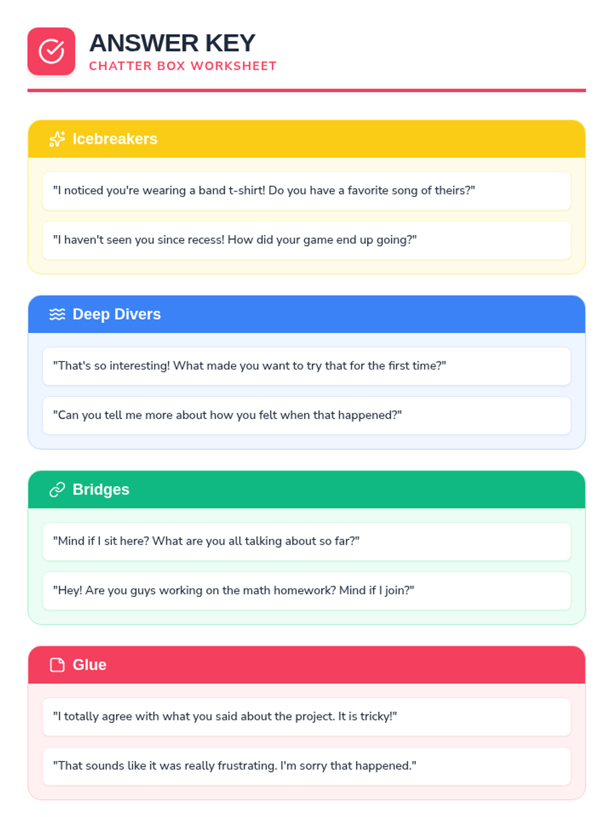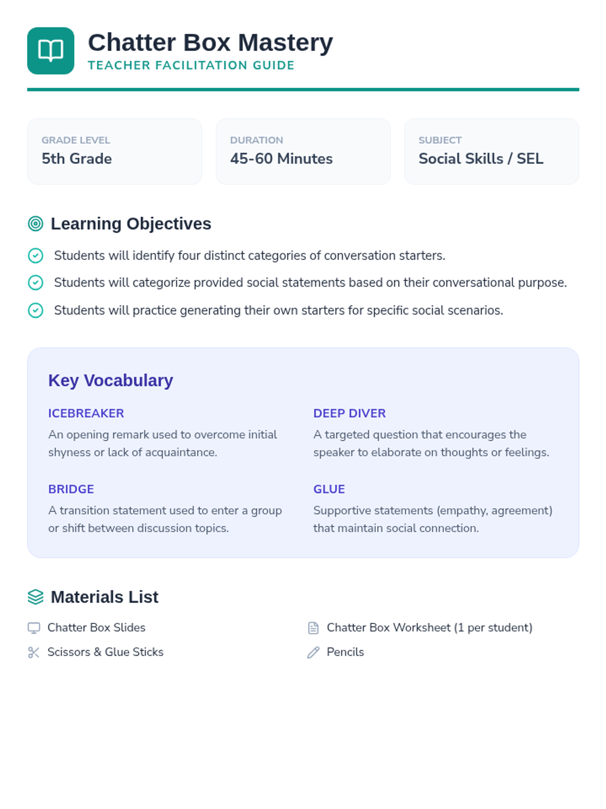 A lesson focused on identifying and using different types of conversation starters to build social confidence and connection. Students learn to categorize 'Icebreakers', 'Deep Divers', 'Bridges', and 'Glue' statements.