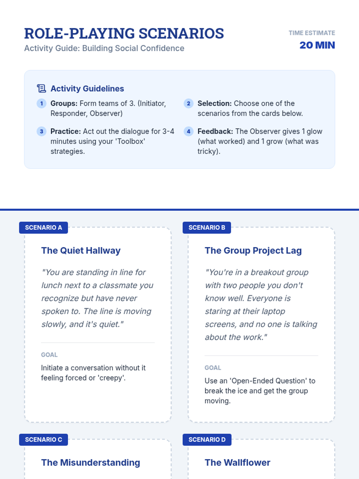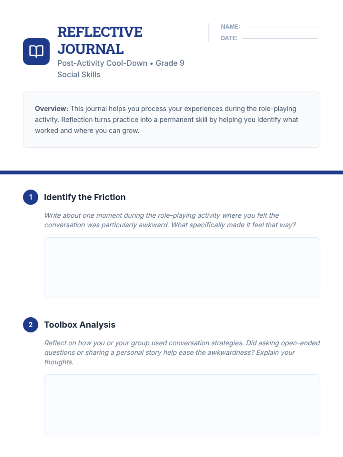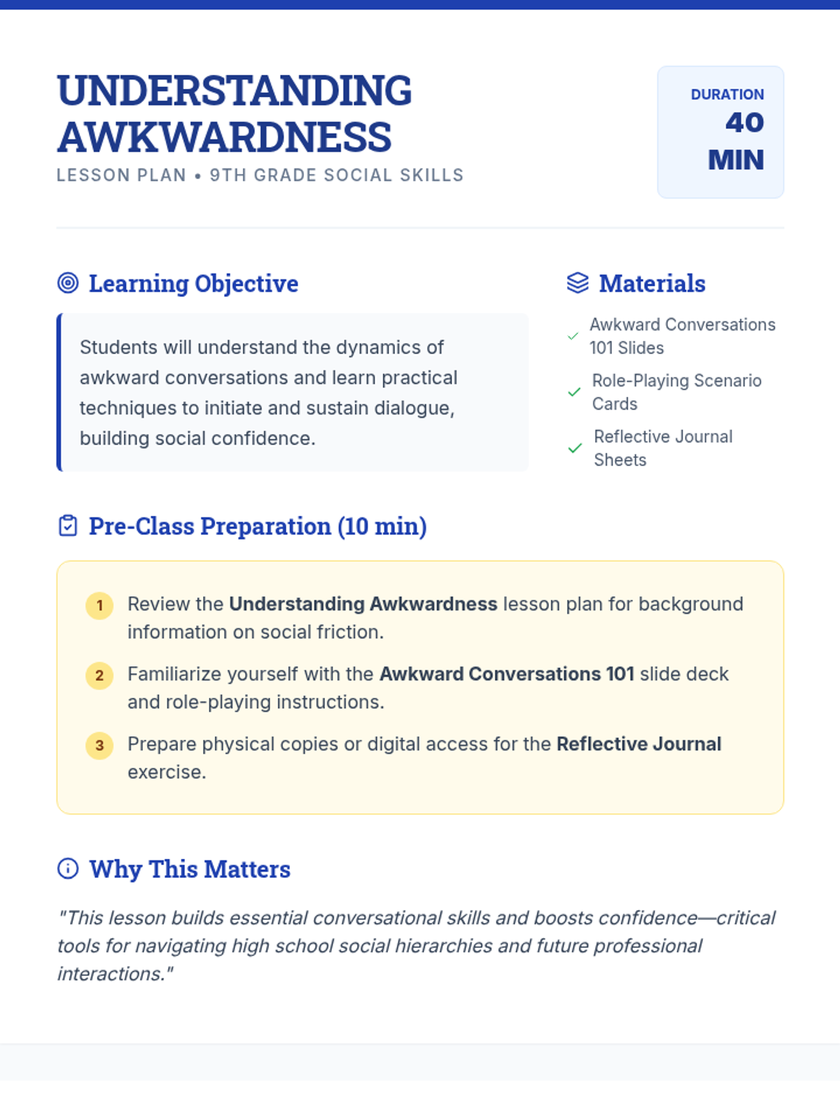 A 40-minute lesson for 9th graders exploring the psychology of awkwardness and practical strategies for initiating and sustaining conversations through role-playing and reflection.