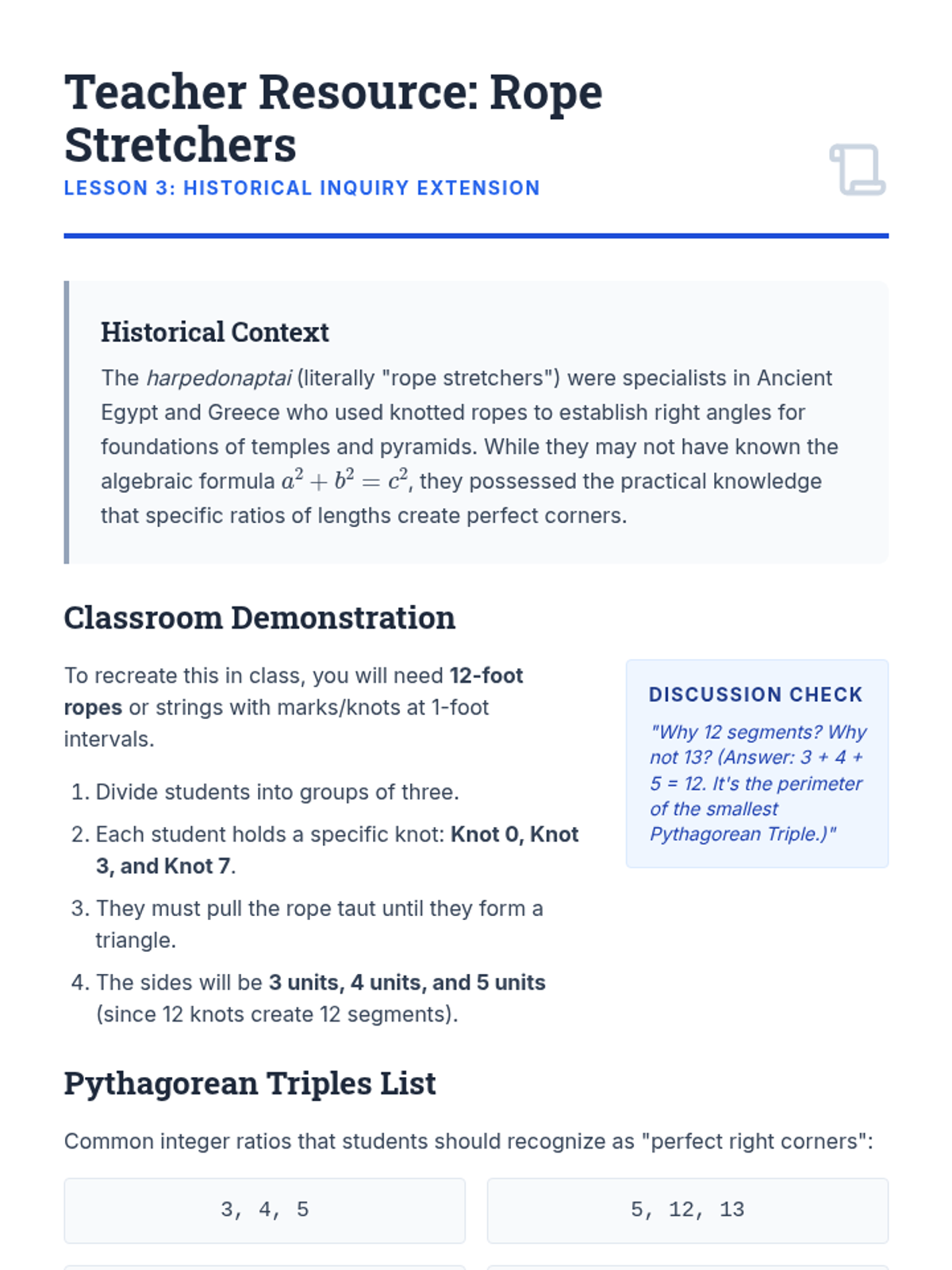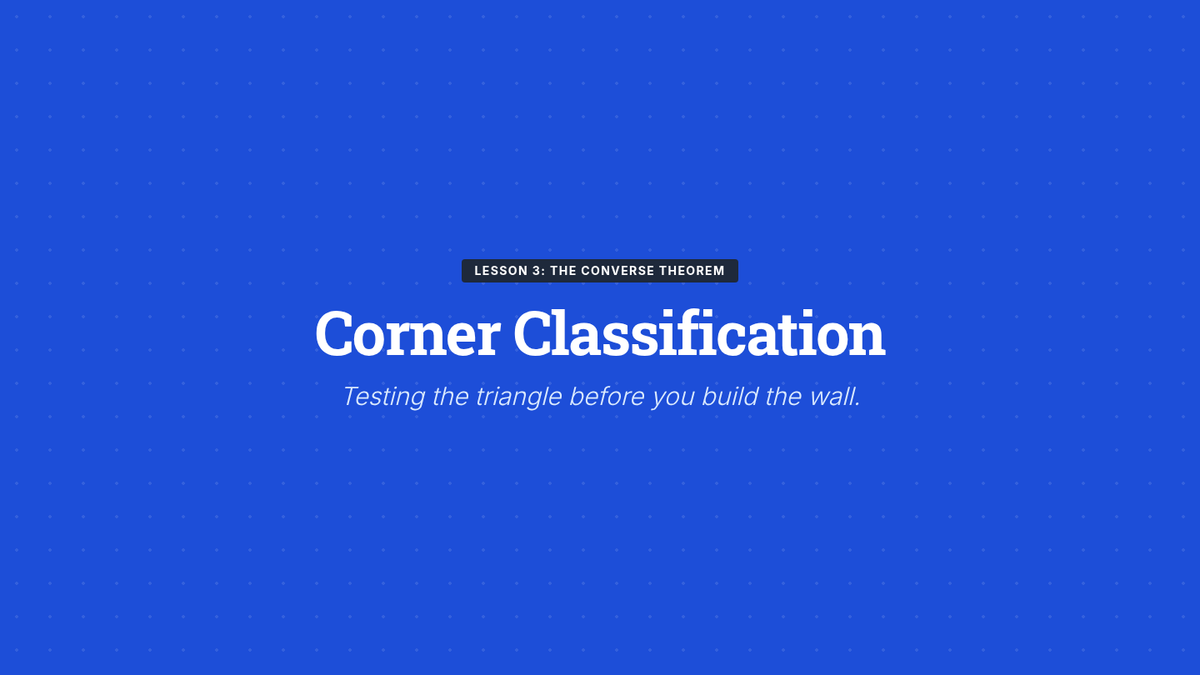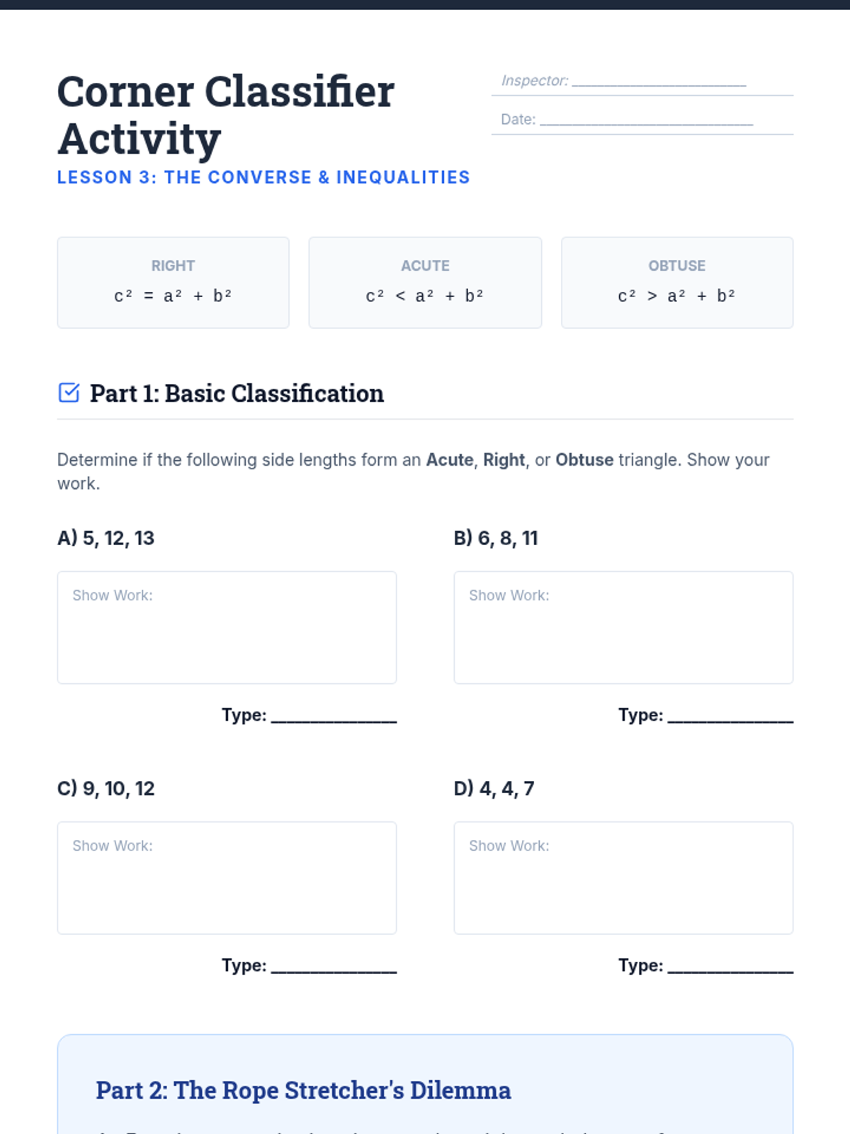 Students explore the Converse of the Pythagorean Theorem to determine if a set of three side lengths forms a right, acute, or obtuse triangle. Through testing various sets of numbers, students formulate rules for inequalities: c² > a² + b² (obtuse) and c² < a² + b² (acute).