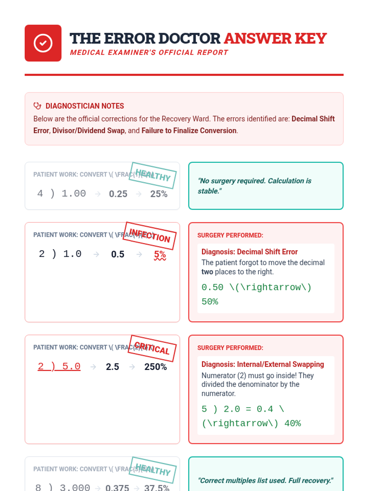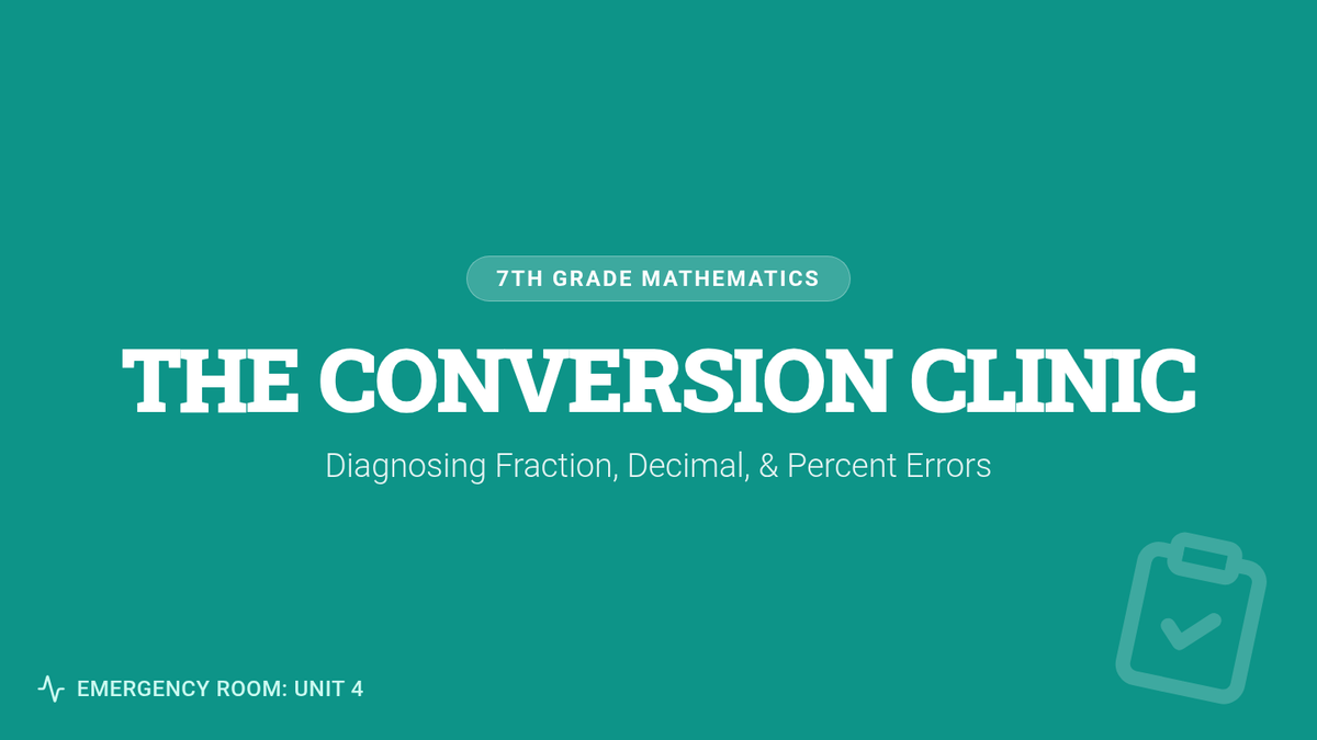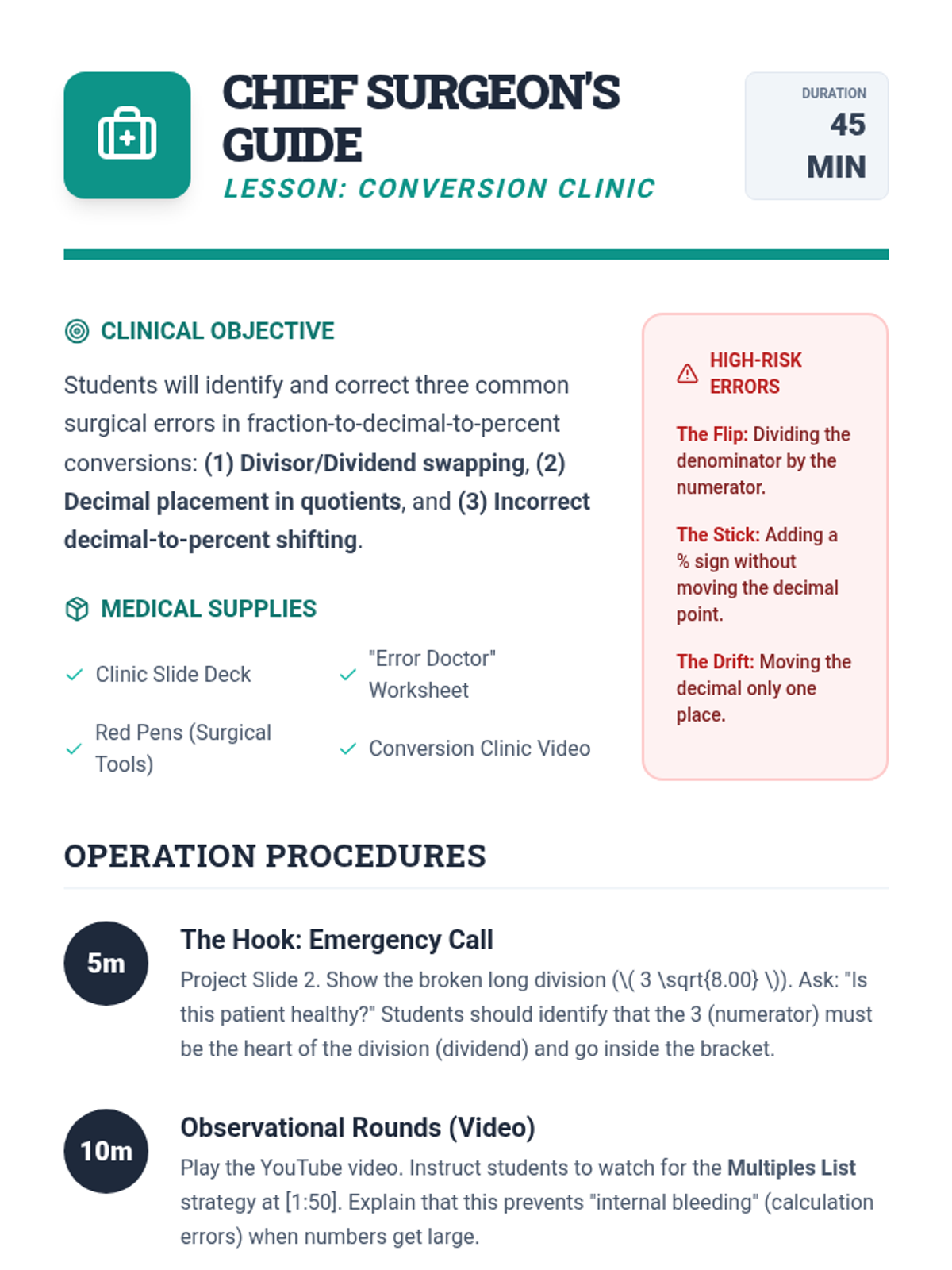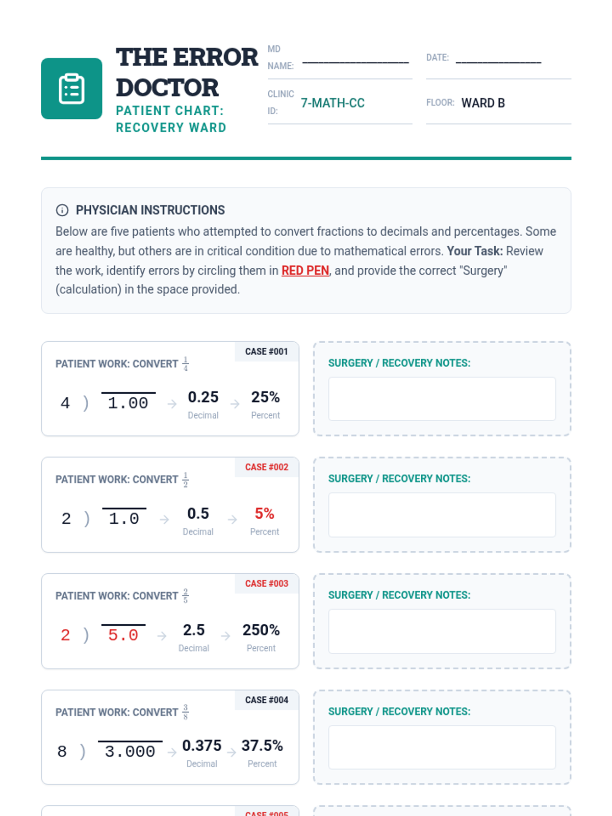 A specialized lesson where students act as 'Error Doctors' to diagnose and treat common misconceptions in fraction, decimal, and percent conversions using a medical-themed clinic approach.