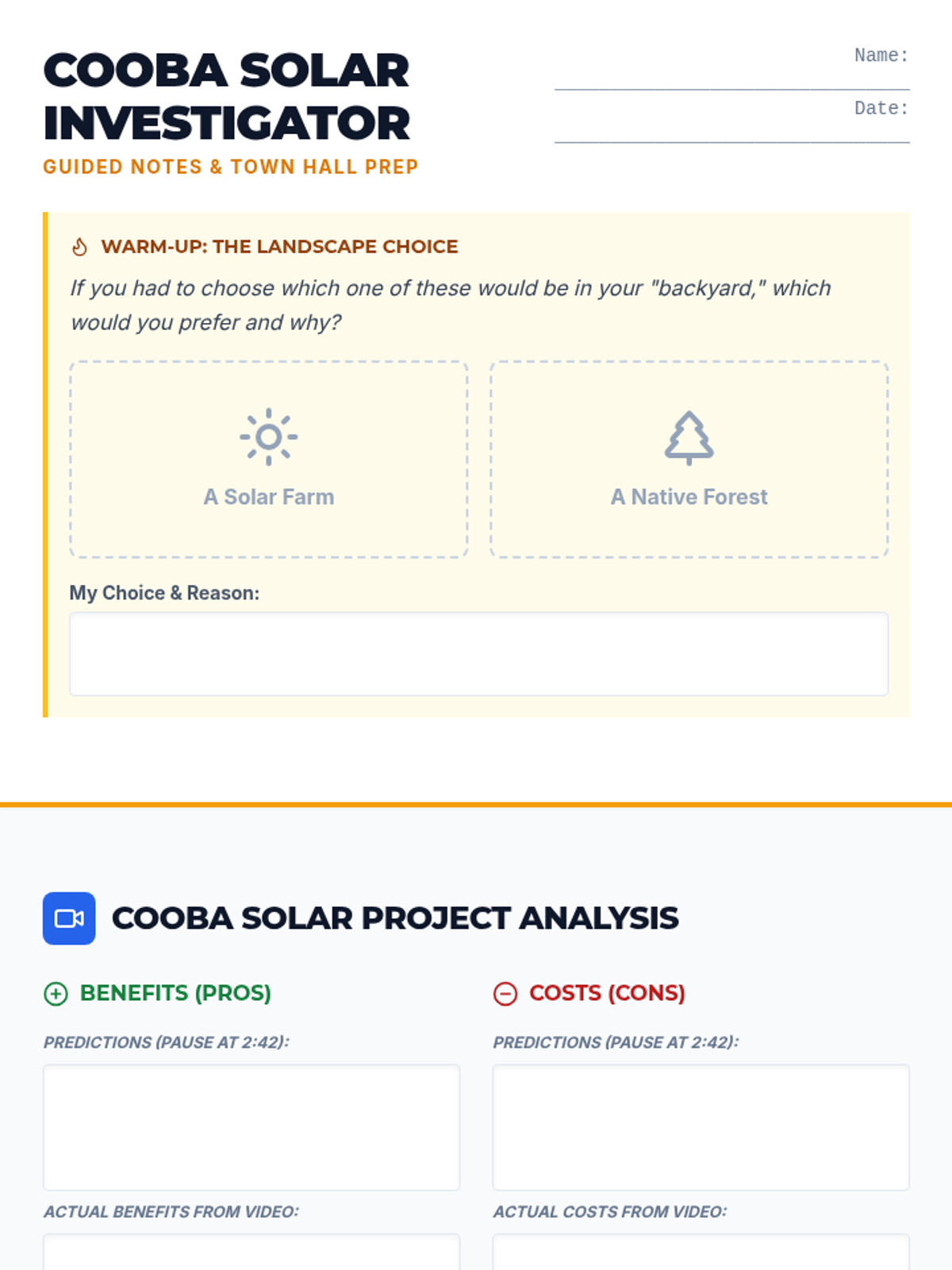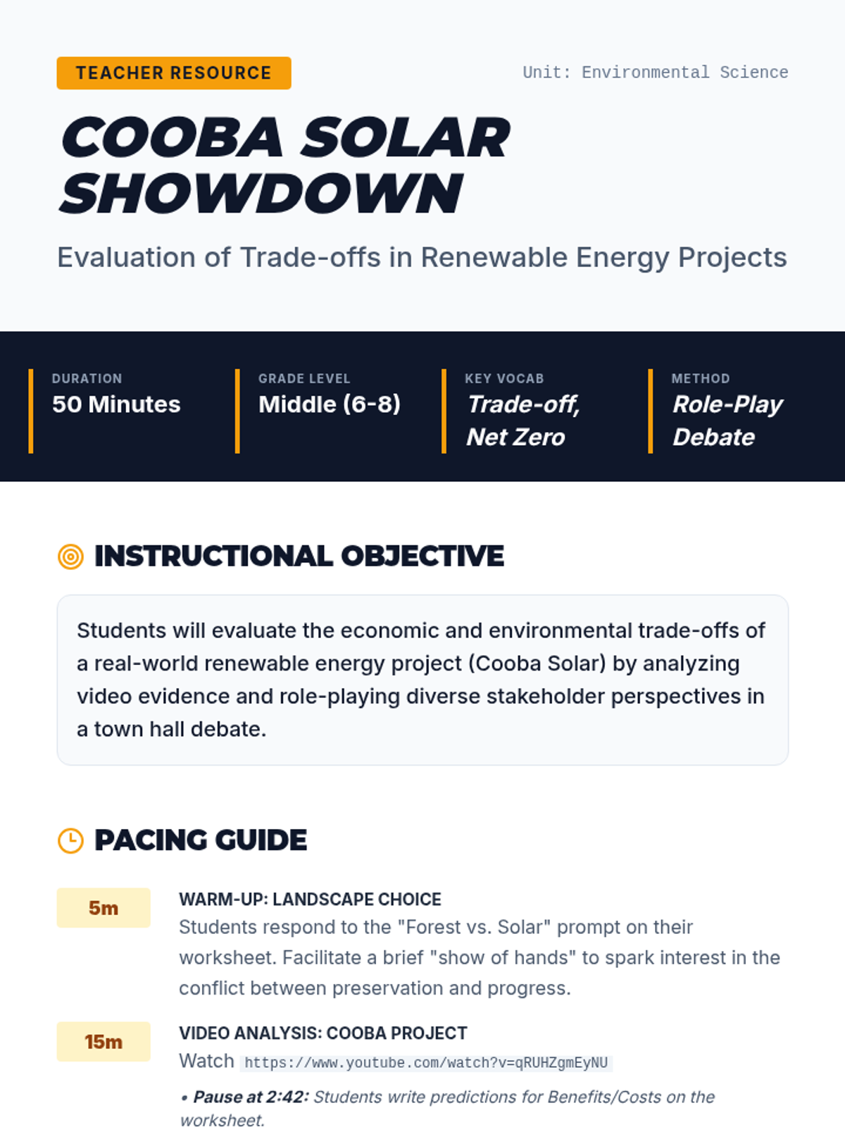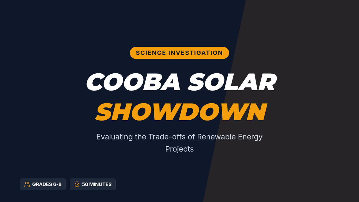 A middle school science lesson where students evaluate the trade-offs of the Cooba Solar Project through video analysis and a stakeholder town hall role-play. Students weigh economic and environmental factors to decide the project's future.