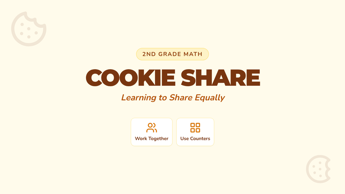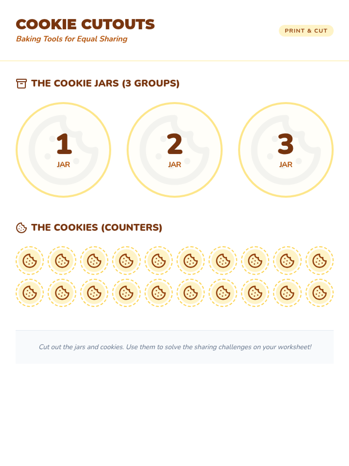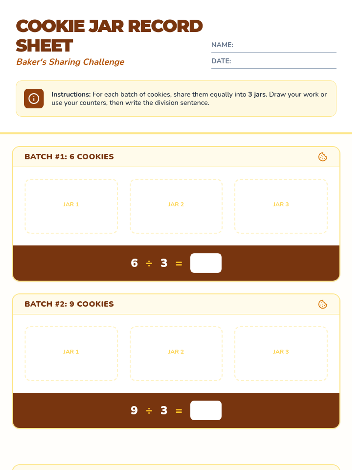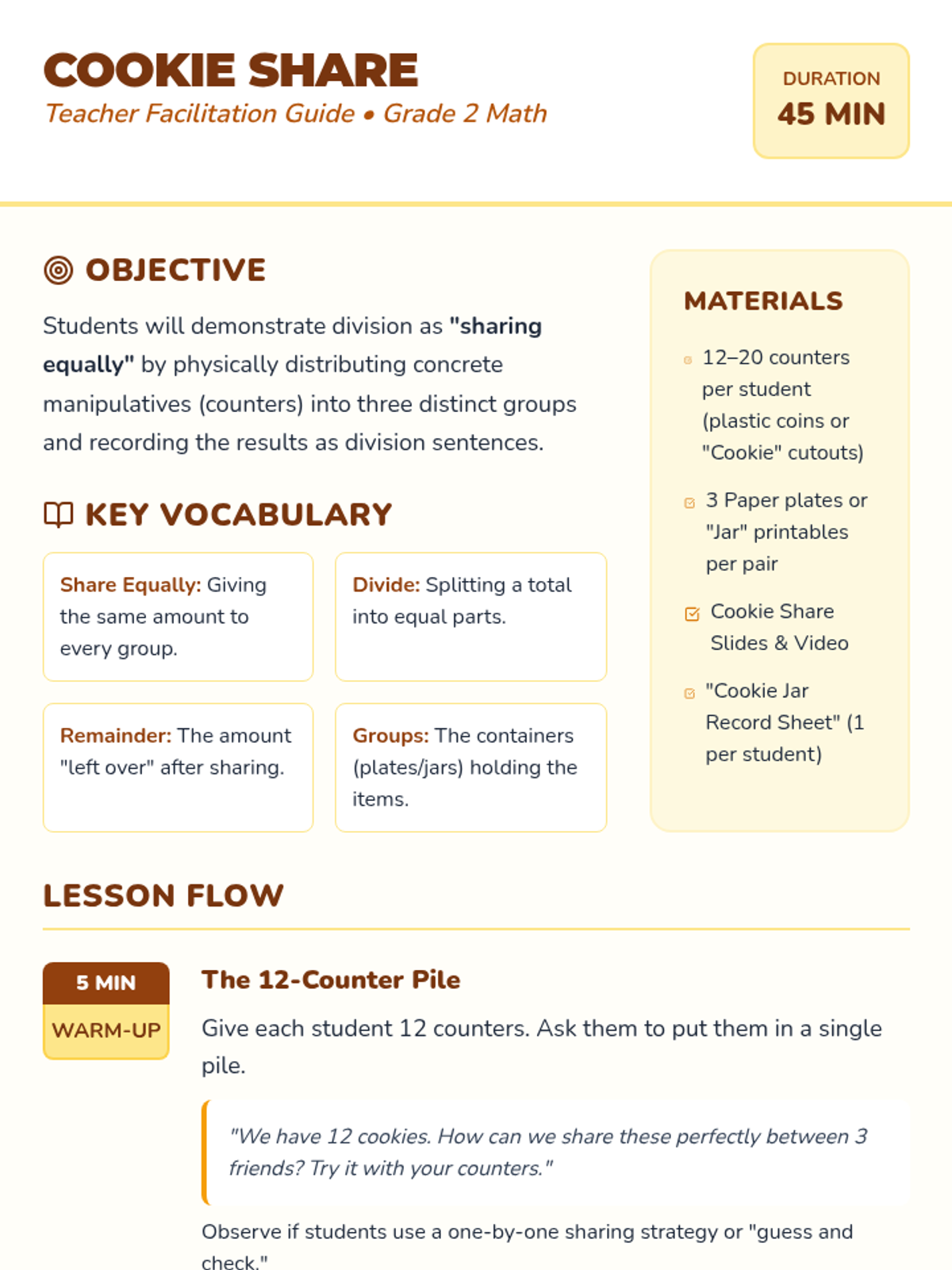 A 2nd-grade introduction to division as equal sharing. Students use 'cookies' (counters) and 'jars' (plates) to physically distribute quantities into three equal groups, supported by a video demonstration and hands-on recording.