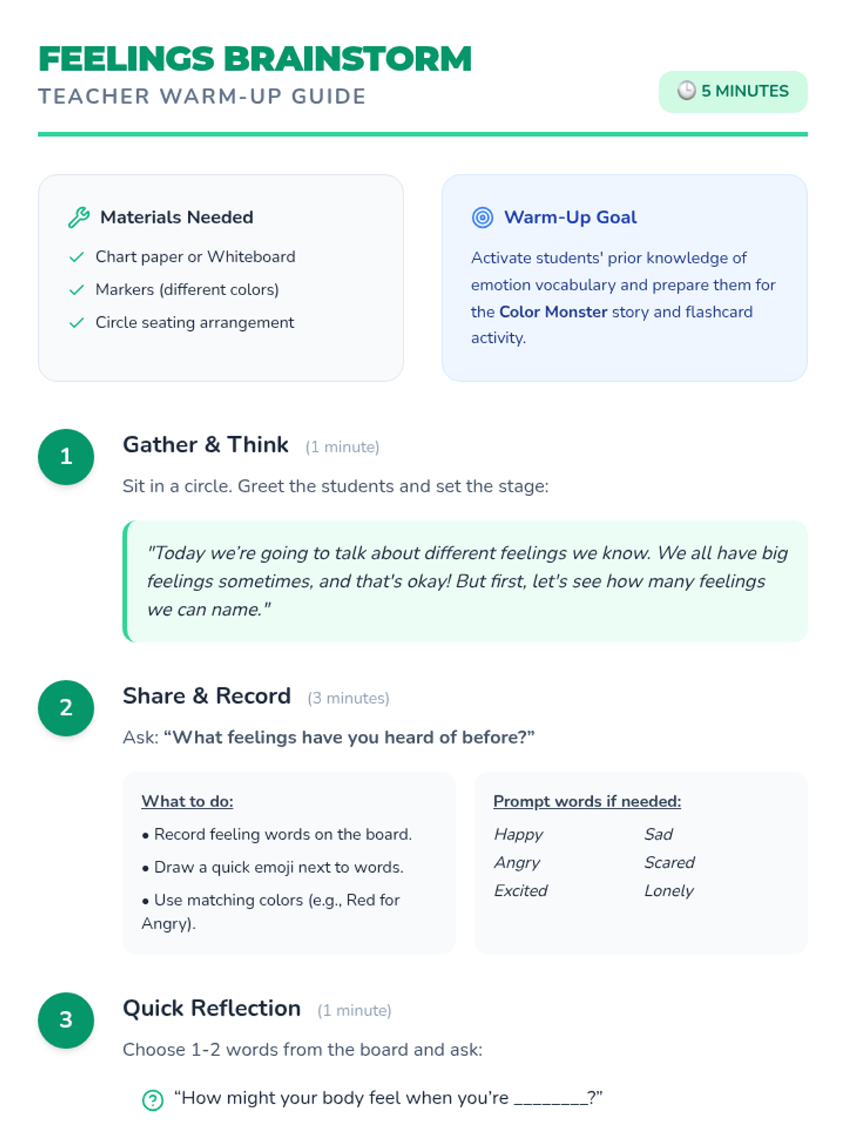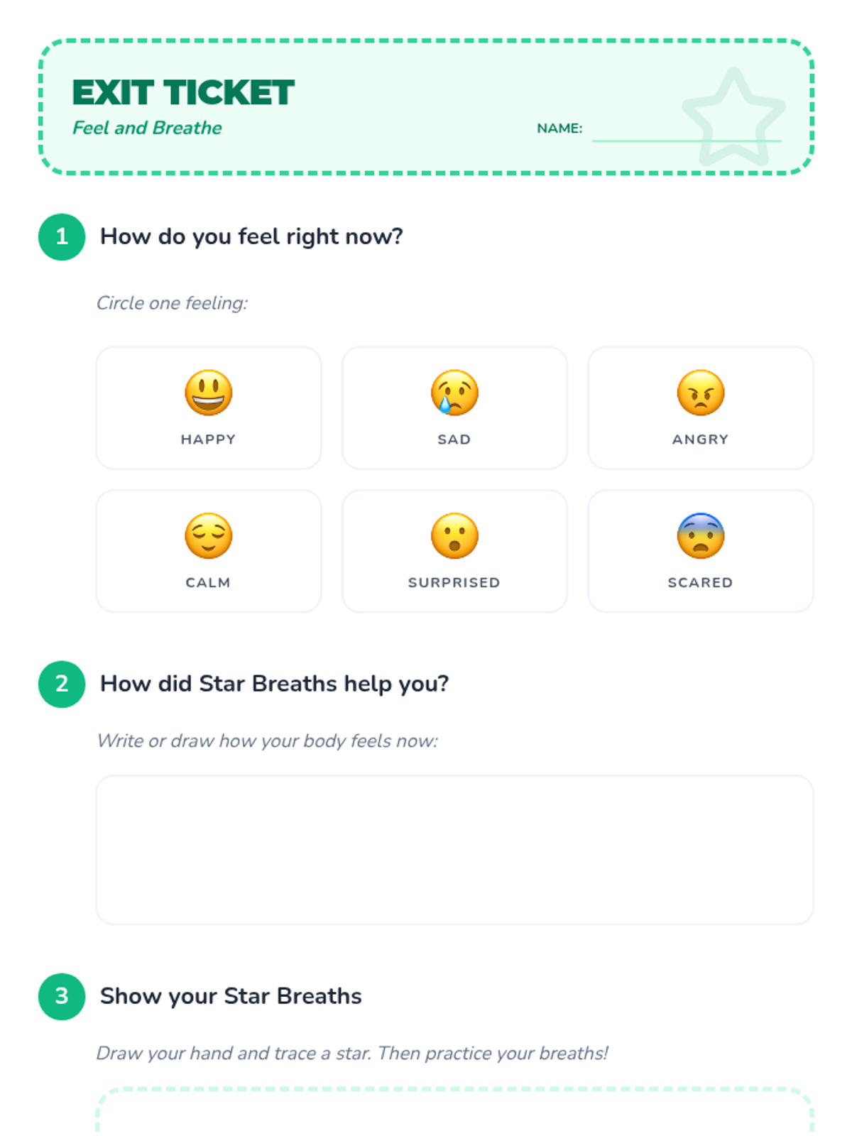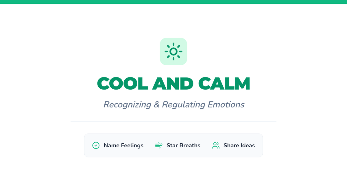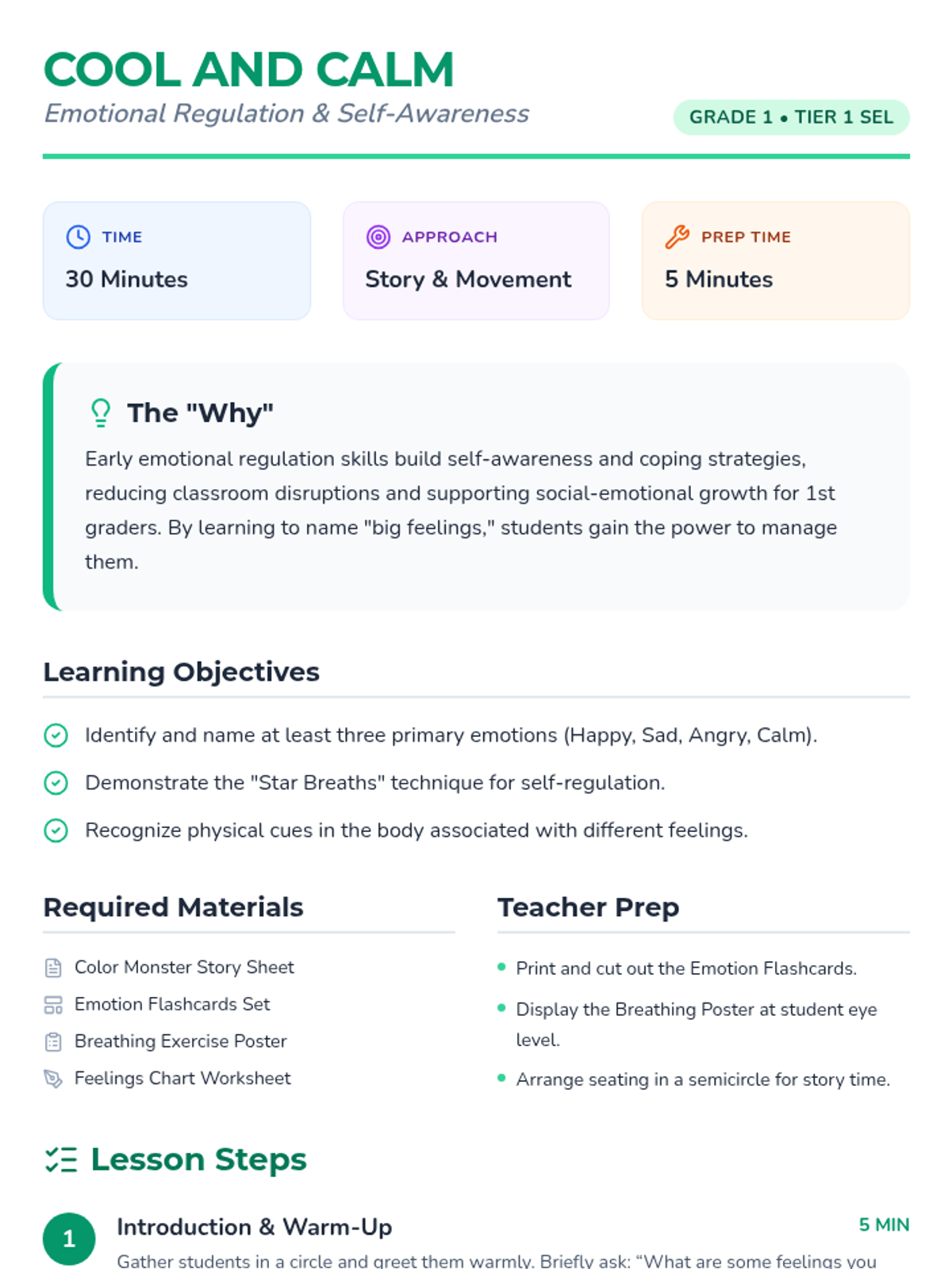 A 30-minute Tier 1 SEL lesson for 1st graders focusing on identifying emotions and practicing 'Star Breaths' for regulation. Students engage with stories, games, and tactile breathing exercises.