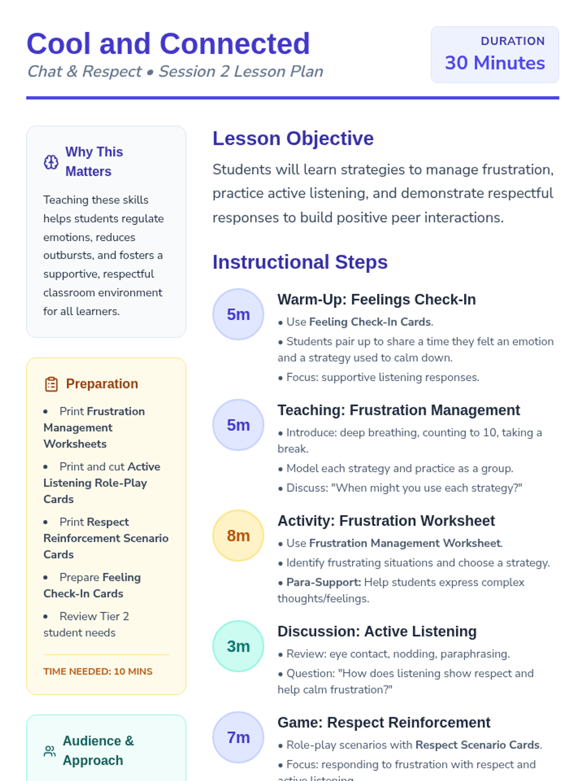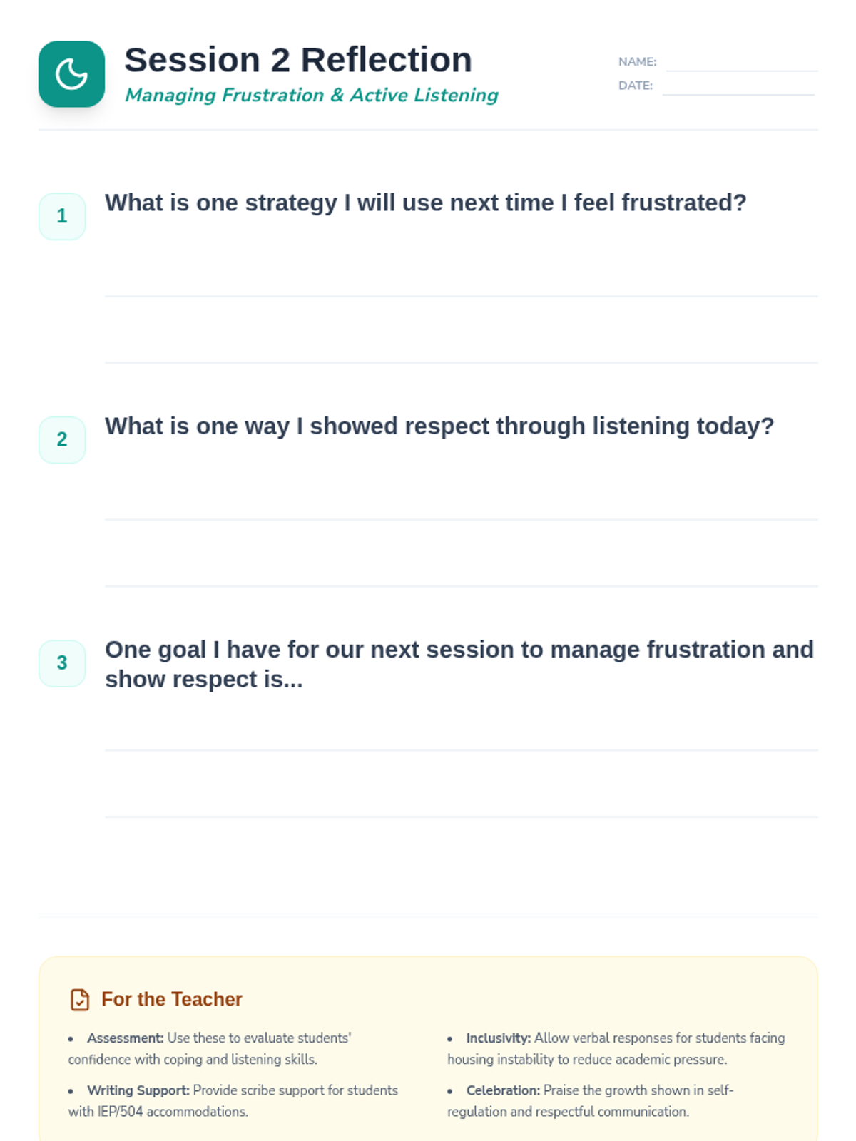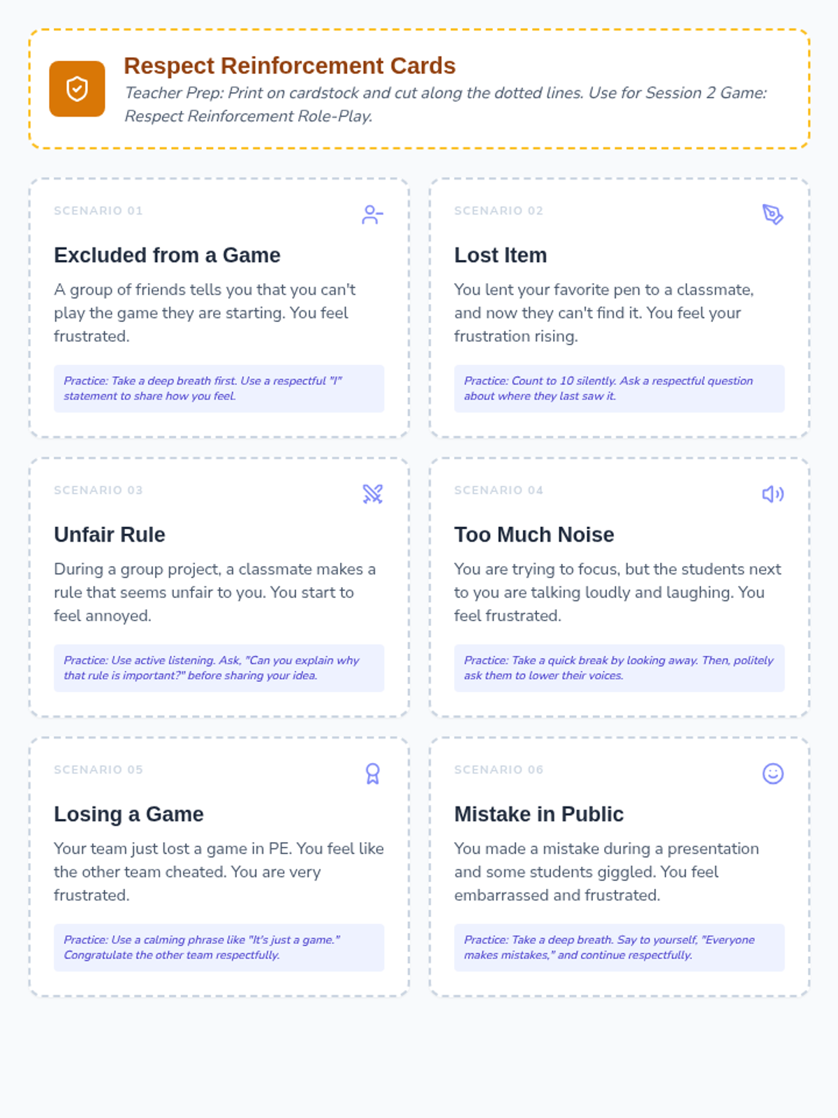 Students practice active listening and frustration management strategies to maintain respectful peer relationships.
