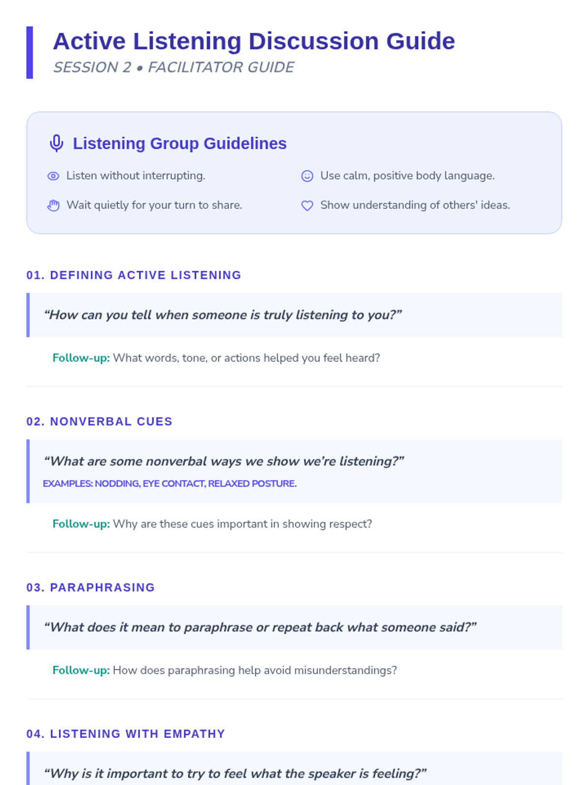 Developing advanced listening skills, including paraphrasing and validating others' perspectives in English.