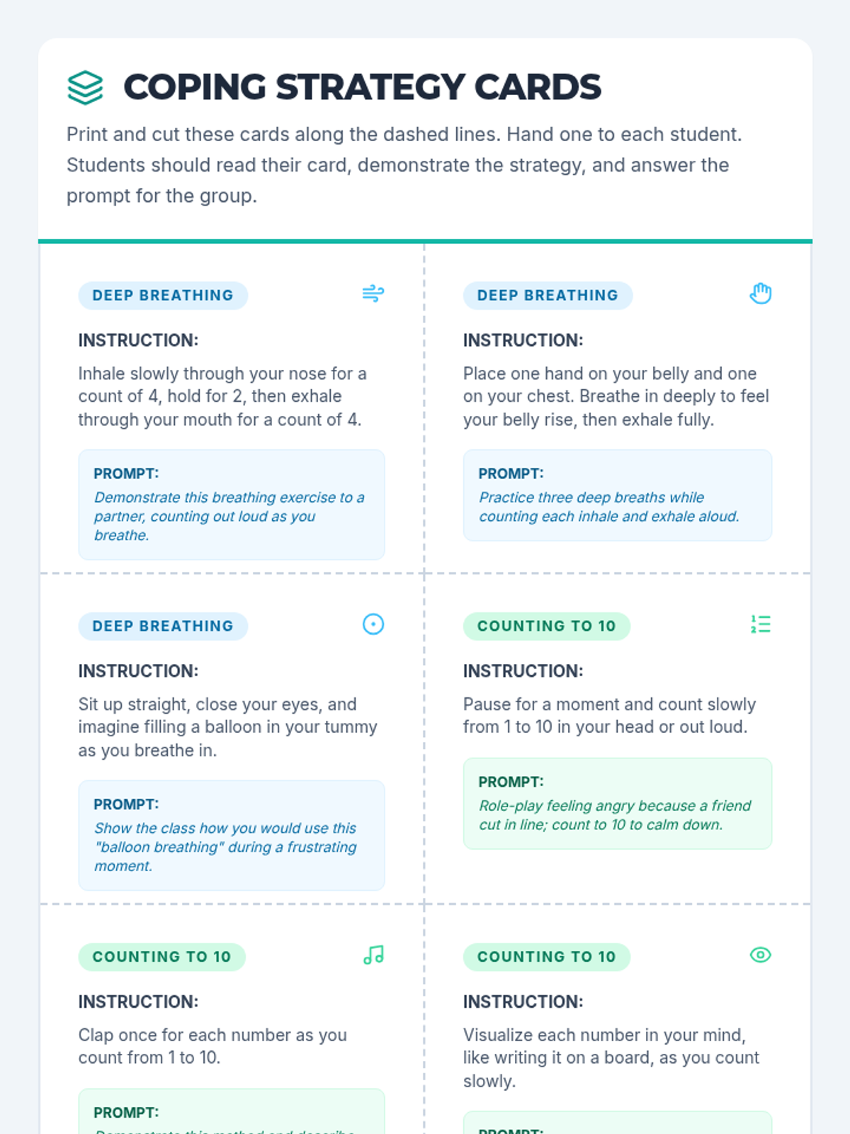 A lesson designed to help students distinguish between Small and Big Problems and choose safe regulation strategies instead of physical reactions. It includes a social story, practice worksheet, and strategy reference guide.