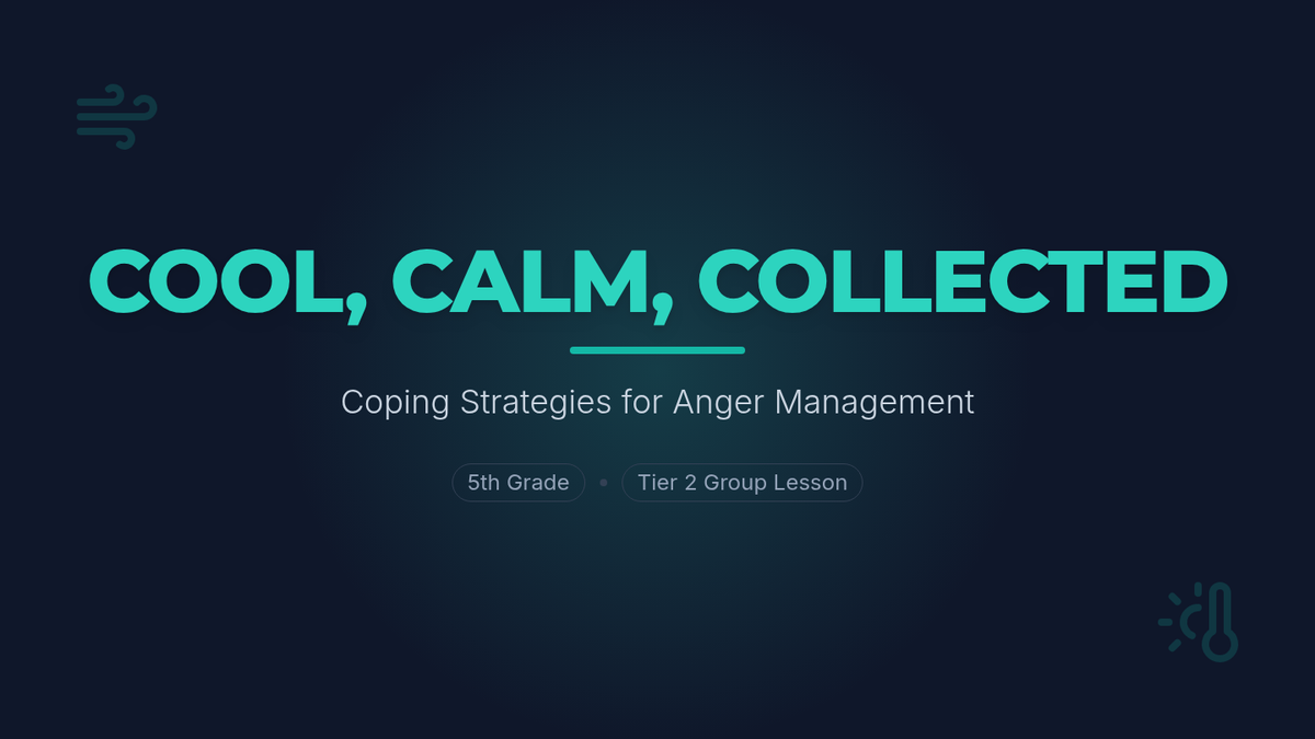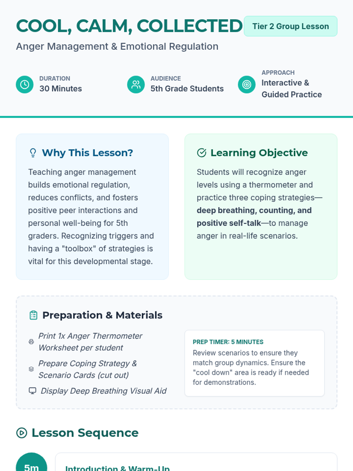 A 30-minute Tier 2 group lesson for 5th graders focused on recognizing anger levels and practicing emotional regulation through deep breathing, counting, and positive self-talk.