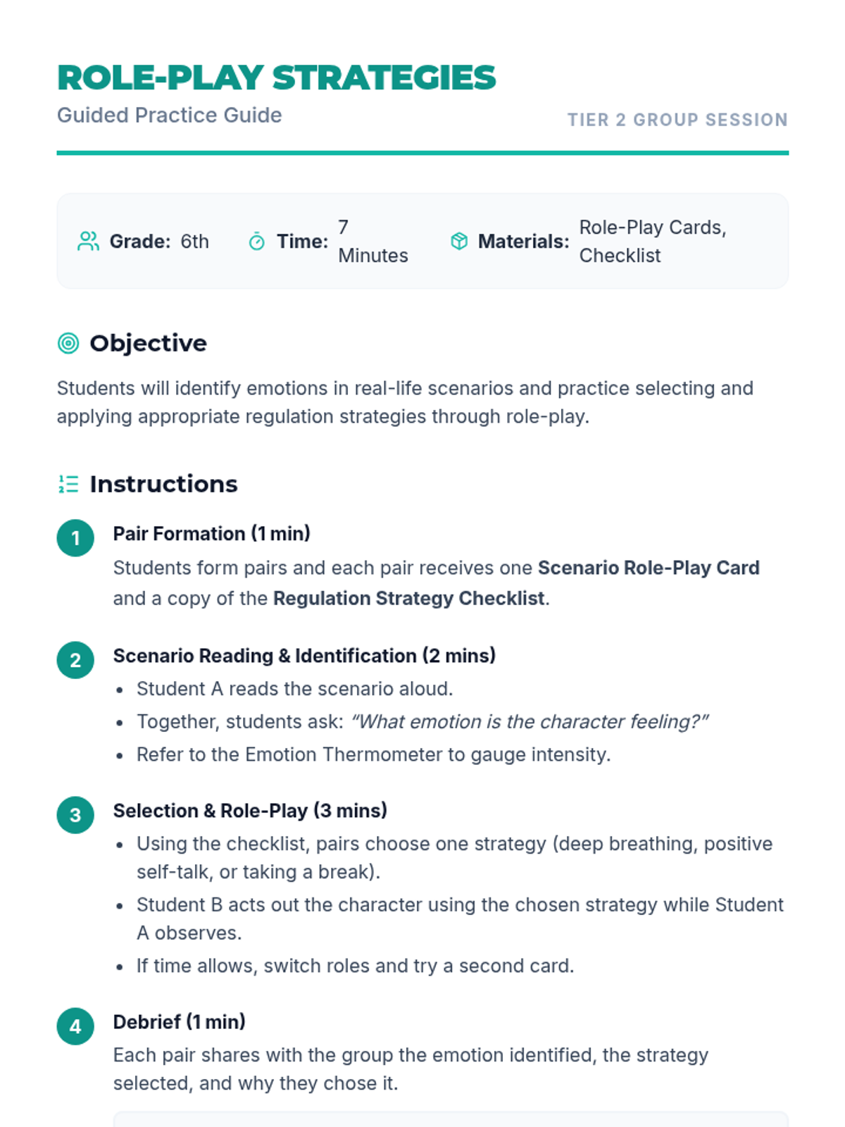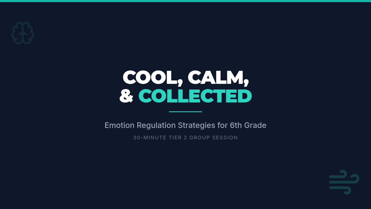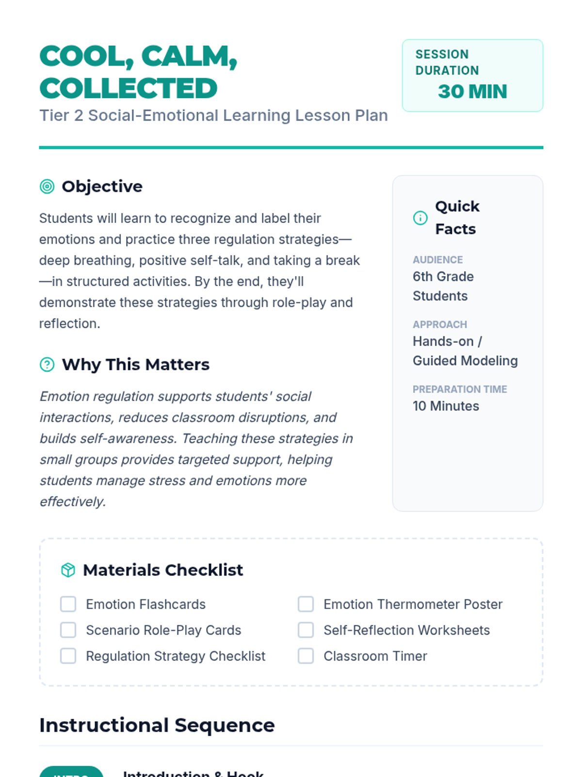 A 30-minute Tier 2 group lesson for 6th-grade students focused on recognizing, labeling, and regulating emotions using specific strategies like deep breathing and positive self-talk.