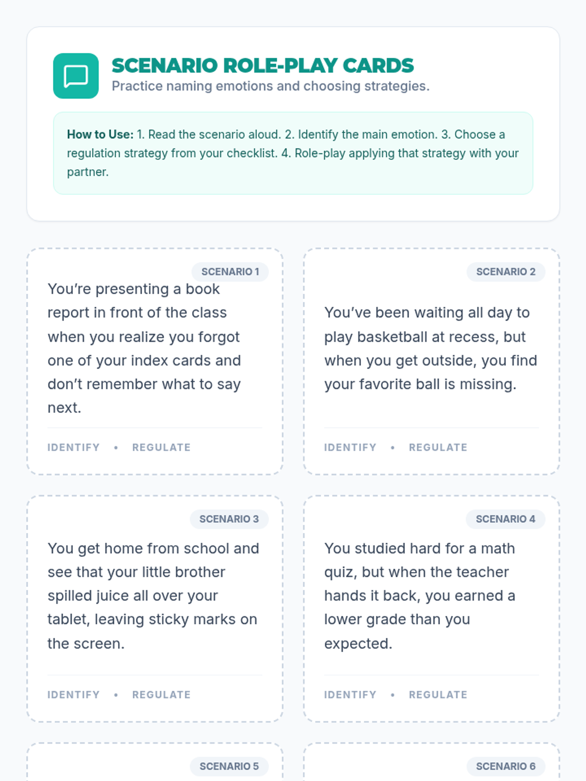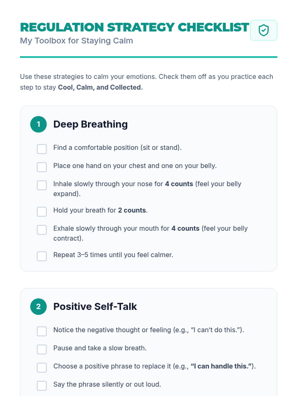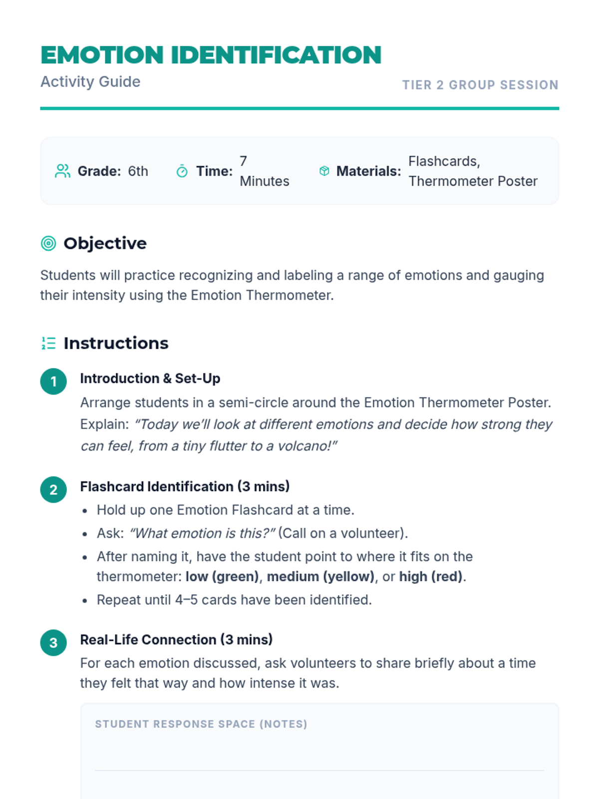 A 30-minute Tier 2 group lesson for 6th-grade students focused on recognizing, labeling, and regulating emotions using specific strategies like deep breathing and positive self-talk.