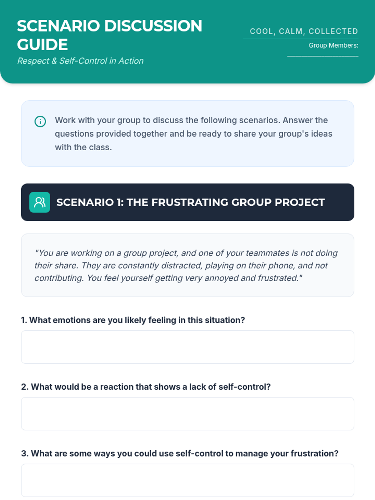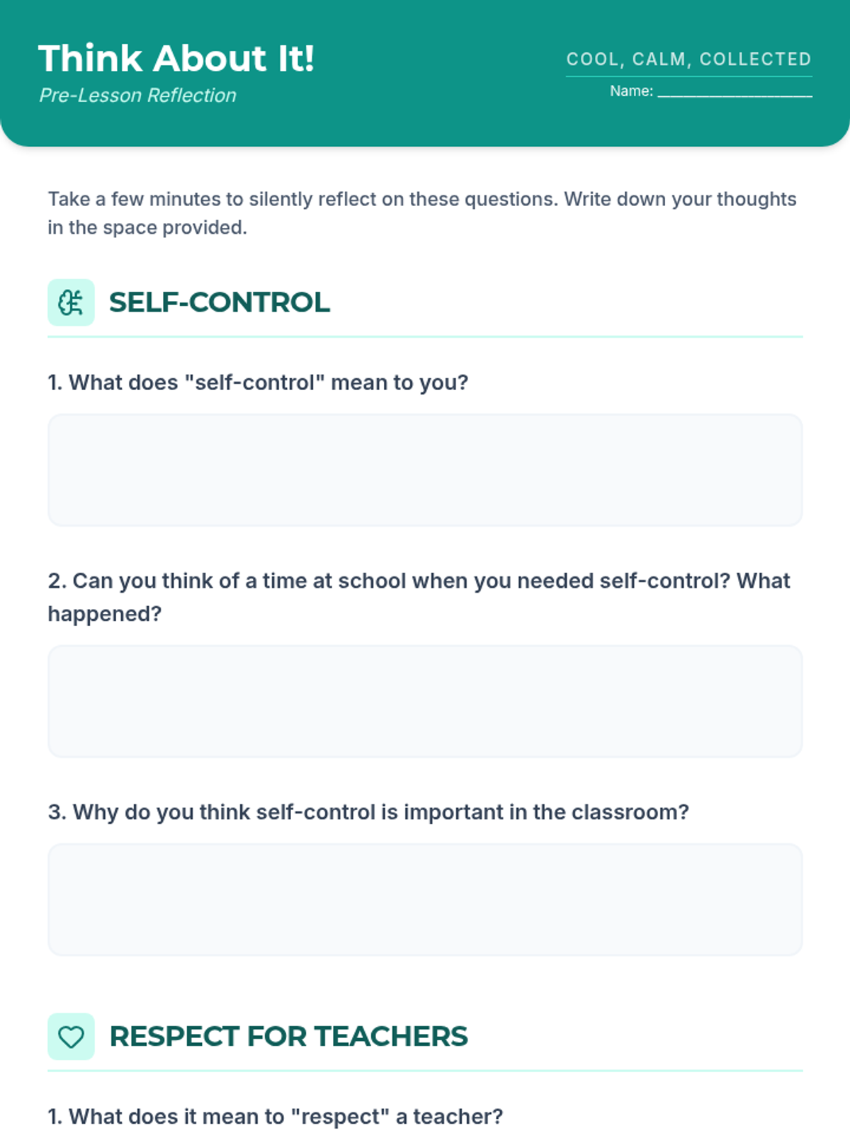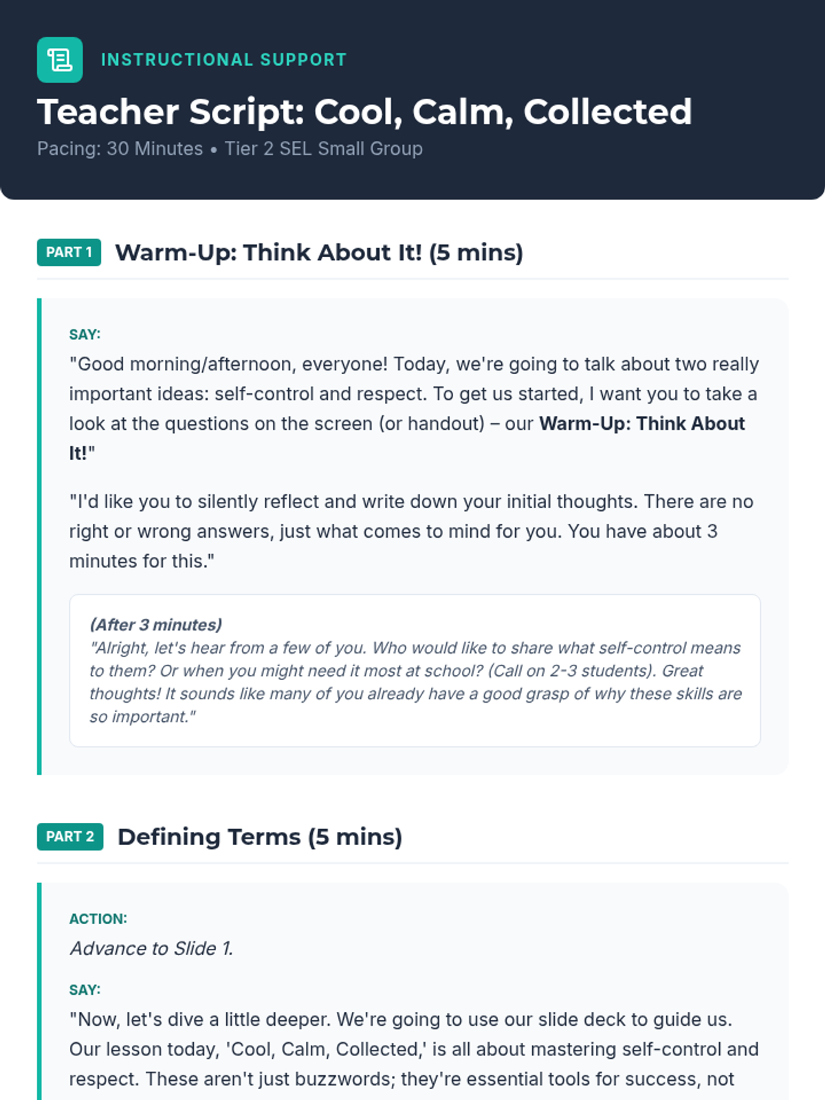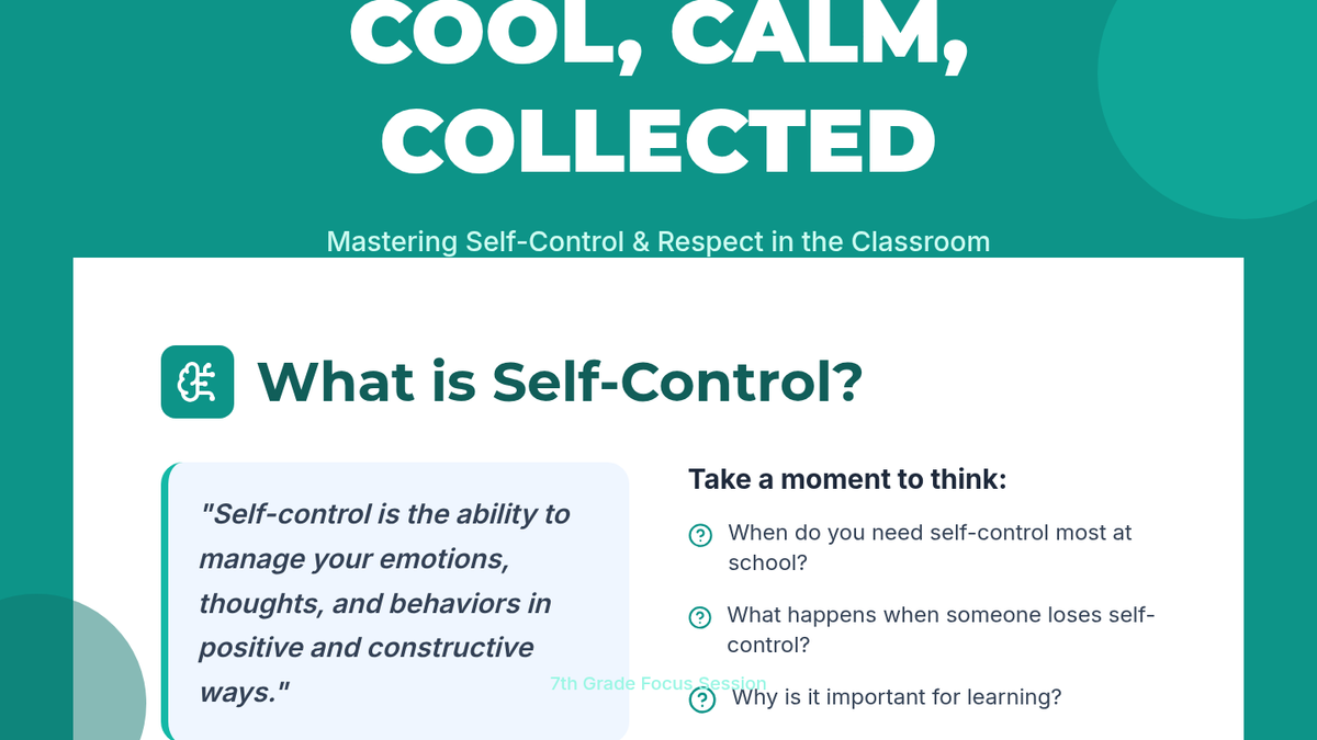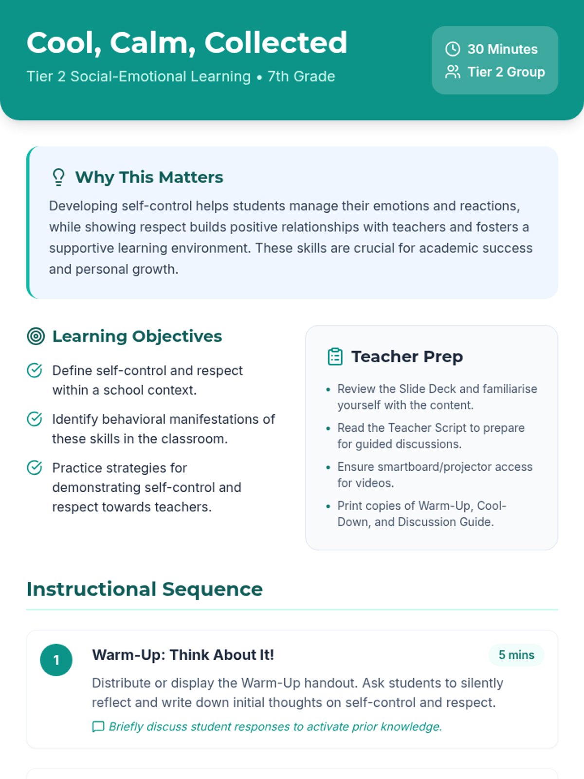 A 30-minute Tier 2 lesson for 7th-grade students focused on developing self-control and demonstrating respect towards teachers through videos, discussions, and reflection.