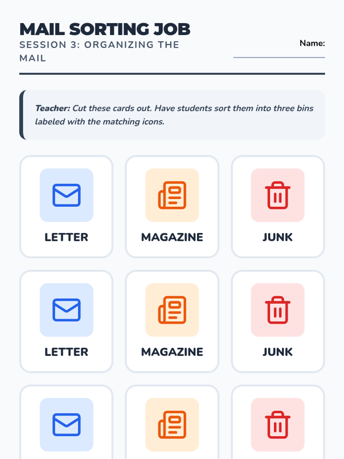 Explores office-based tasks including paper shredding, folding flyers, and simple mail sorting.