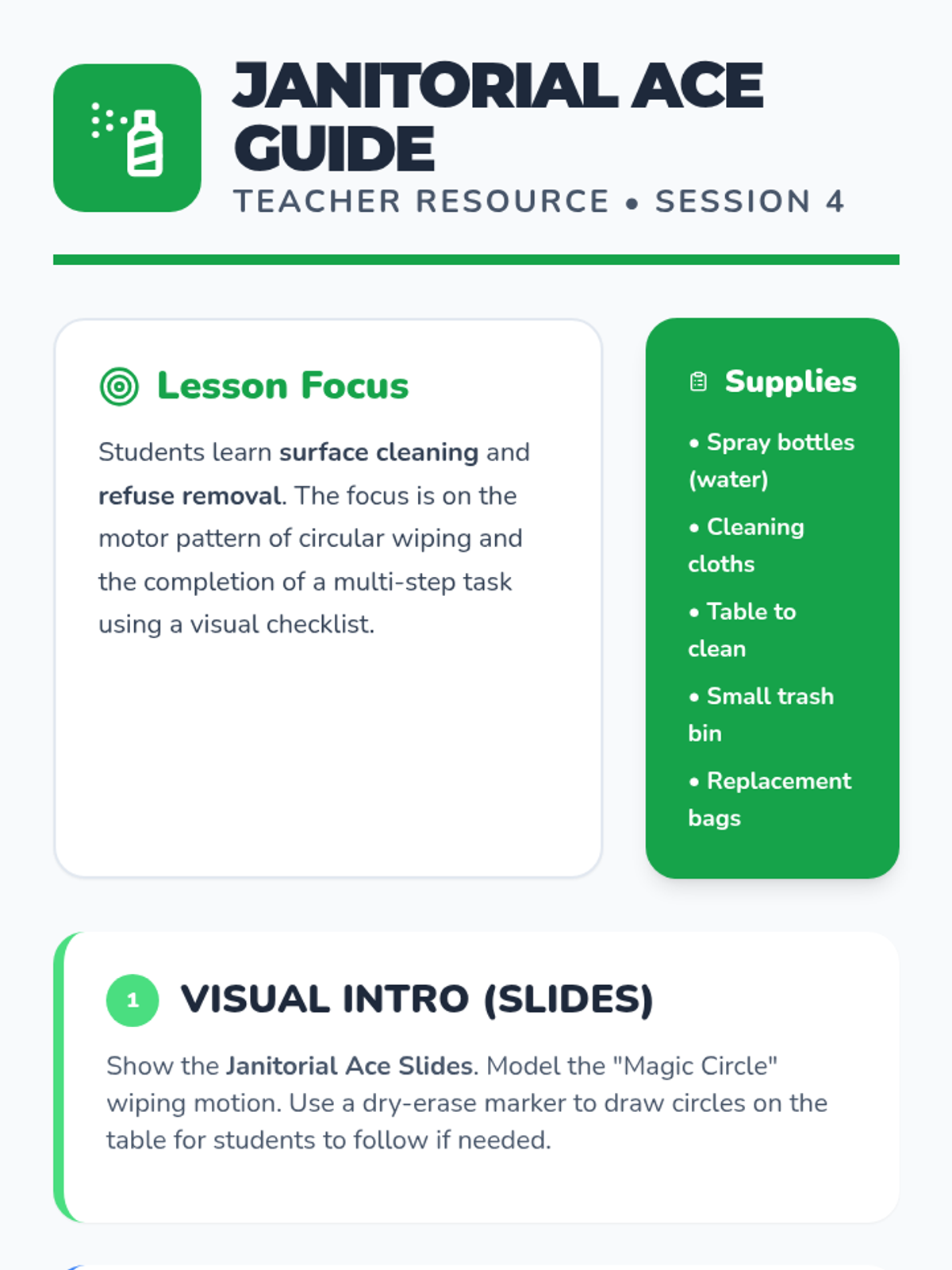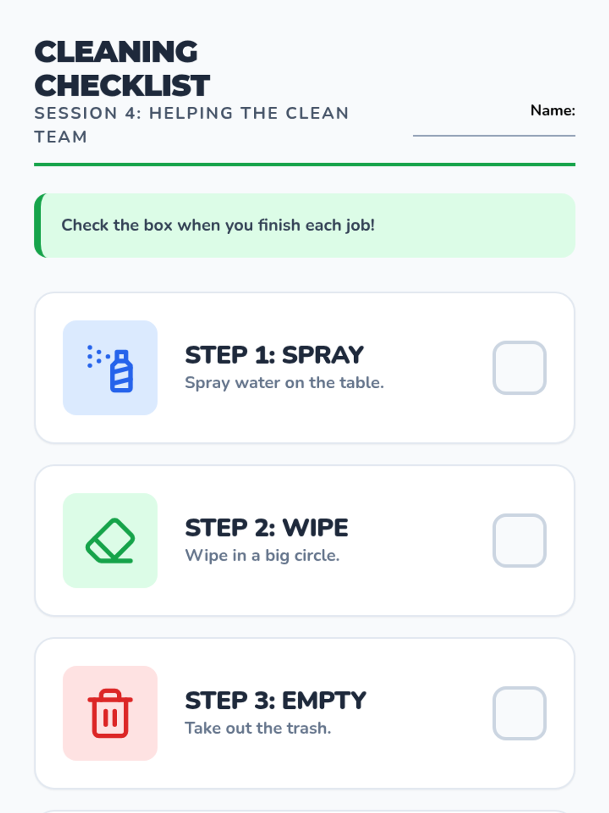 Introduces essential cleaning and maintenance tasks with a focus on follow-through and completion.