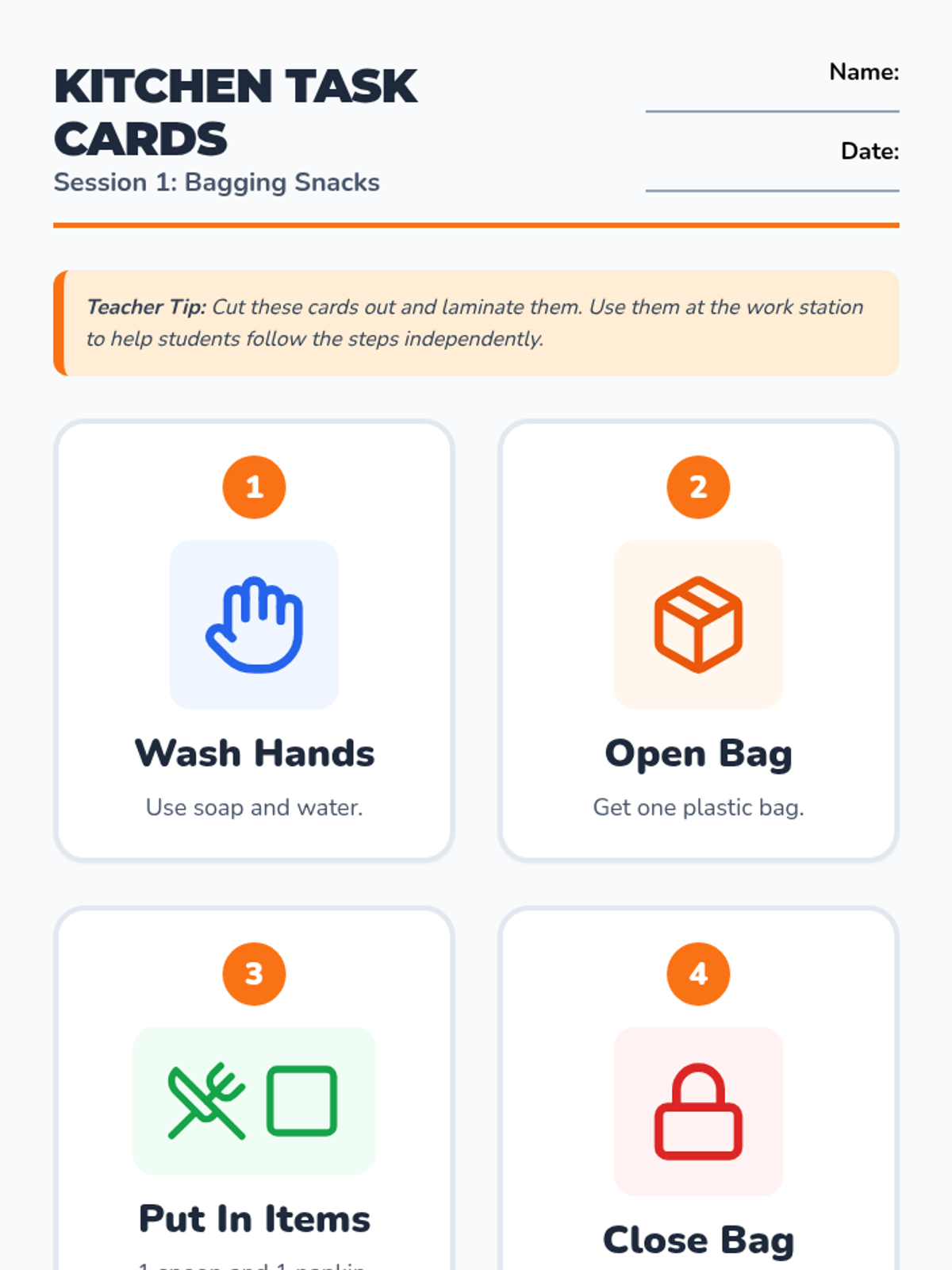 Introduction to repetitive food service tasks such as sorting, bagging, and simple assembly with a focus on hygiene and consistency.