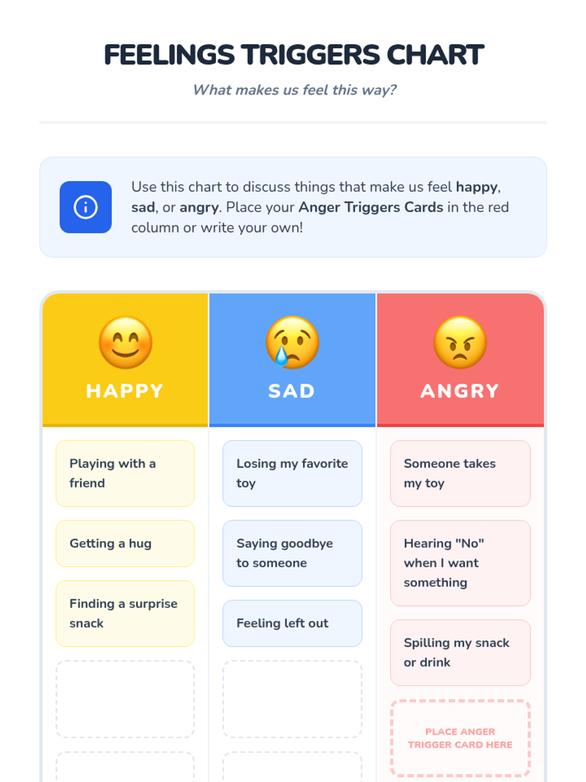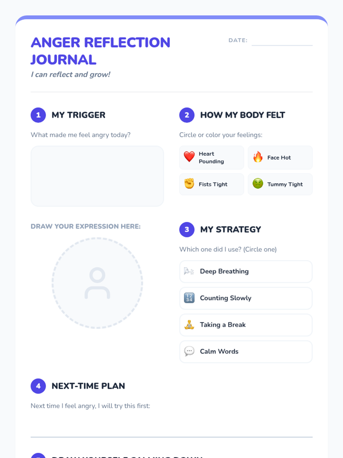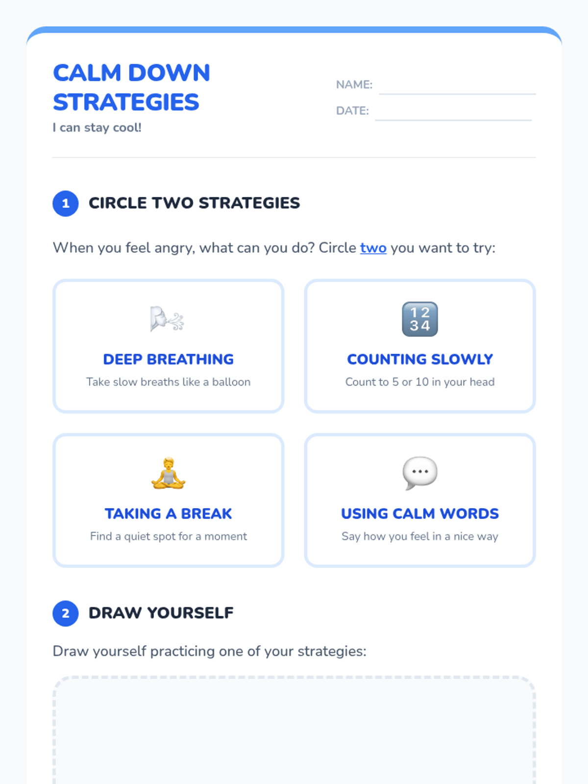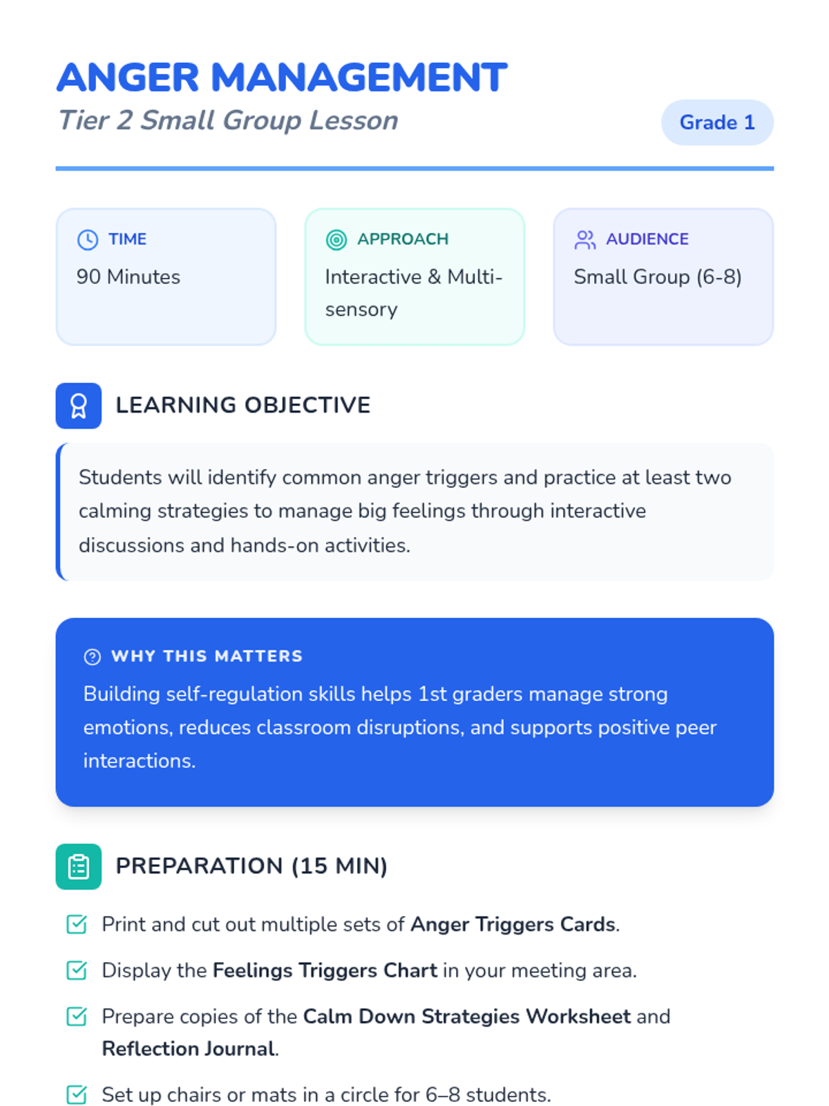A 90-minute Tier 2 small-group lesson for 1st graders focused on identifying anger triggers and practicing self-regulation strategies like deep breathing and counting.