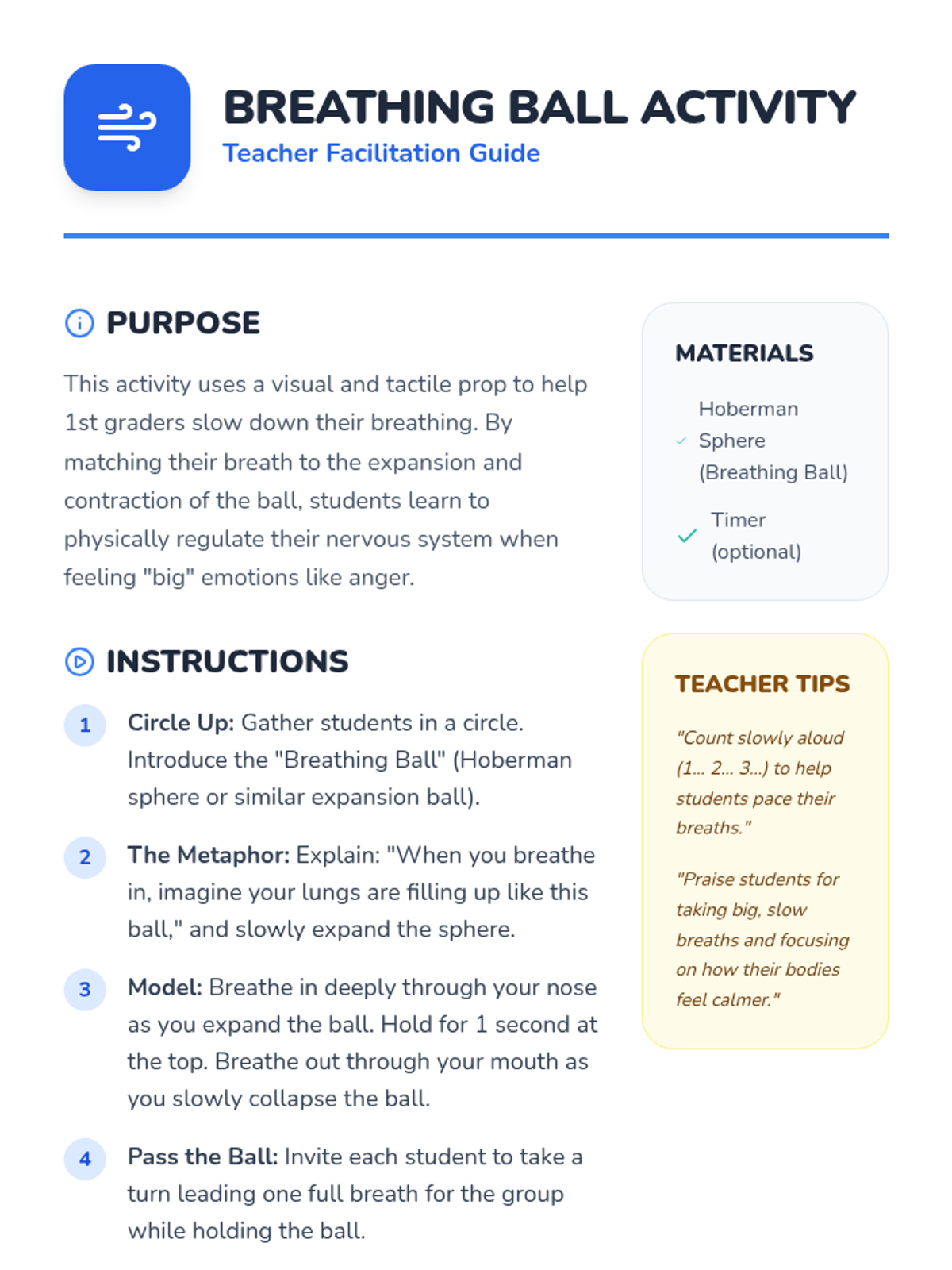 Students learn the 1+3+4 breathing technique to manage anger and frustration.