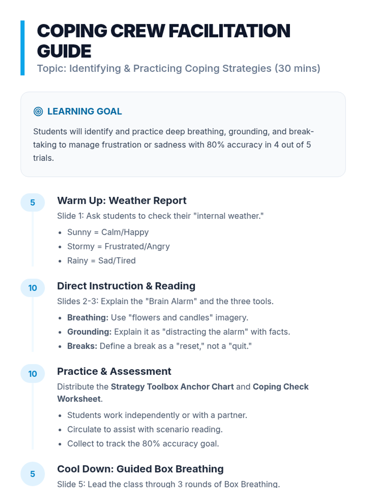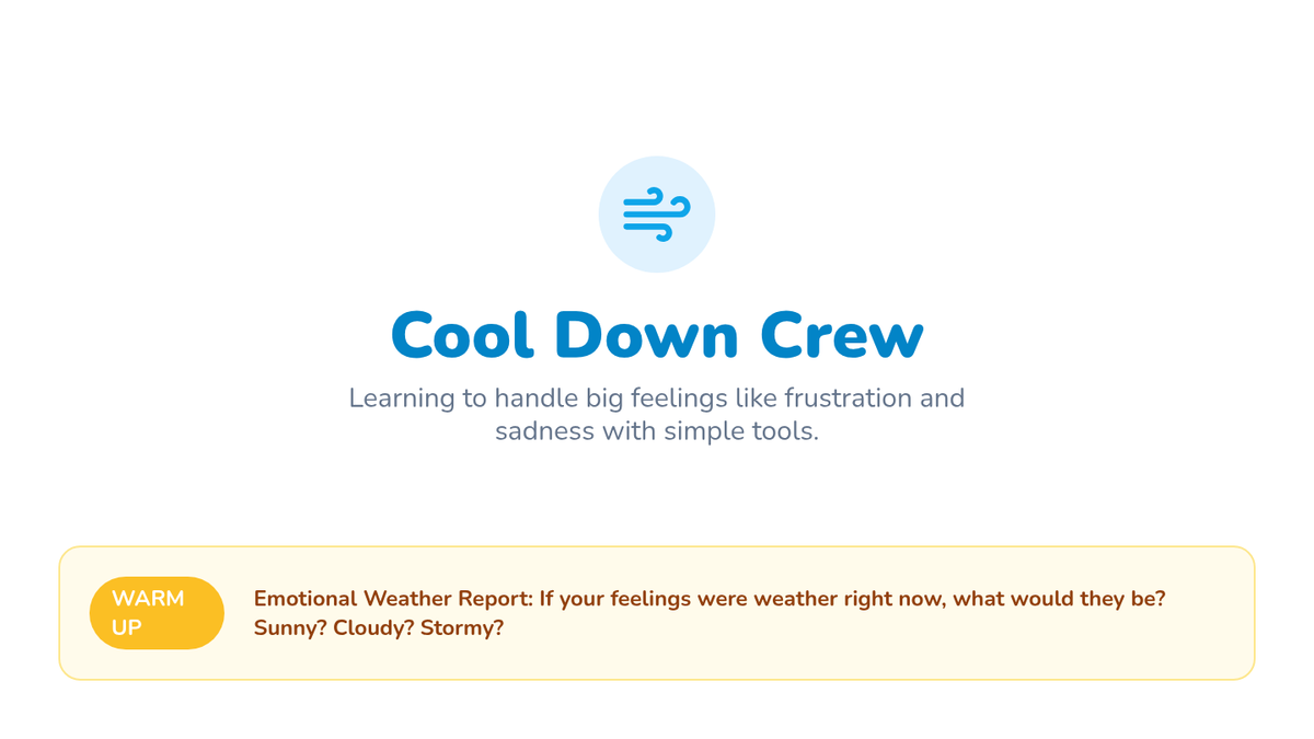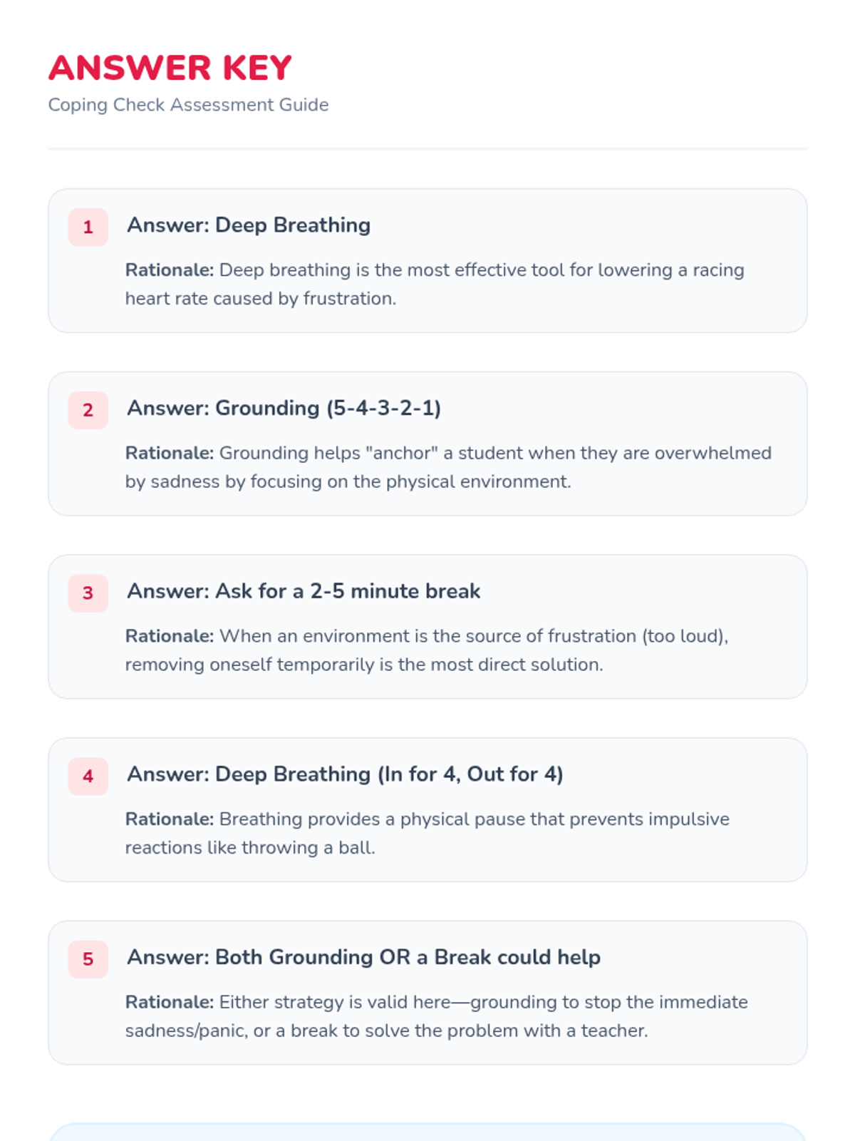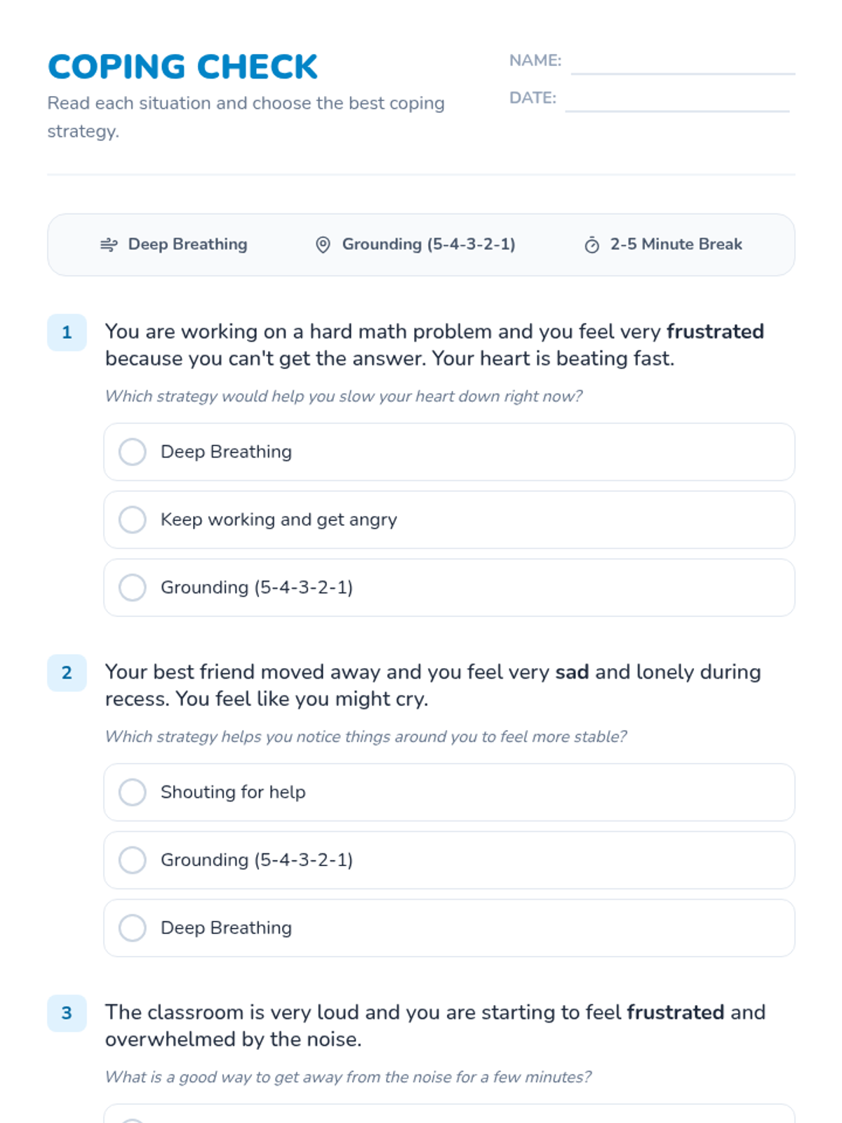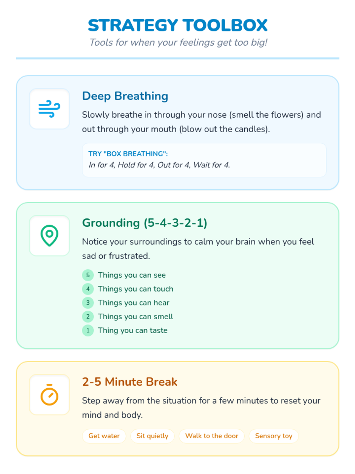 Students will learn to identify and practice coping strategies like deep breathing, grounding, and taking breaks to manage frustration and sadness.
