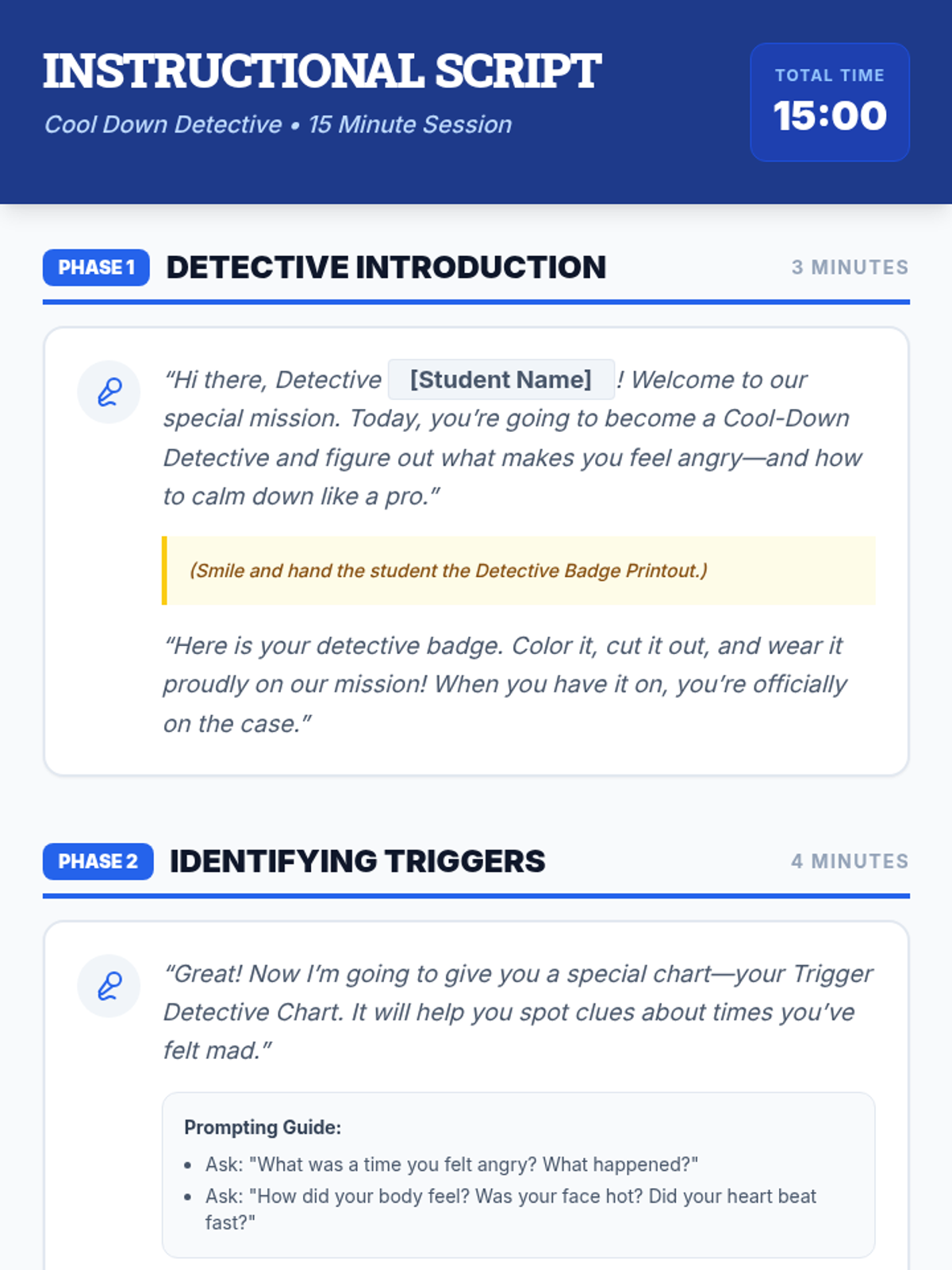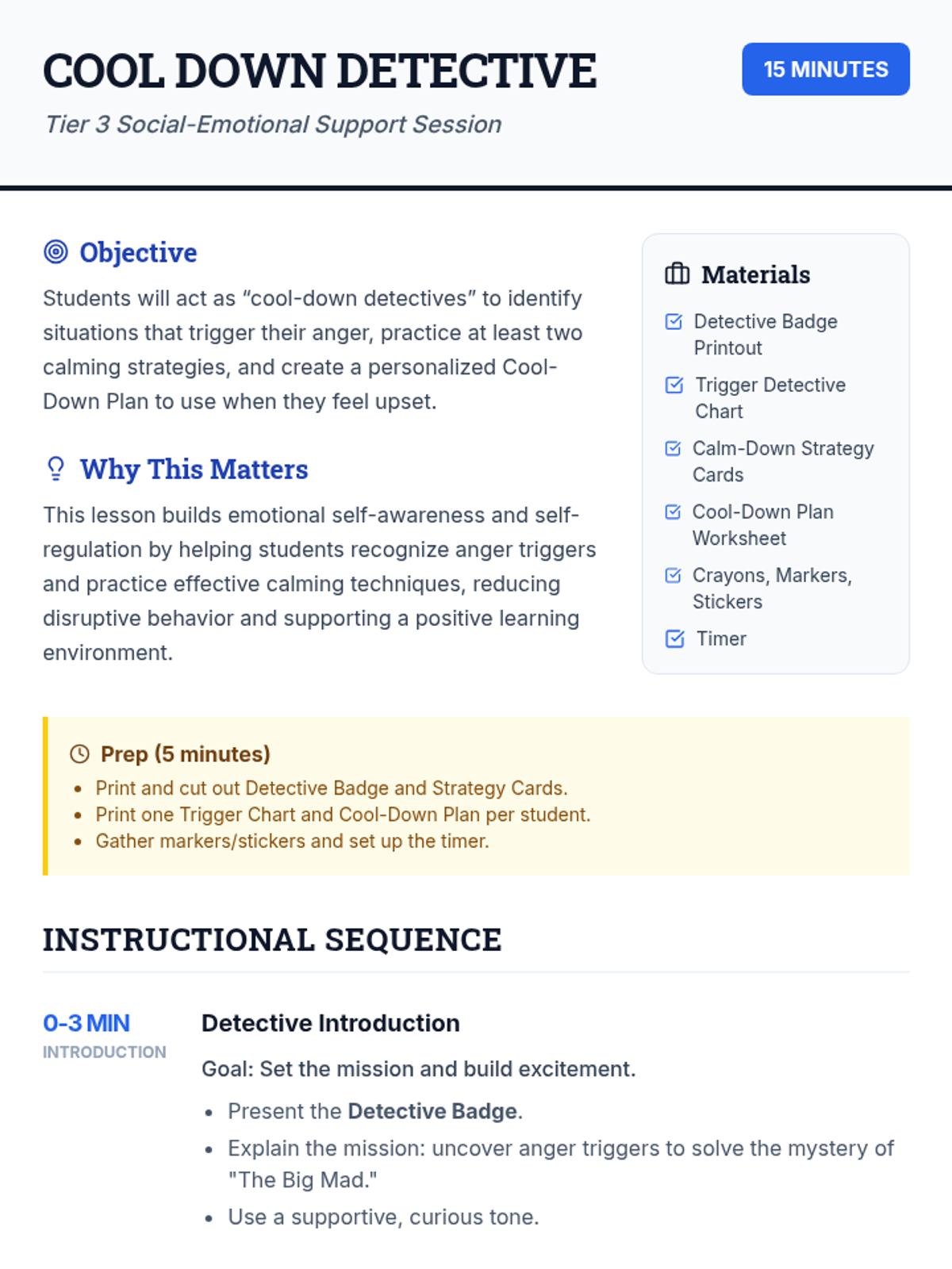 A 15-minute Tier 3 social-emotional learning lesson for 2nd graders to identify anger triggers and create a personalized regulation plan through a playful detective theme.