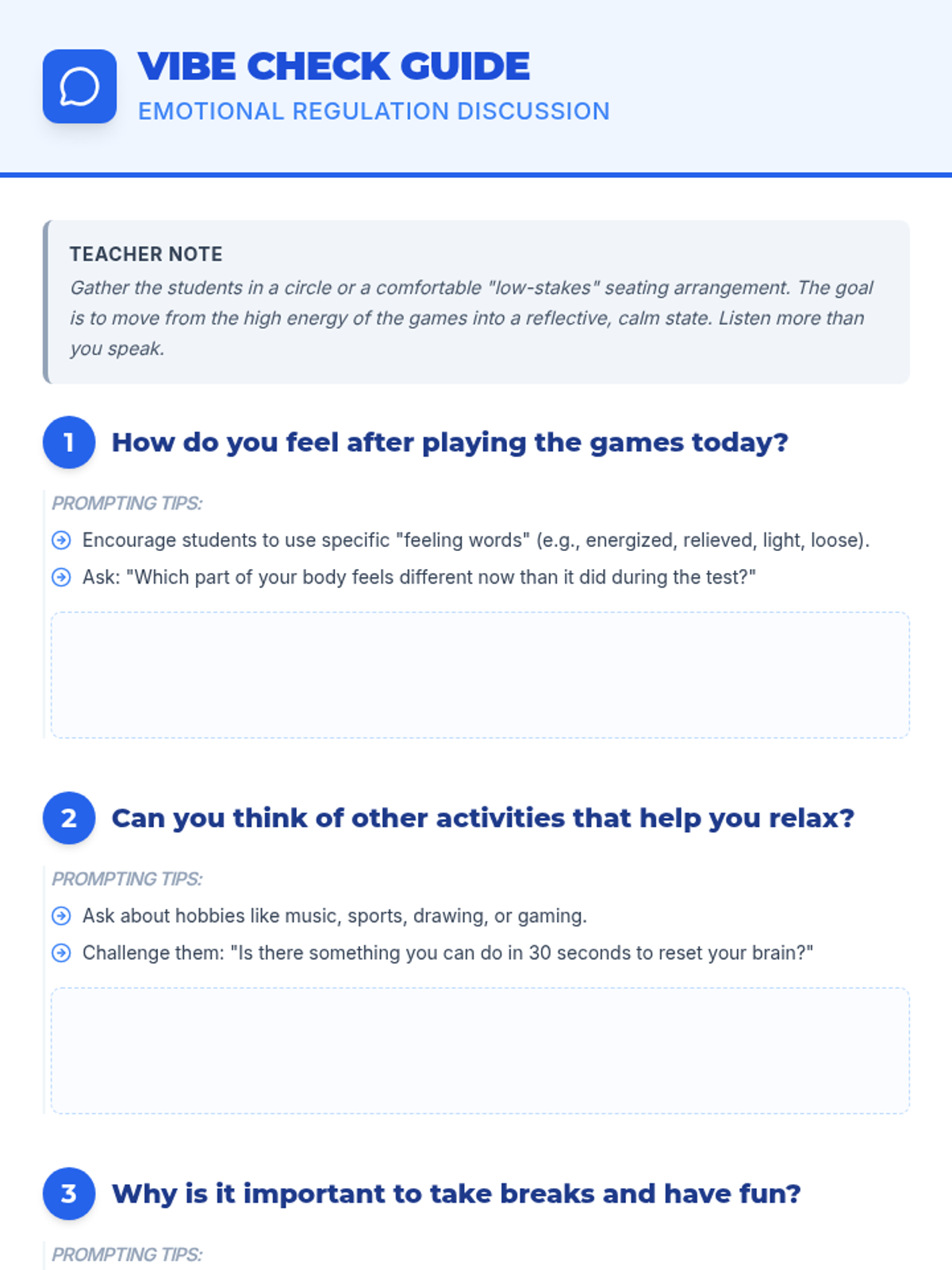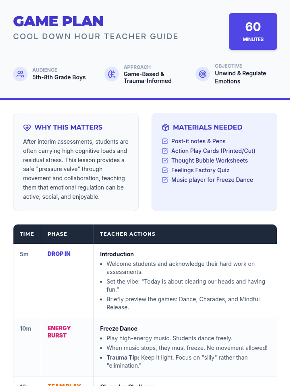 A high-energy, trauma-informed lesson designed for 5th-8th grade boys to decompress and regulate emotions through games and mindfulness after interim assessments.