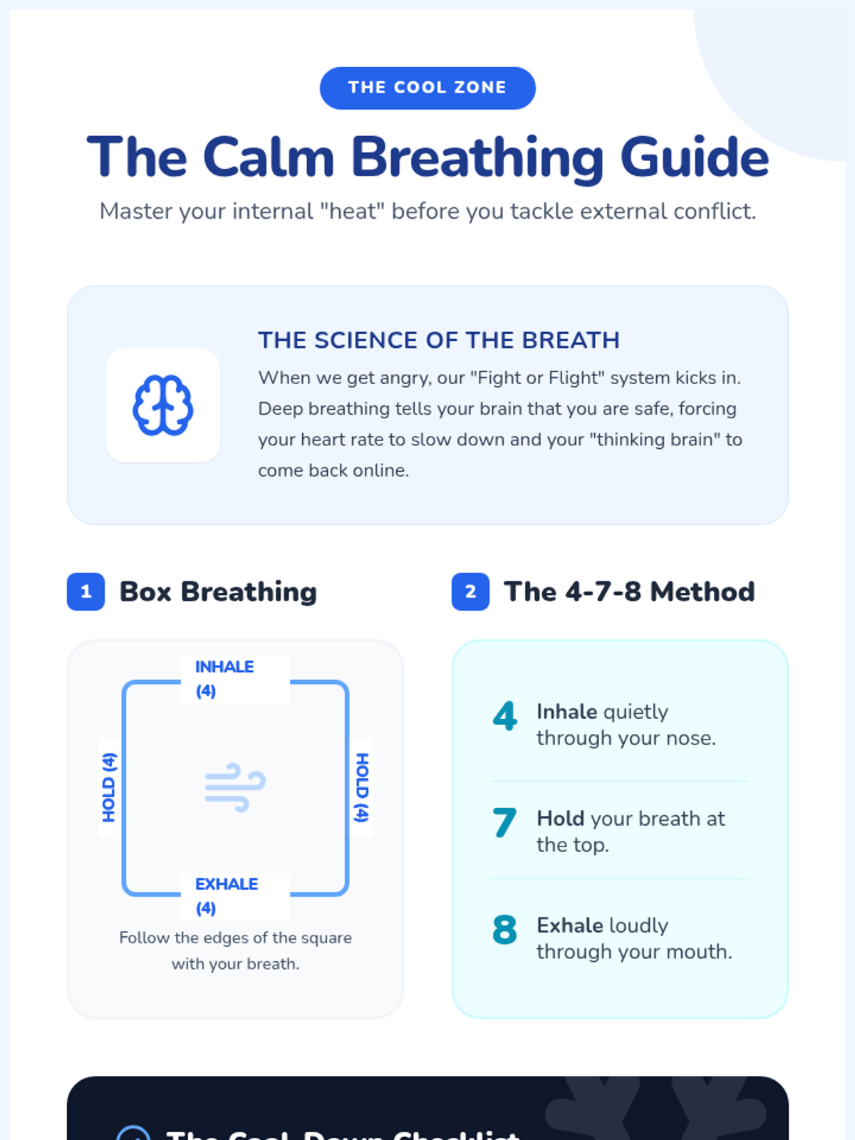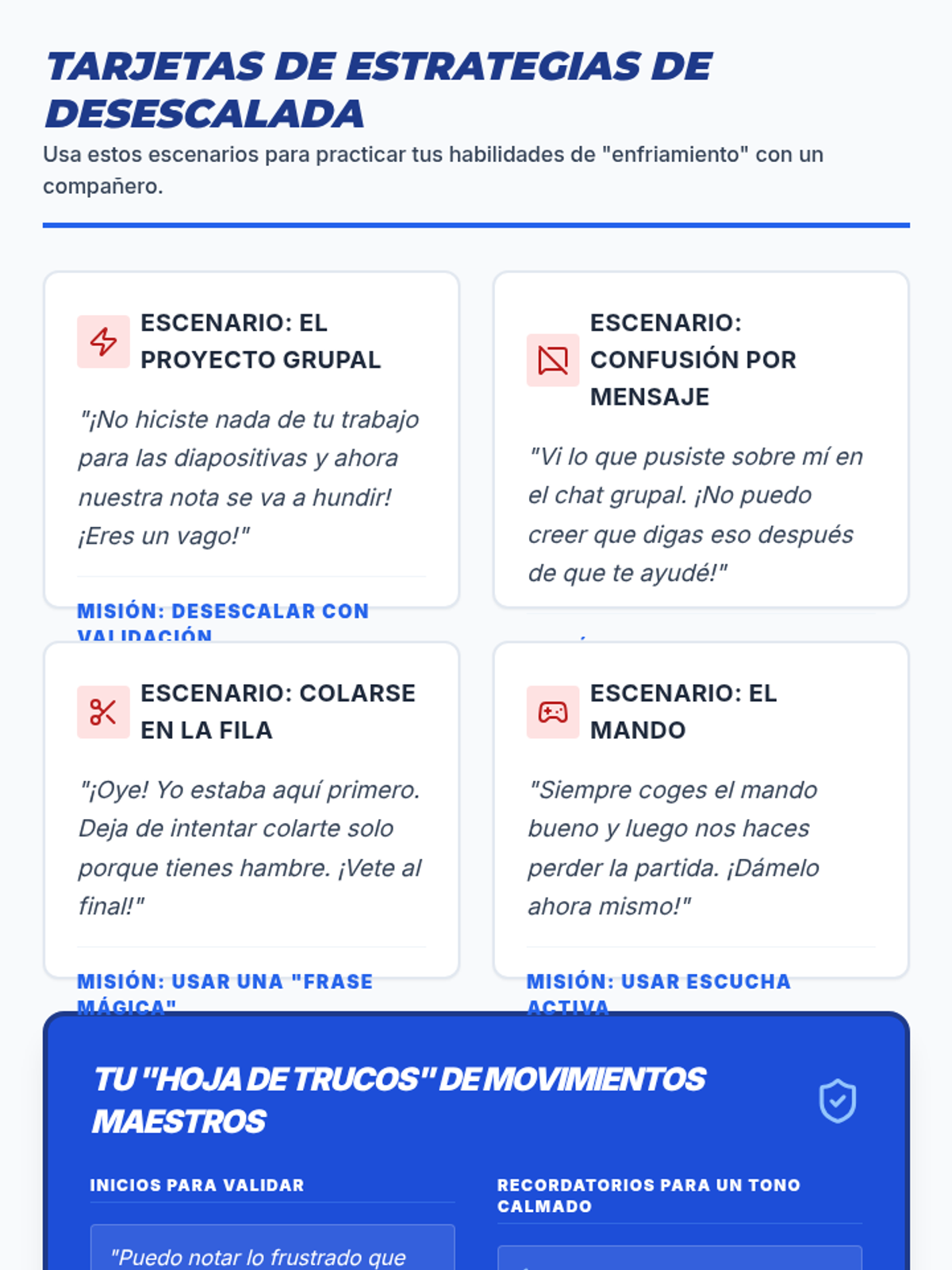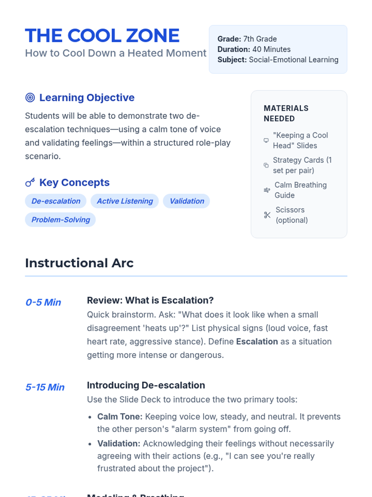A comprehensive lesson for 7th graders on de-escalation techniques, focusing on maintaining a calm tone and validating feelings through role-play and breathing exercises.