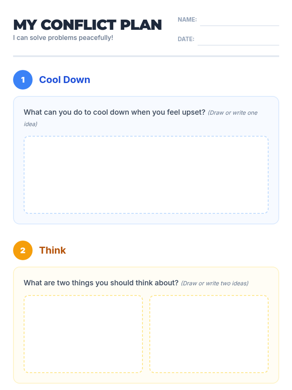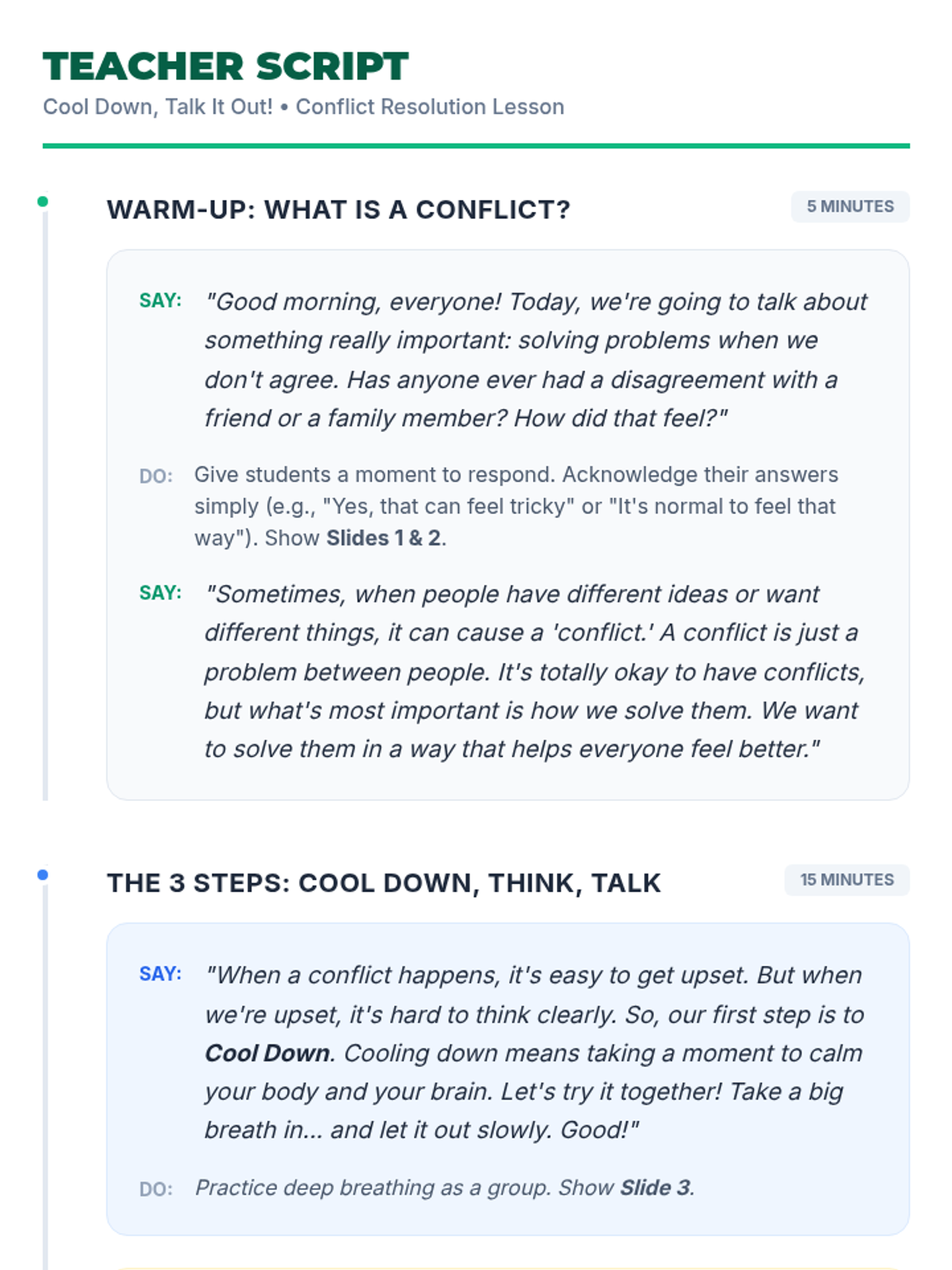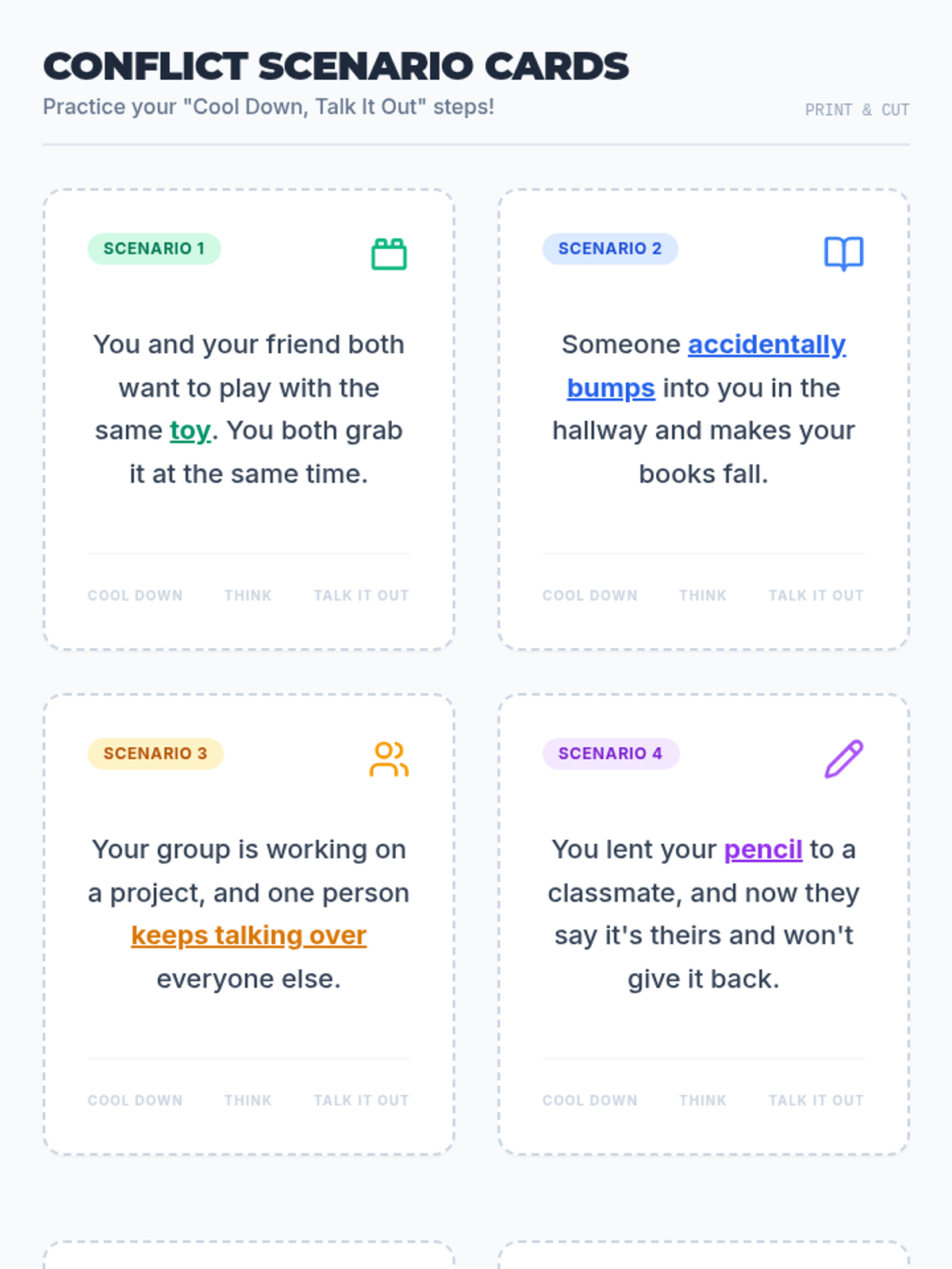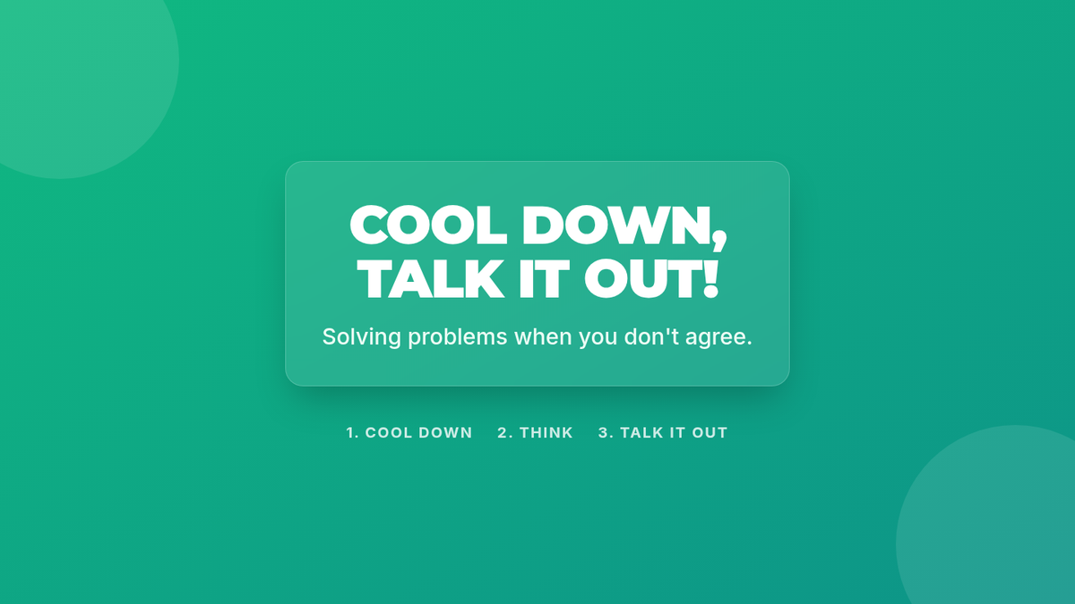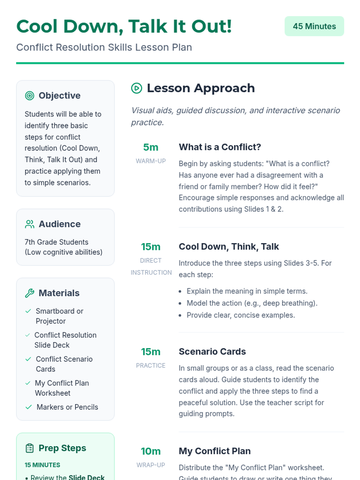 This 45-minute lesson empowers 7th-grade students with low cognitive abilities to understand and apply basic conflict resolution strategies through simple steps: Cool Down, Think, and Talk It Out.