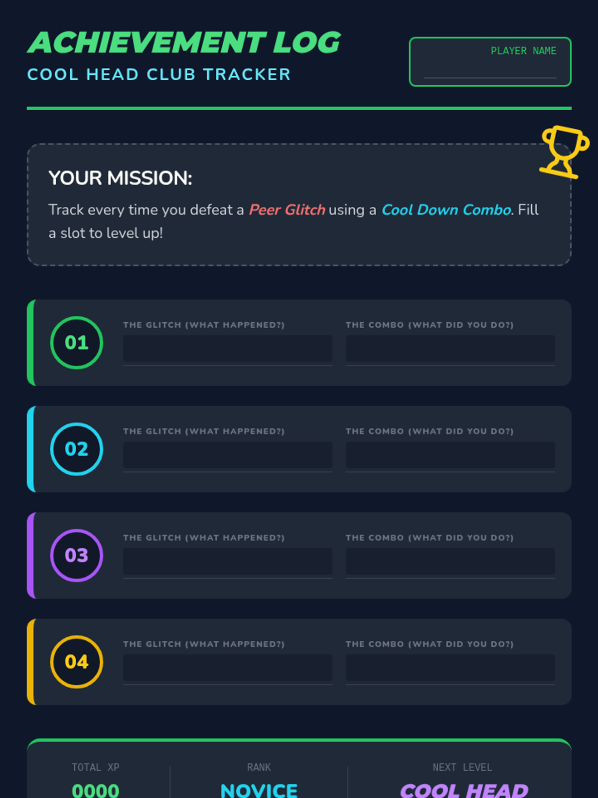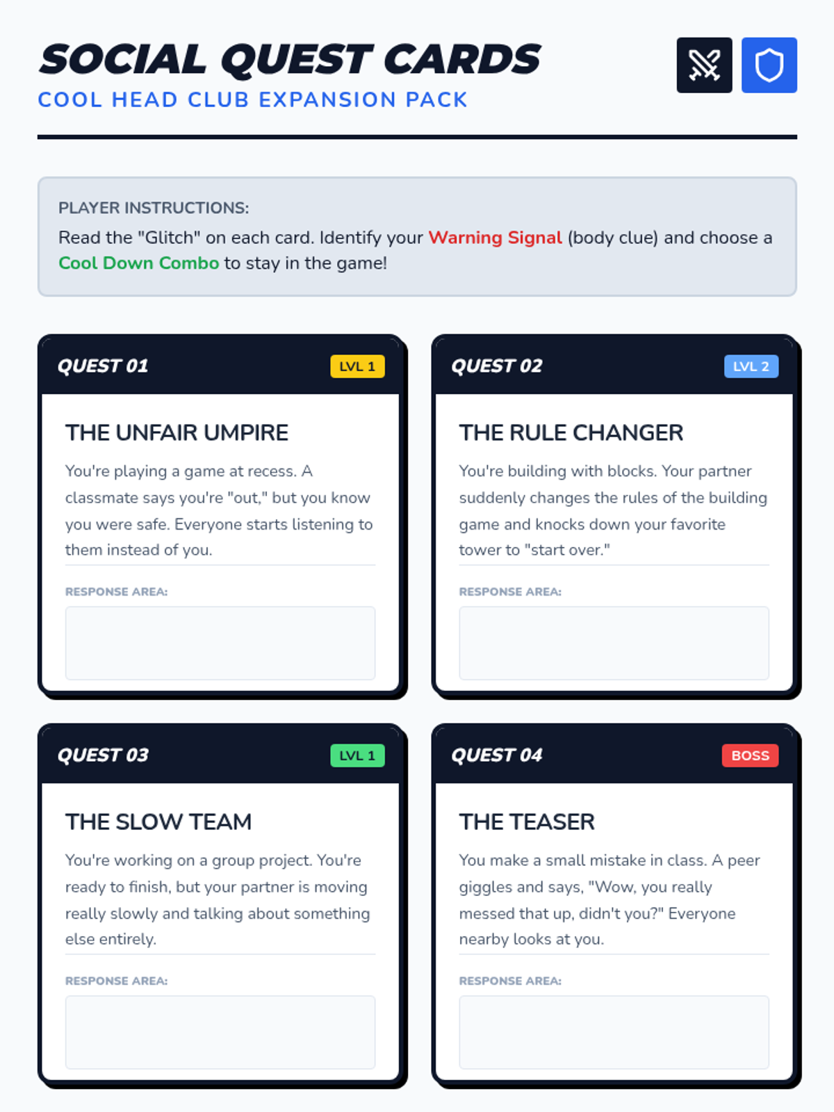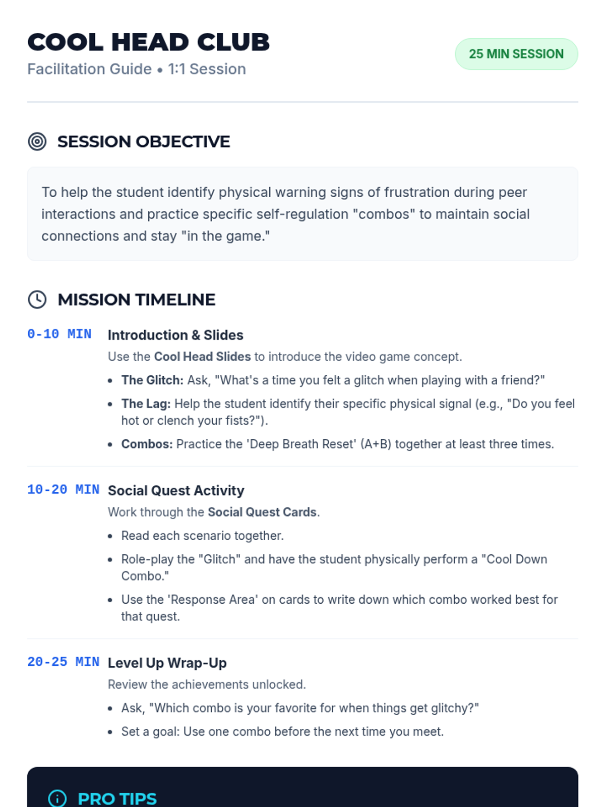 A 1:1 lesson focusing on frustration tolerance when interacting with peers. This lesson uses a video game theme to teach students how to identify 'glitches' in their emotions and use 'Cool Down Combos' to stay in the game.