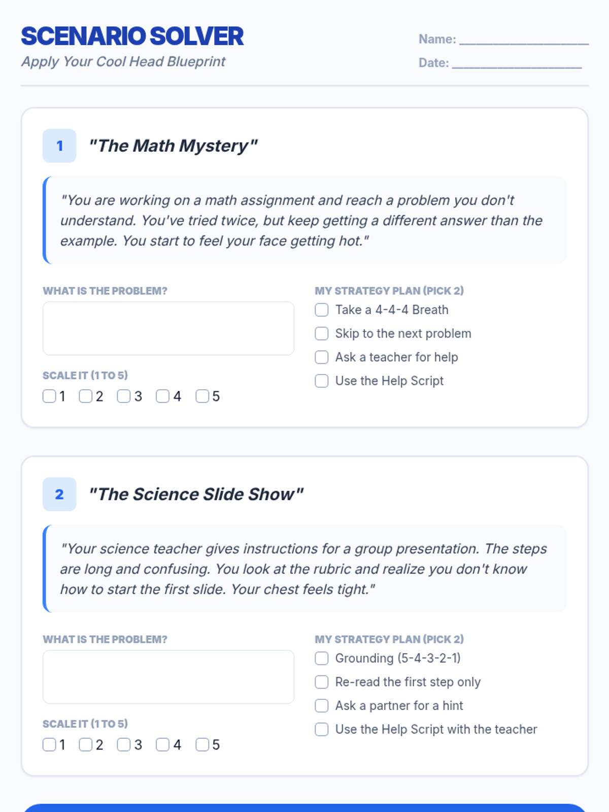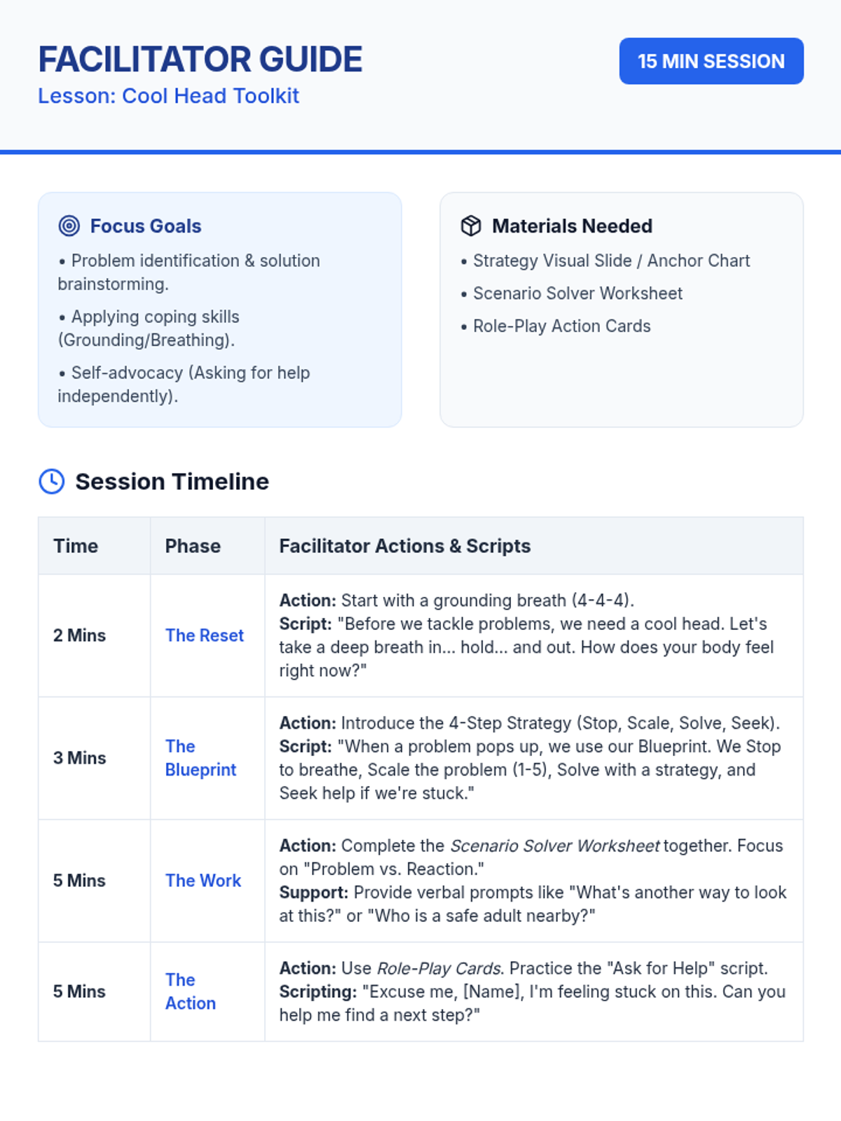A 15-minute Tier 2 counseling lesson designed to help students identify problems, use coping strategies, and advocate for help using a structured problem-solving framework.