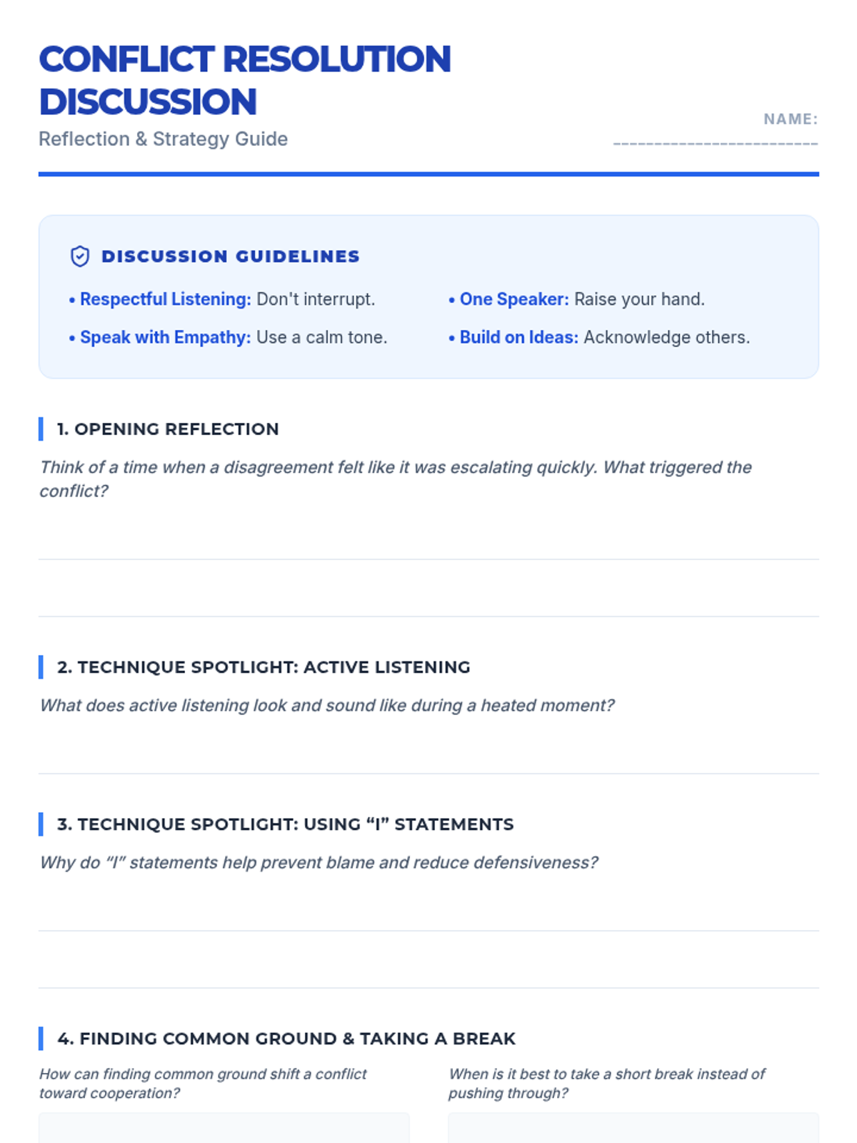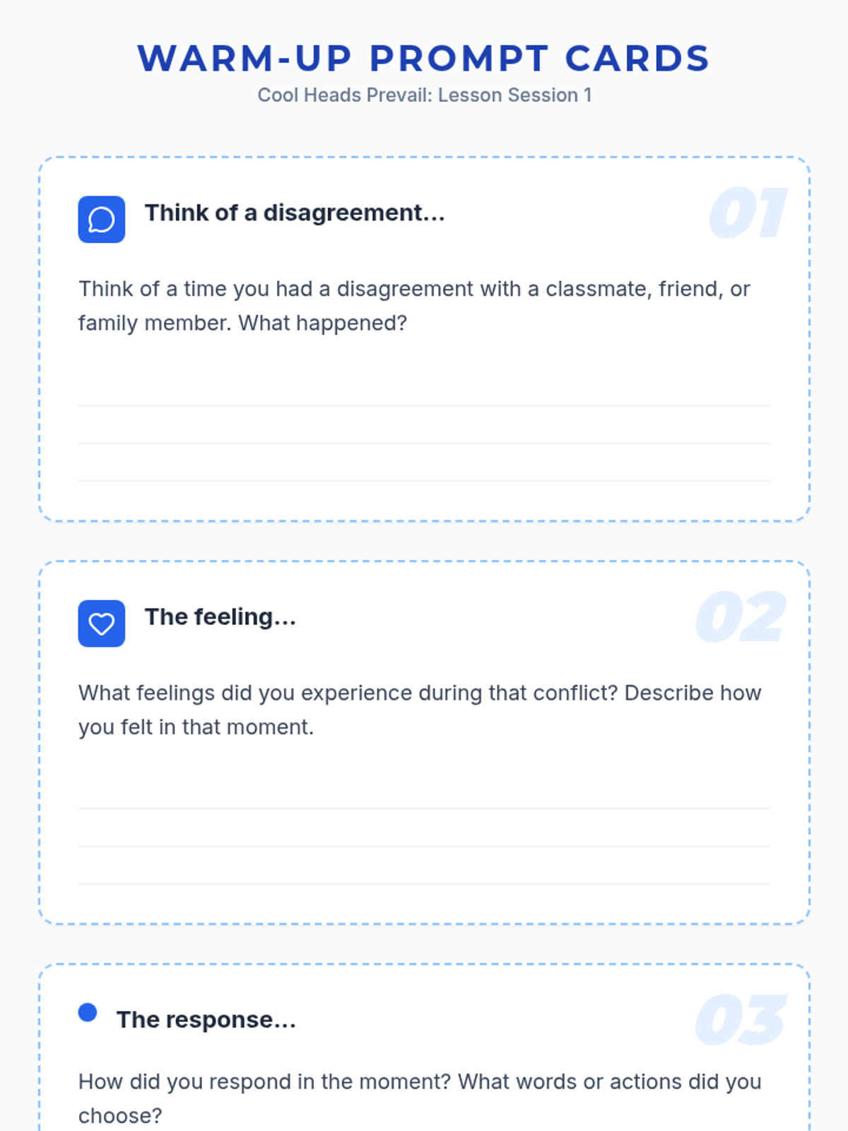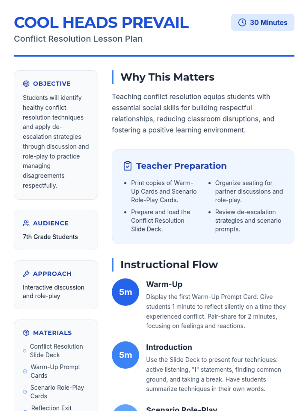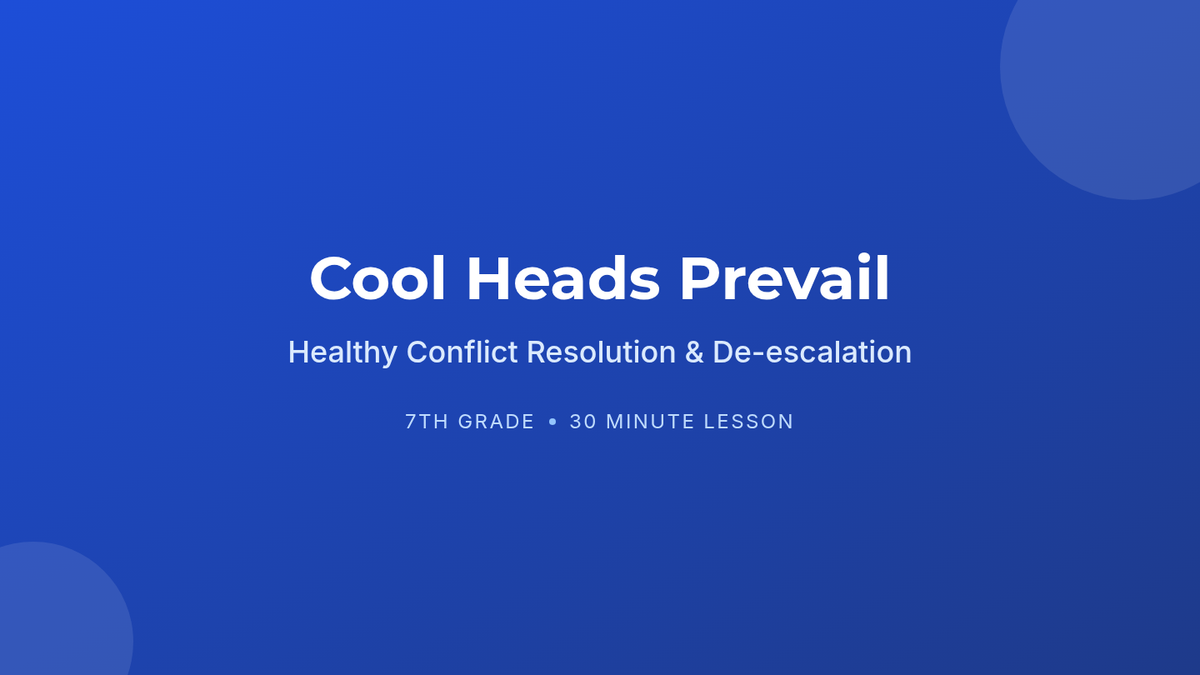 In this one-session, 30-minute lesson, 7th graders will learn to identify healthy conflict resolution techniques and practice de-escalation strategies through discussion and scenarios. This lesson equips students with lifelong social skills for navigating disagreements calmly and respectfully.