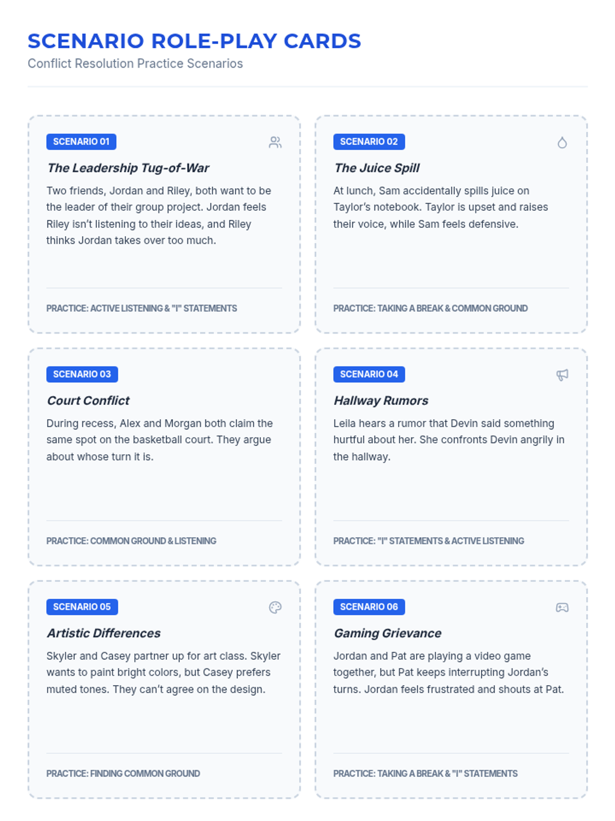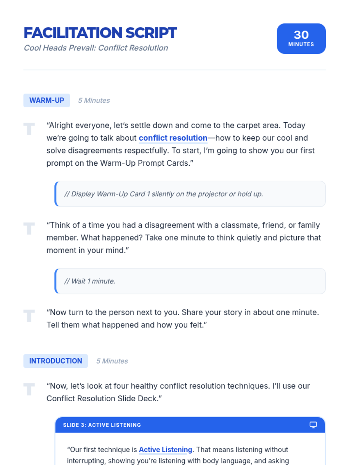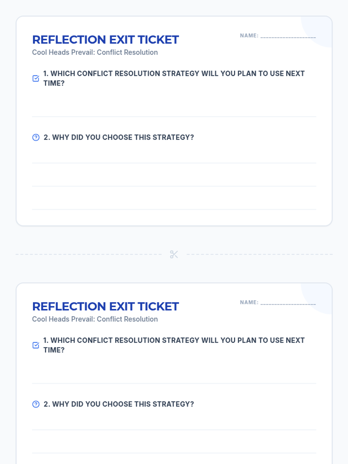 In this one-session, 30-minute lesson, 7th graders will learn to identify healthy conflict resolution techniques and practice de-escalation strategies through discussion and scenarios. This lesson equips students with lifelong social skills for navigating disagreements calmly and respectfully.