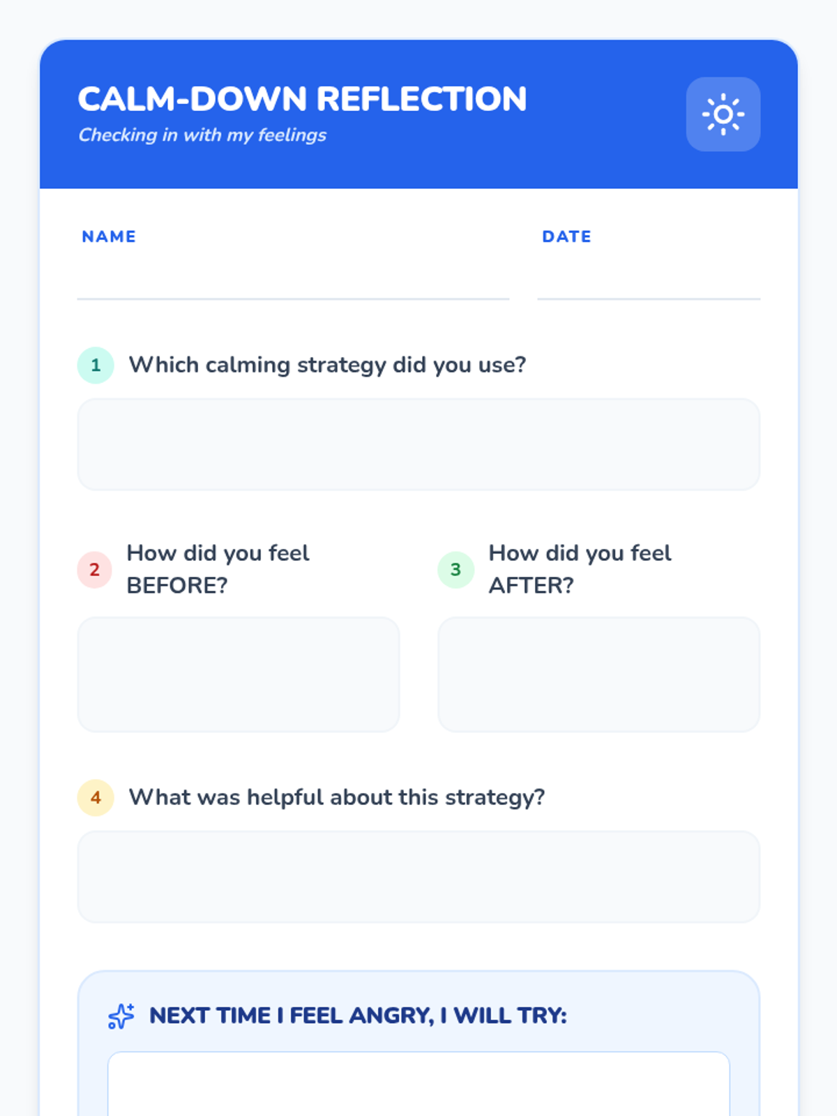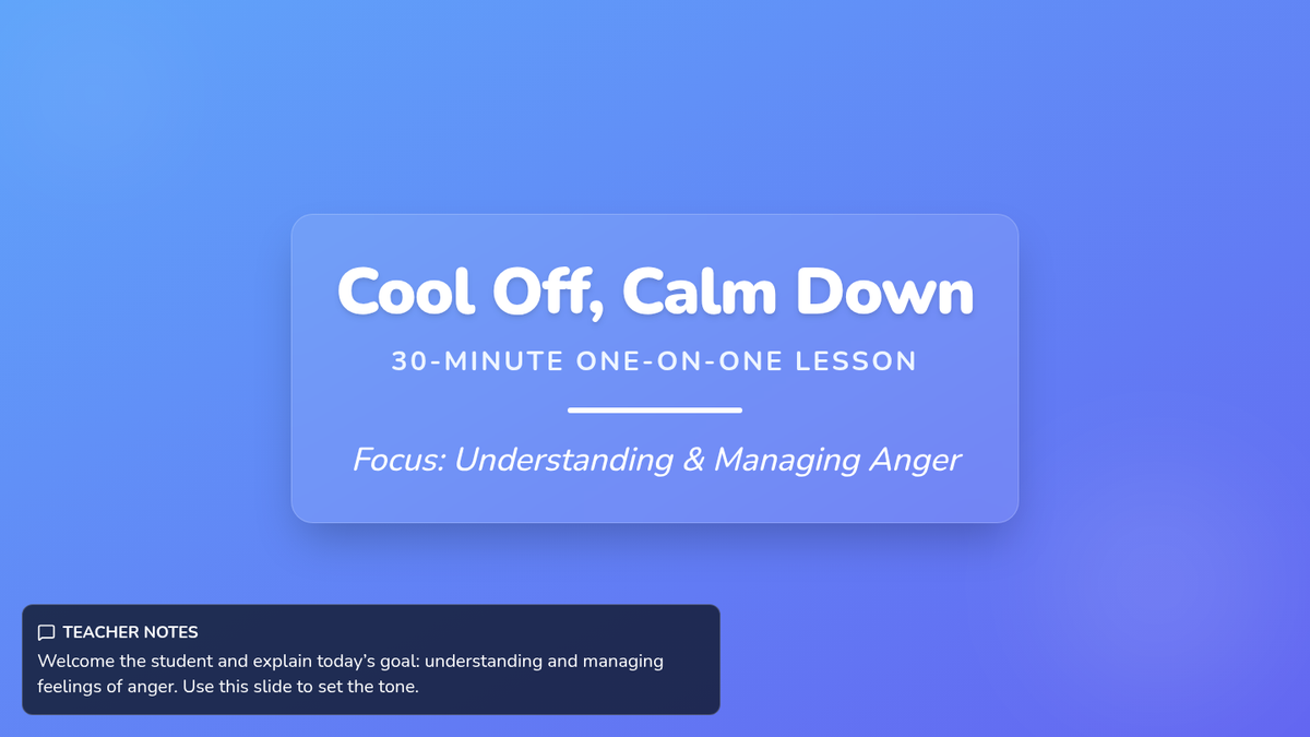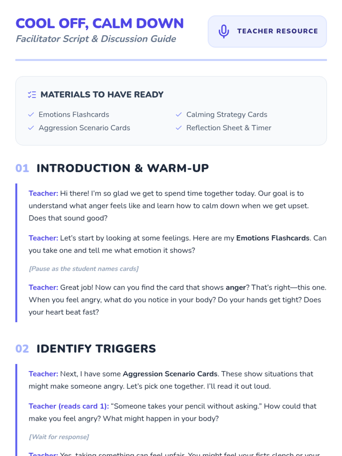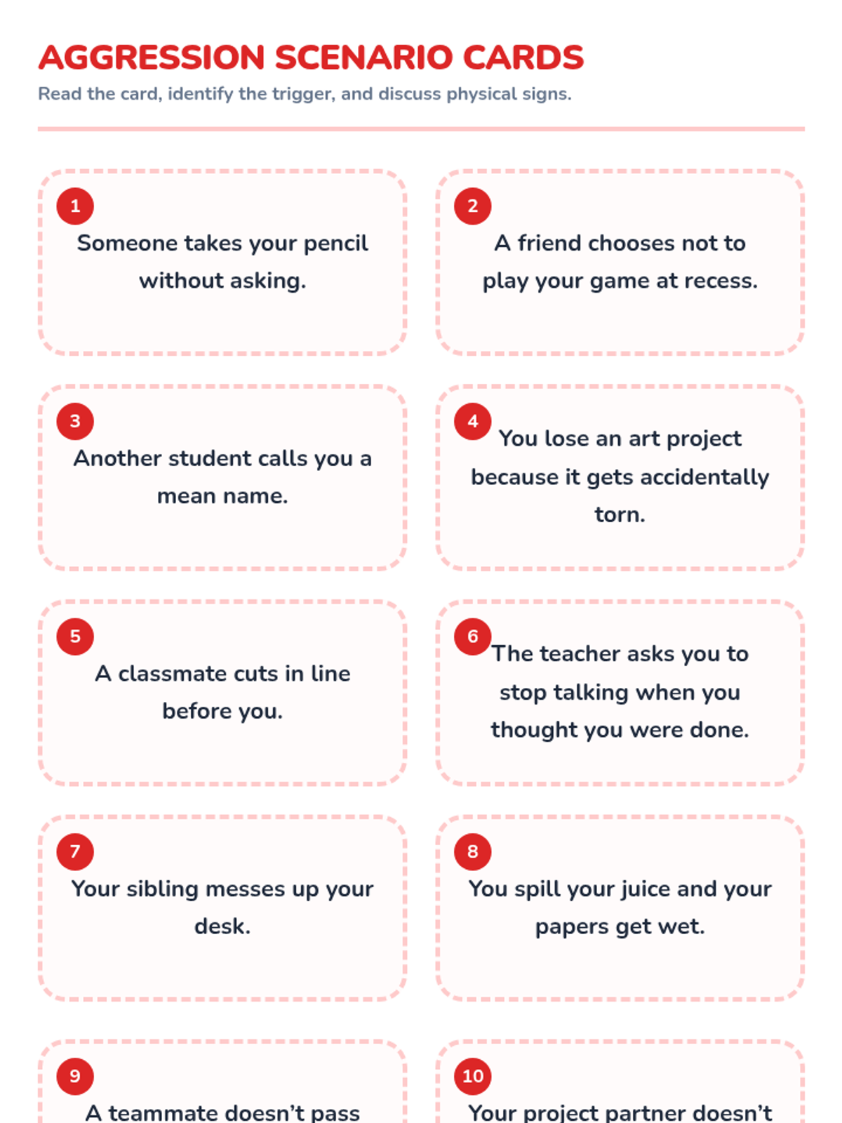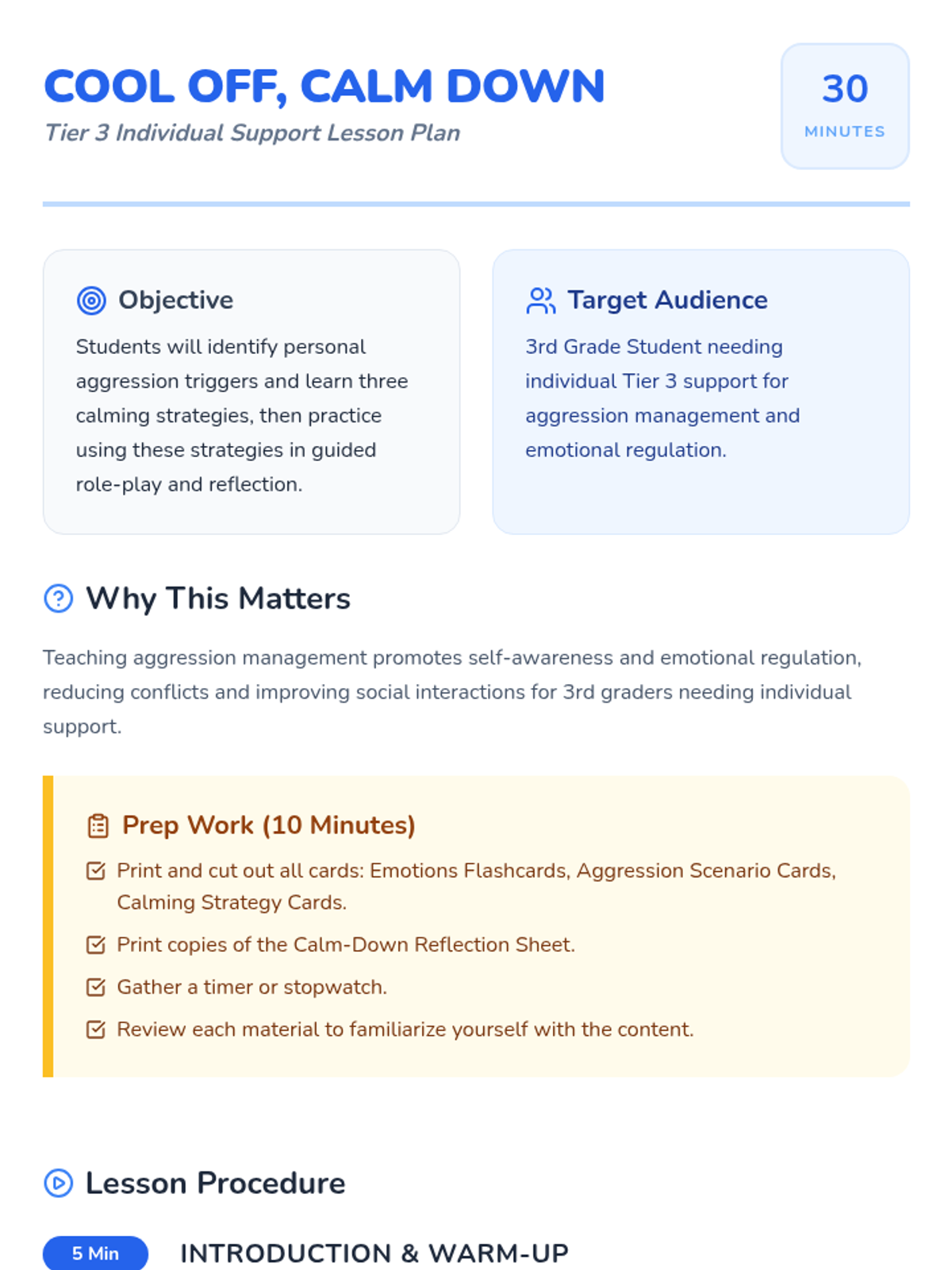A 30-minute one-on-one intervention for 3rd graders focused on identifying anger triggers and practicing calming strategies to manage aggression.