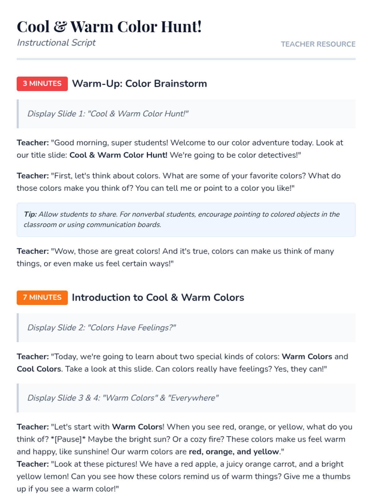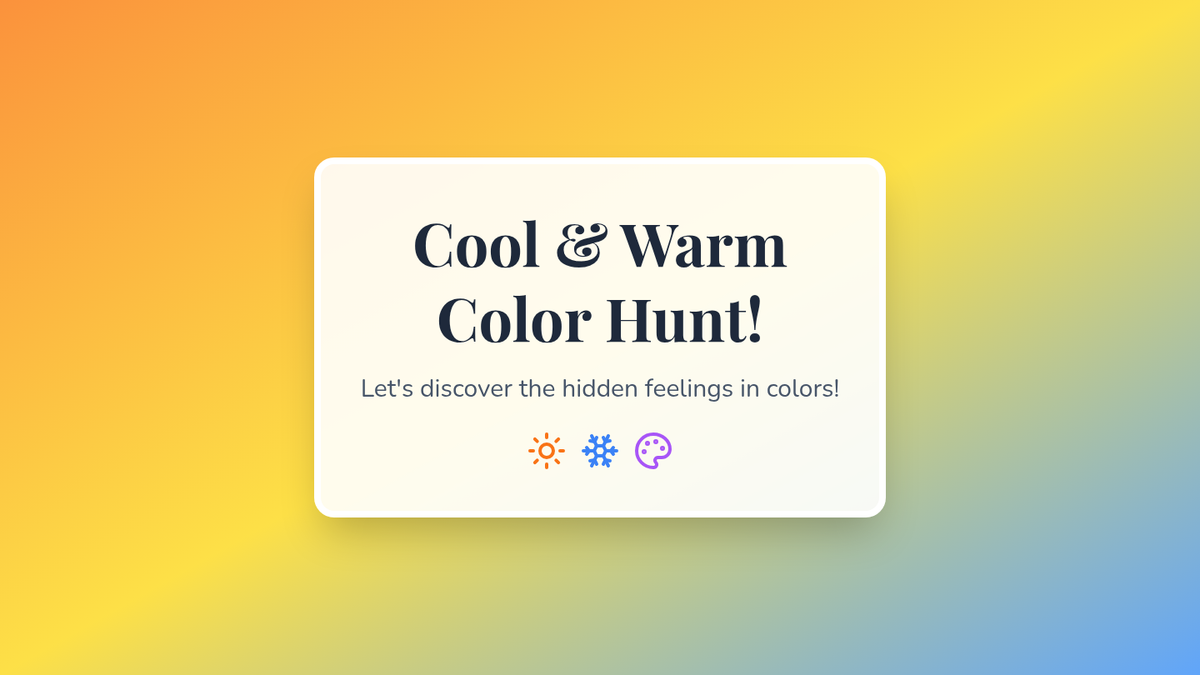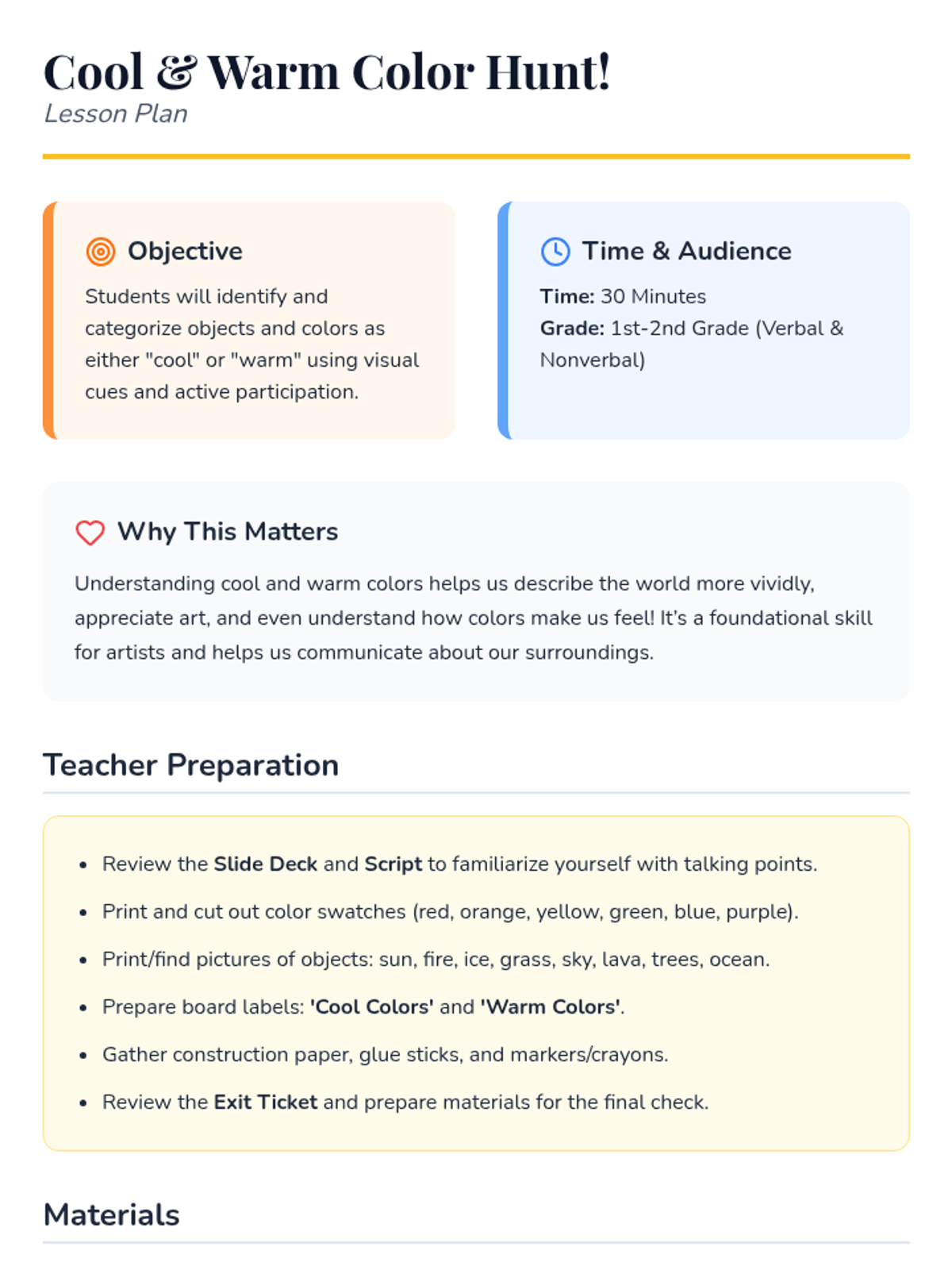 A 30-minute introductory art lesson where 1st-2nd grade students explore color theory by identifying and categorizing warm and cool colors in their environment. The lesson uses interactive slides, a guided script, and hands-on coloring activities to build color recognition skills.