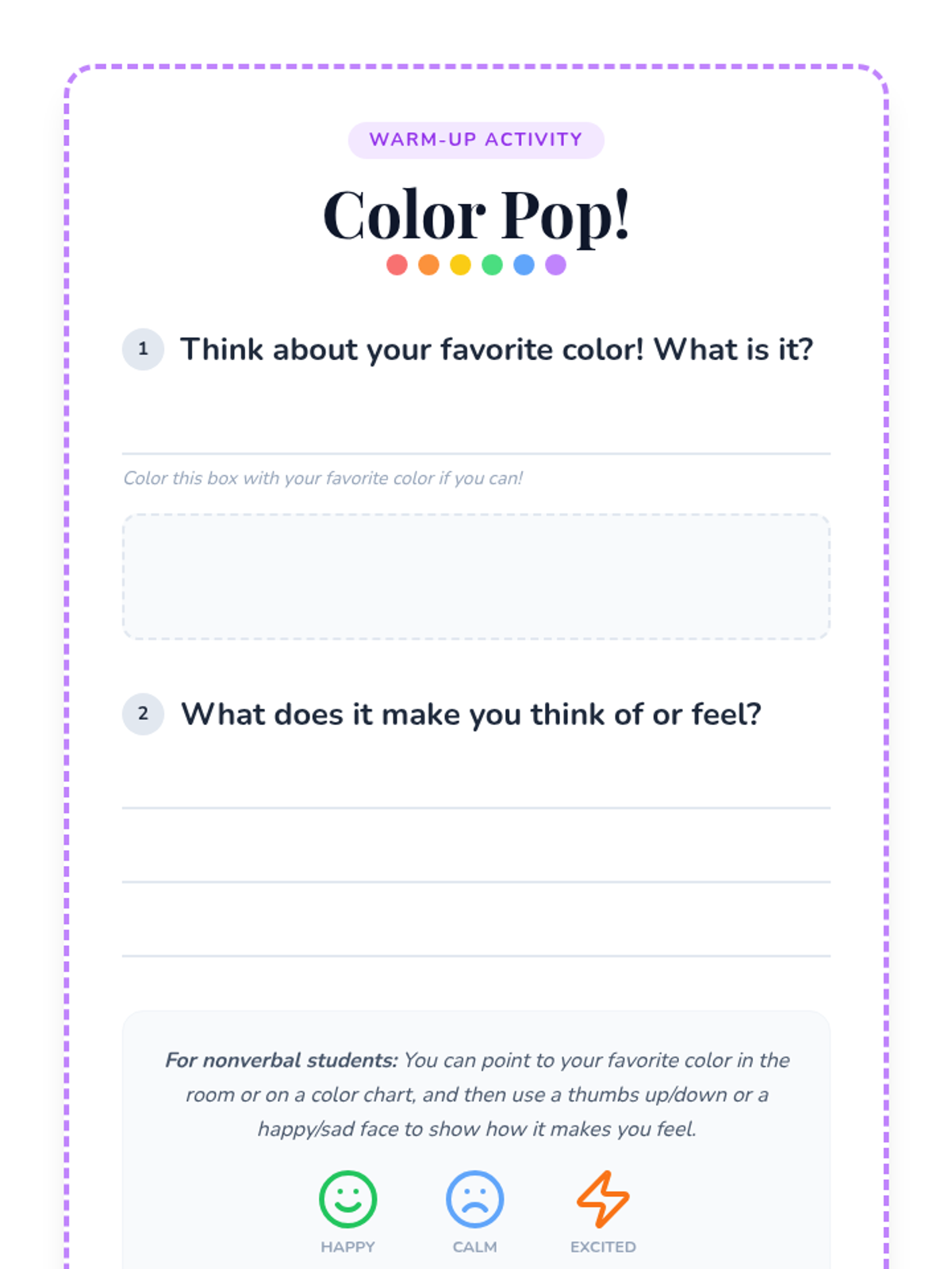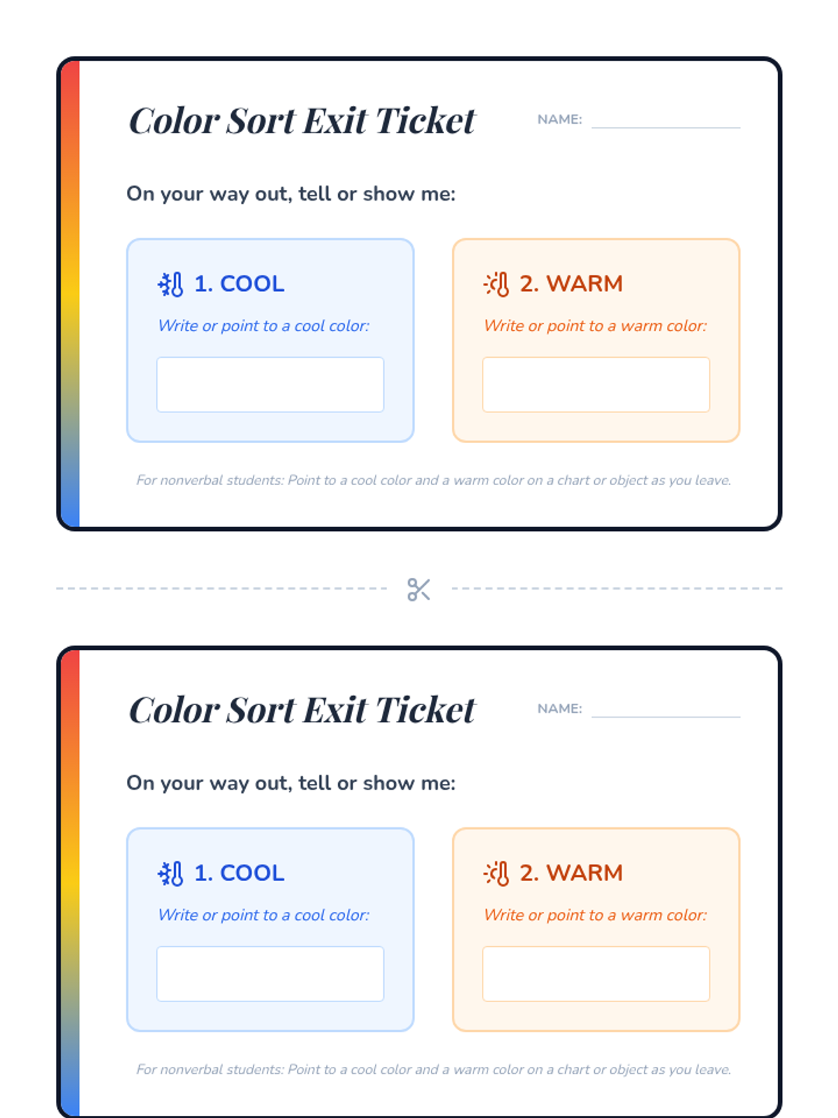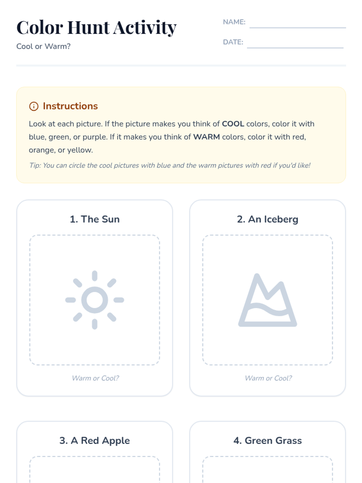 A 30-minute introductory art lesson where 1st-2nd grade students explore color theory by identifying and categorizing warm and cool colors in their environment. The lesson uses interactive slides, a guided script, and hands-on coloring activities to build color recognition skills.