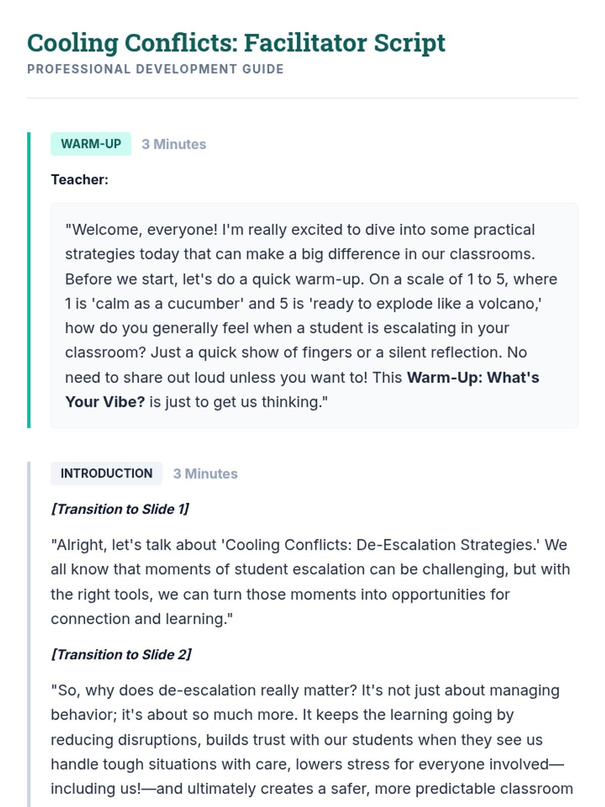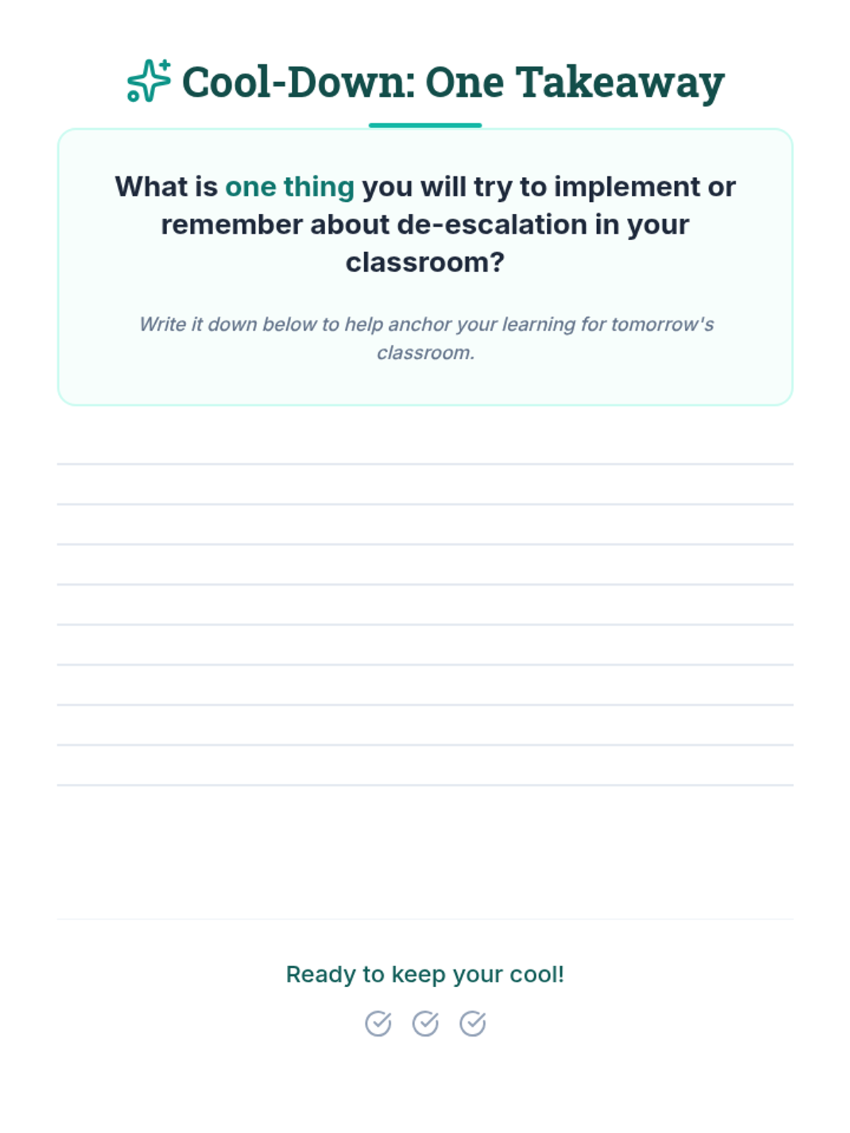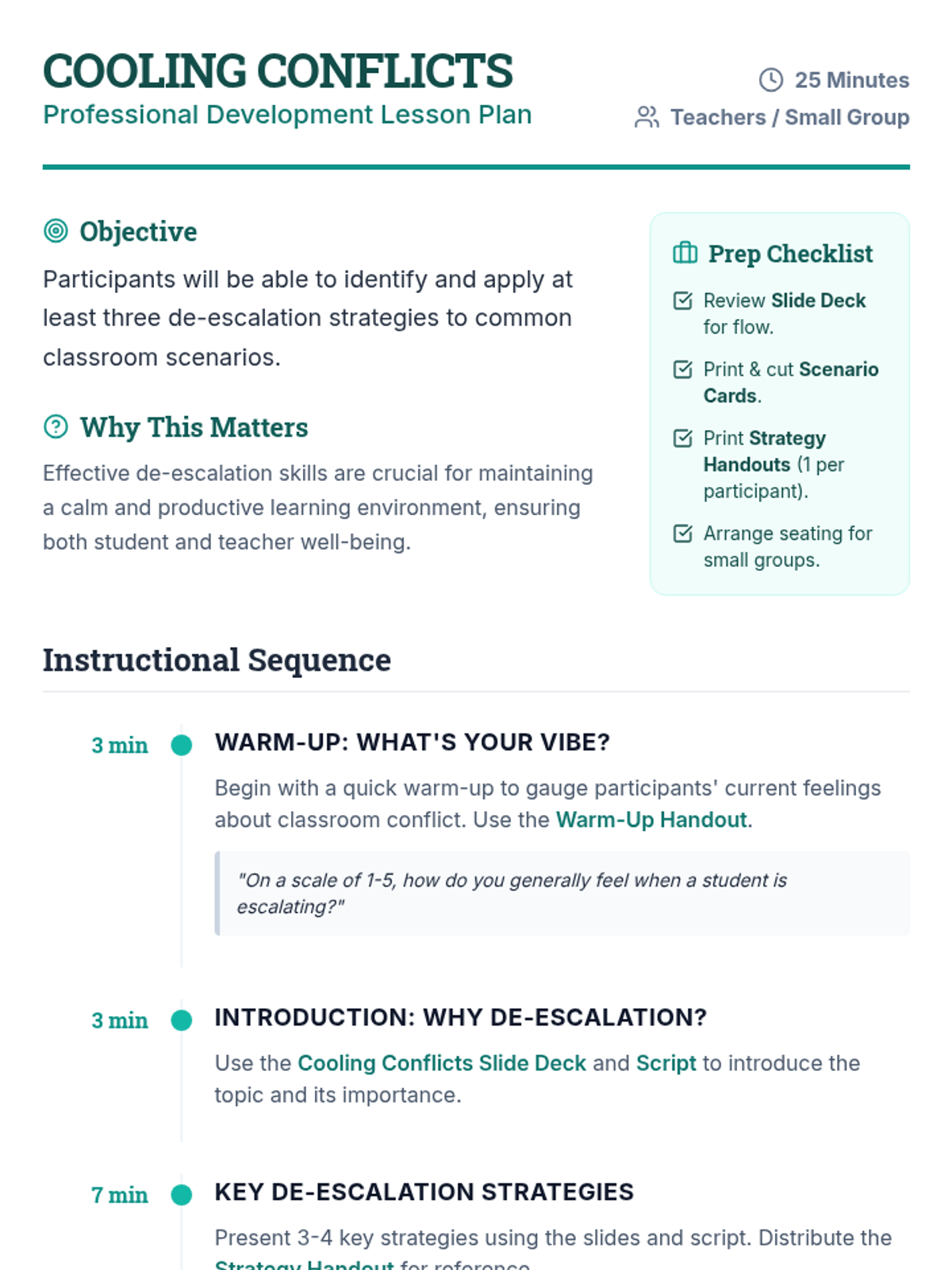 A 25-minute professional development session for teachers focusing on practical de-escalation strategies to manage classroom conflicts and maintain a positive learning environment.