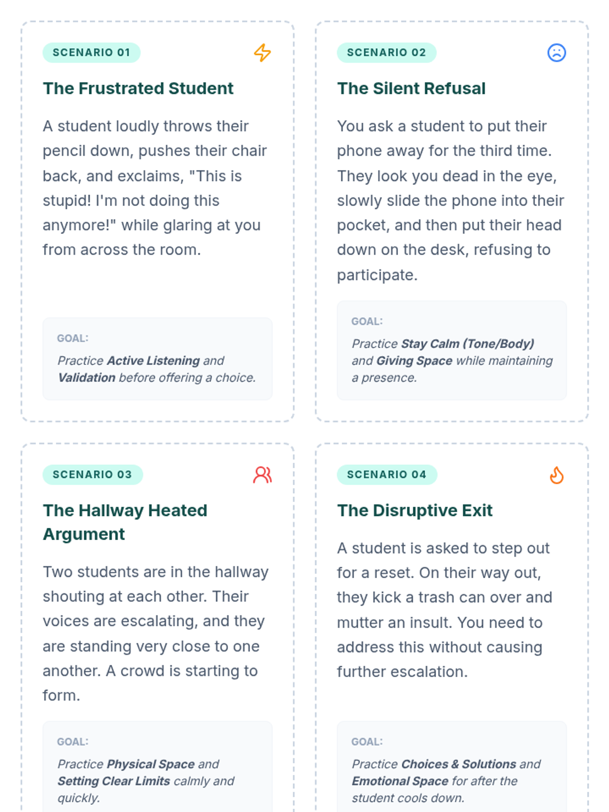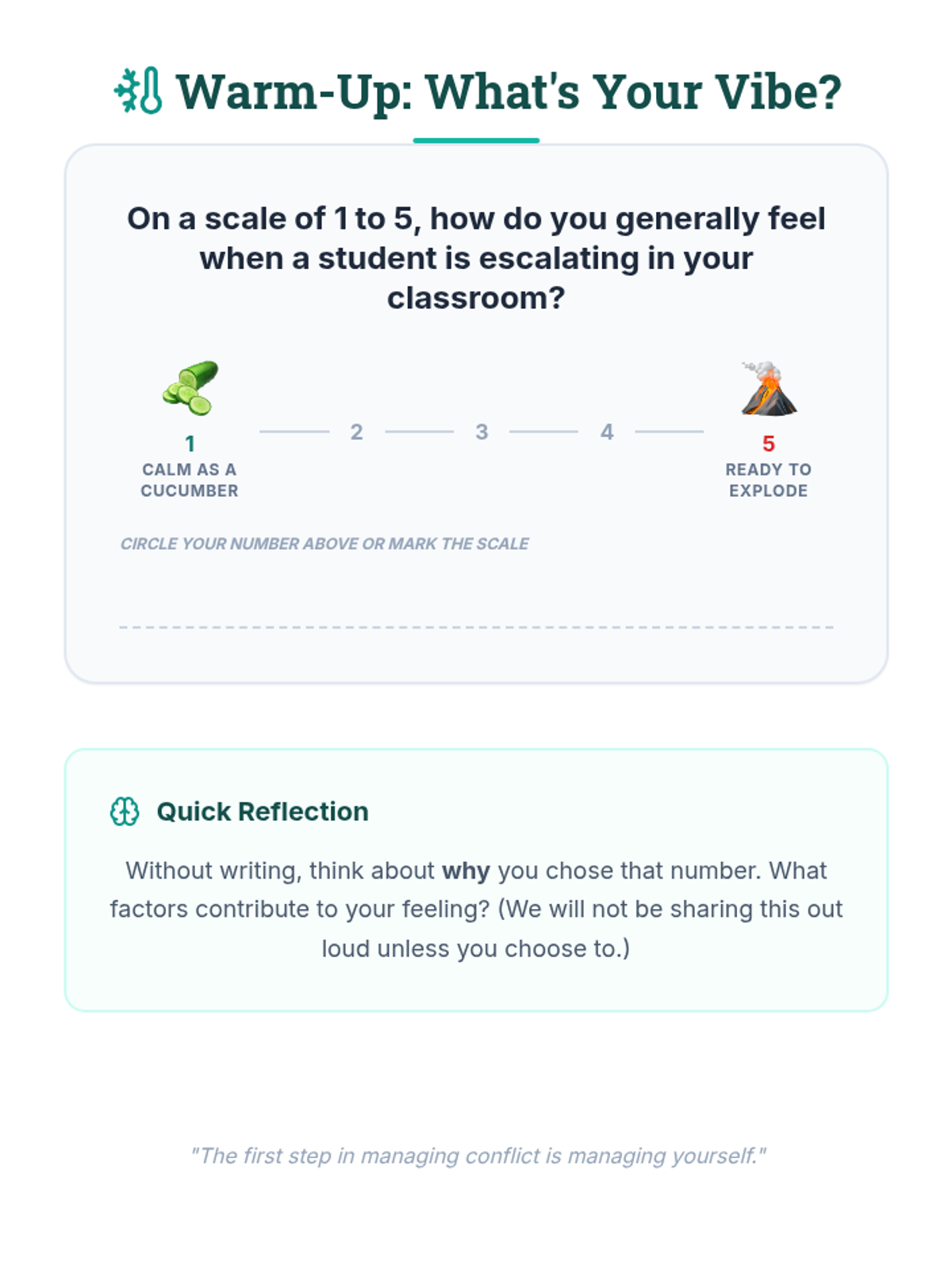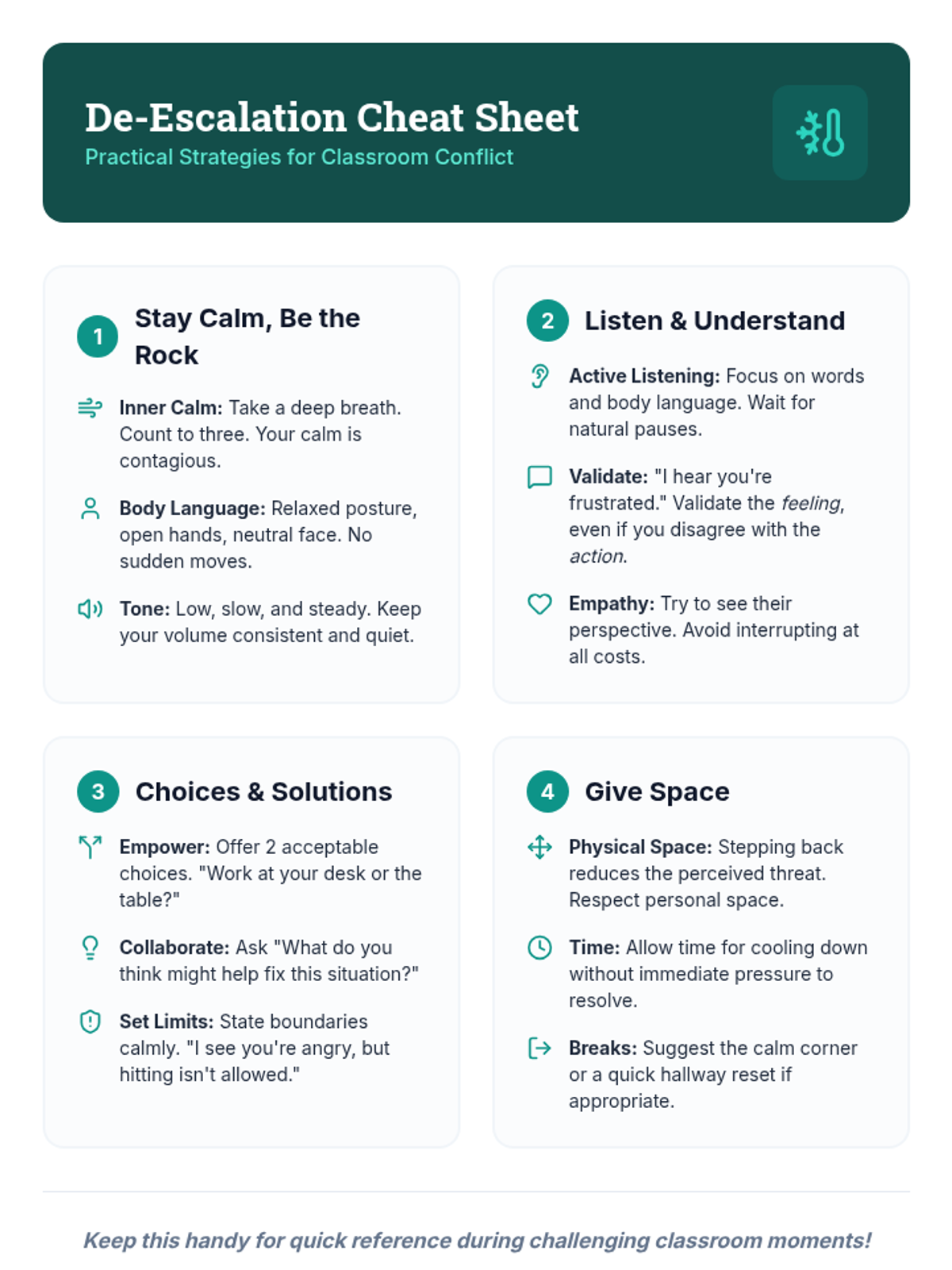 A 25-minute professional development session for teachers focusing on practical de-escalation strategies to manage classroom conflicts and maintain a positive learning environment.