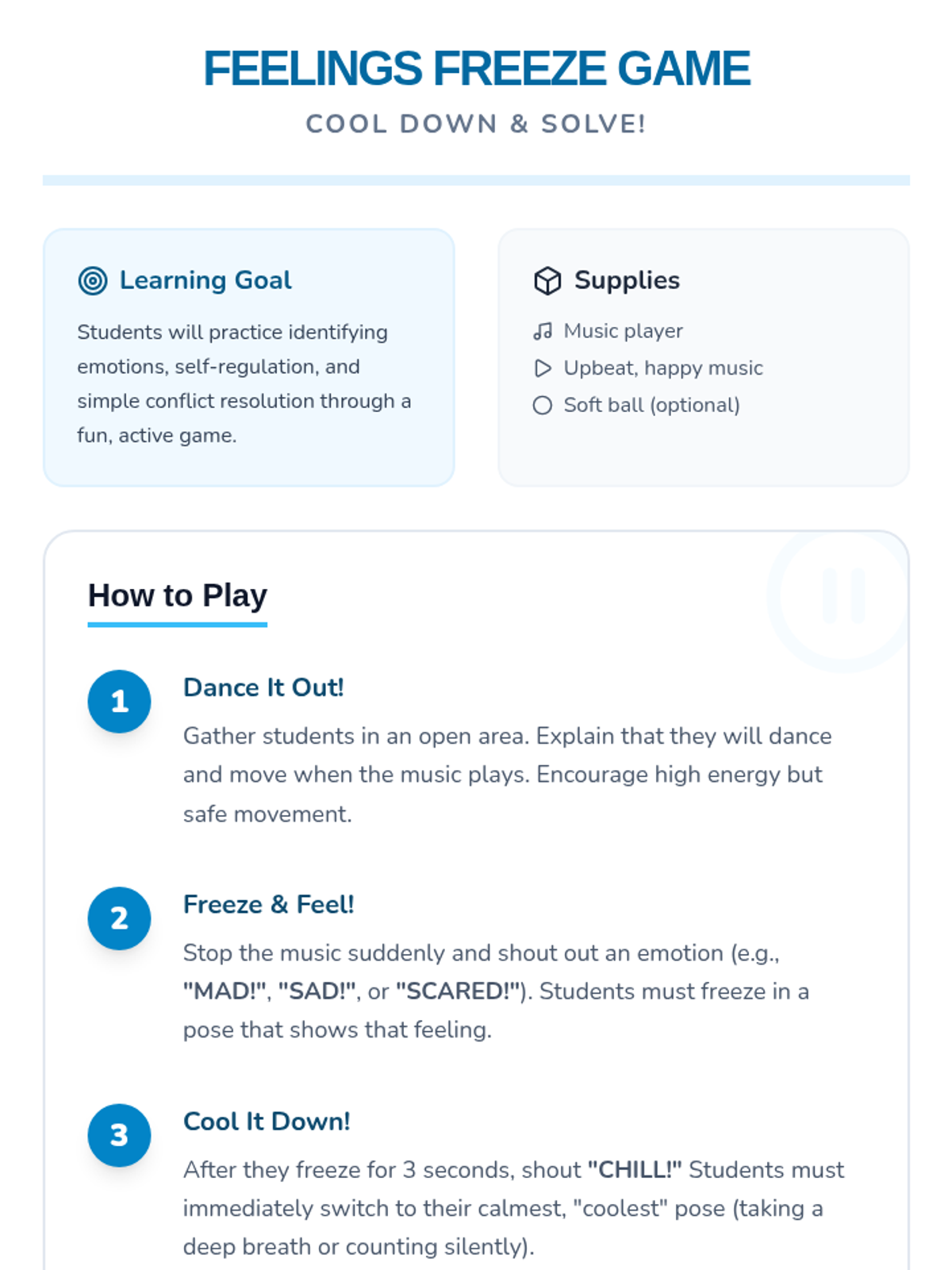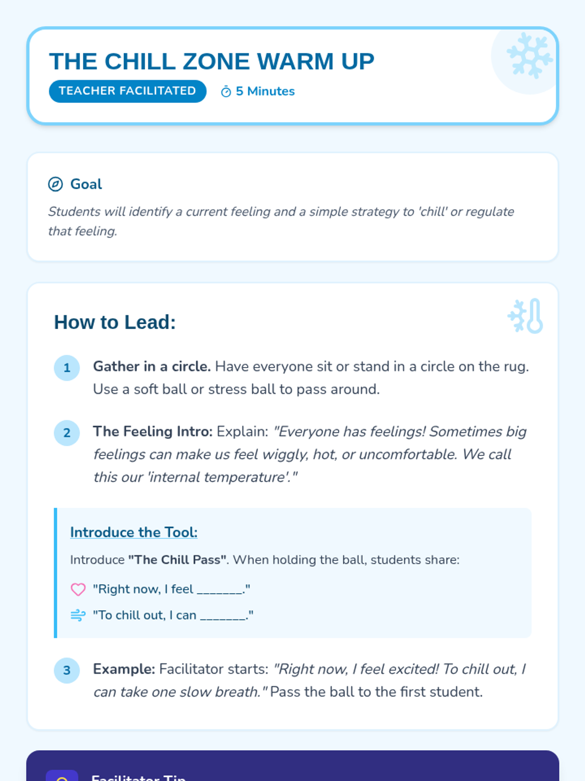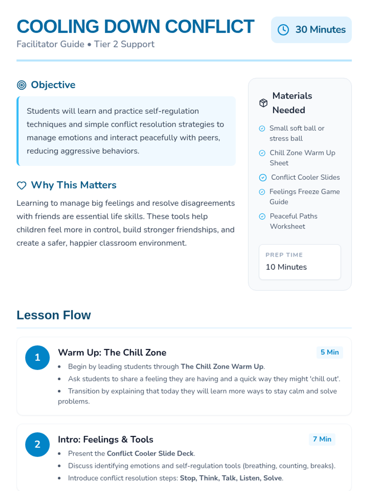 A Tier 2 social-emotional learning lesson for K-2 students focused on self-regulation and peaceful conflict resolution through the 'Chill Zone' framework.