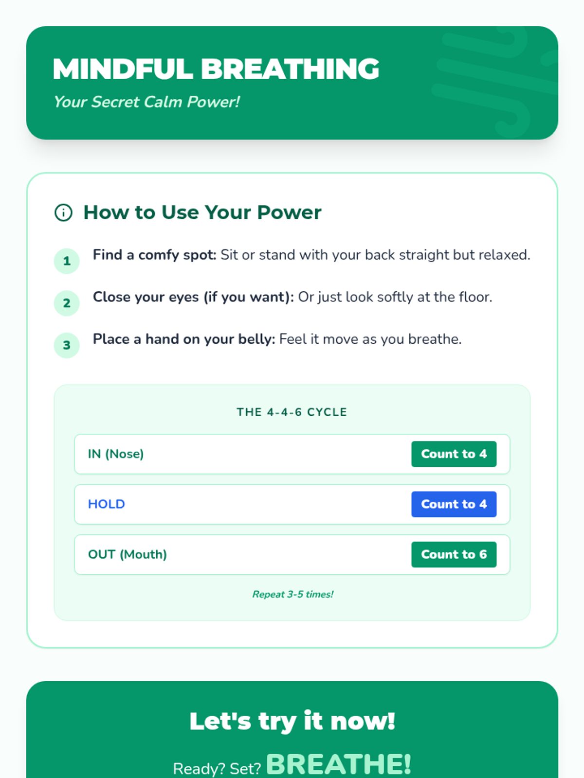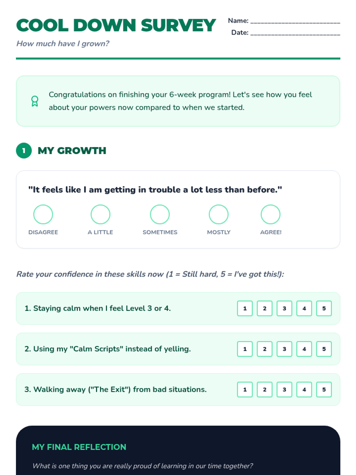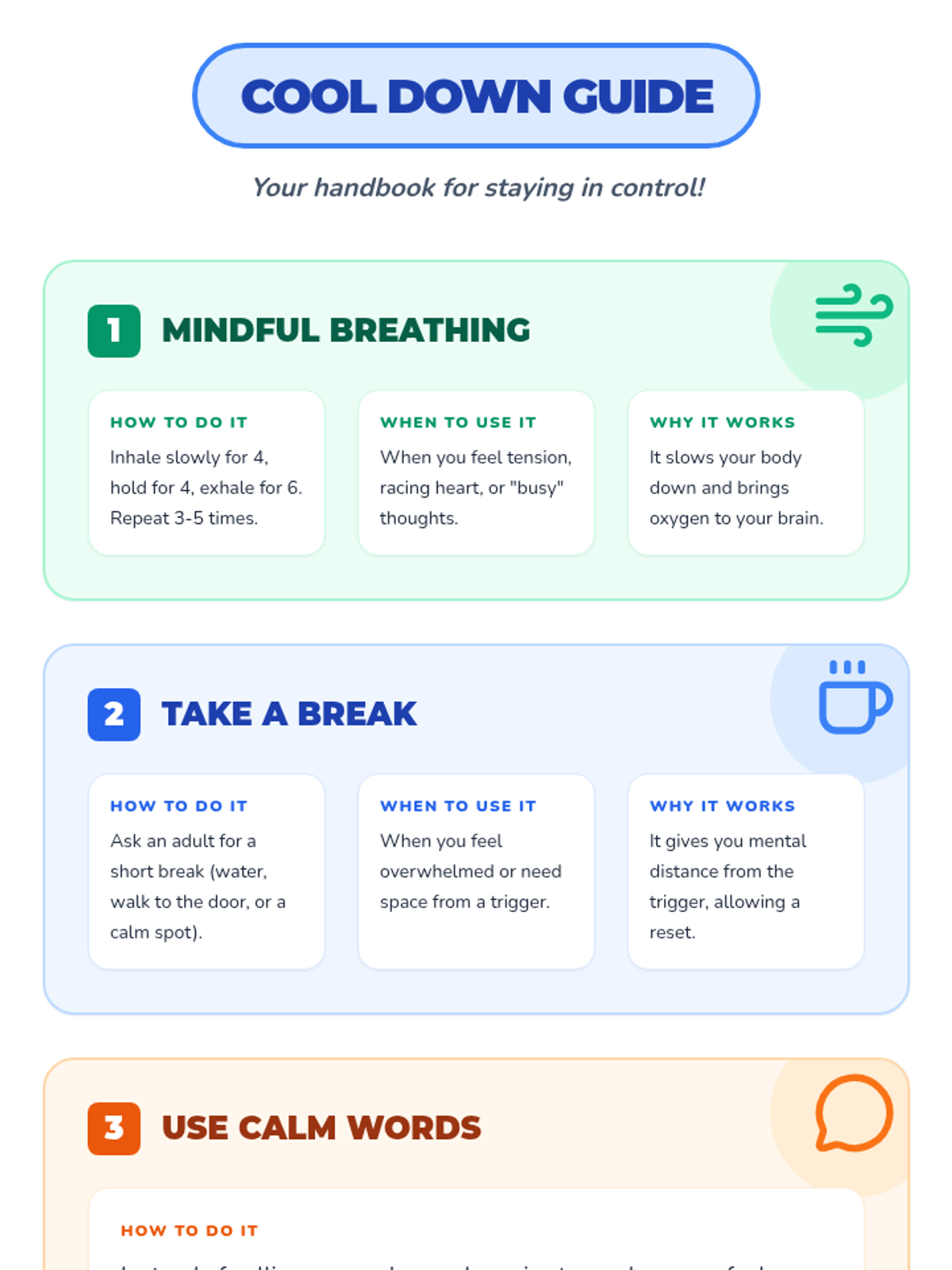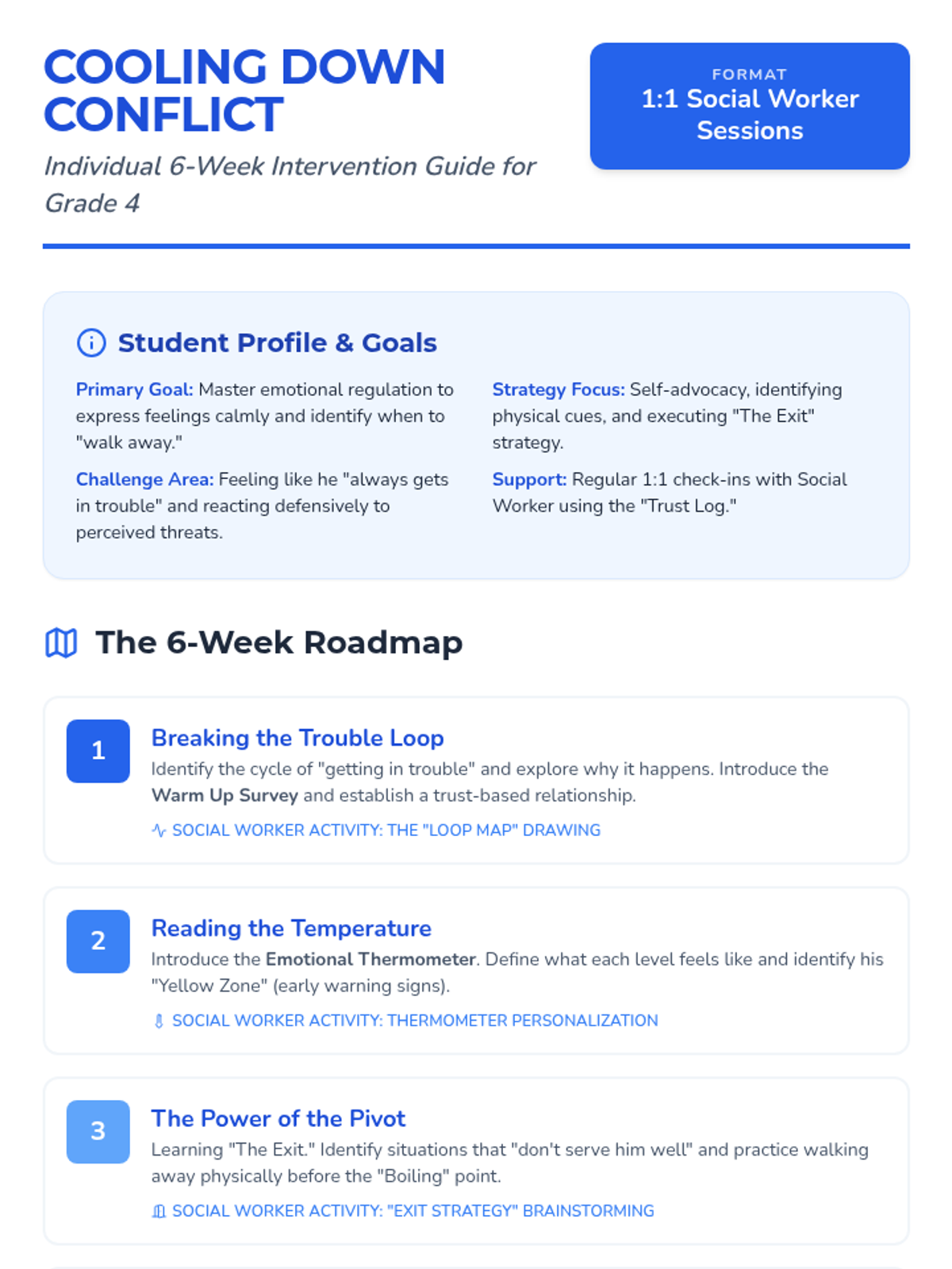 A 6-week Tier 3 intervention for 4th-grade students focusing on self-regulation, anger management, and active listening. Students learn to identify triggers like personal space invasion and verbal threats, while practicing mindful breathing and calm communication.