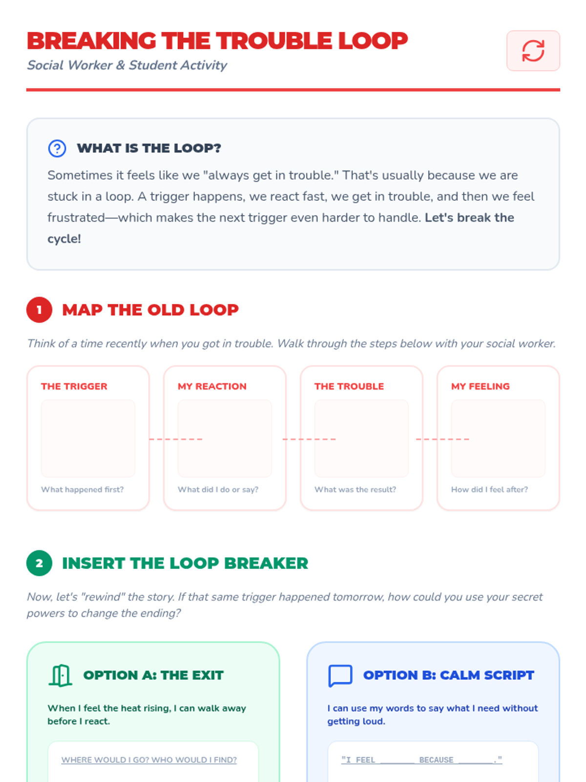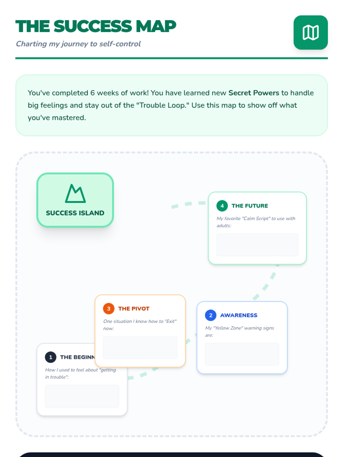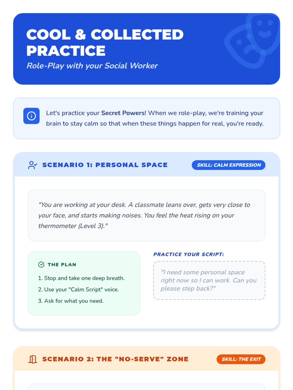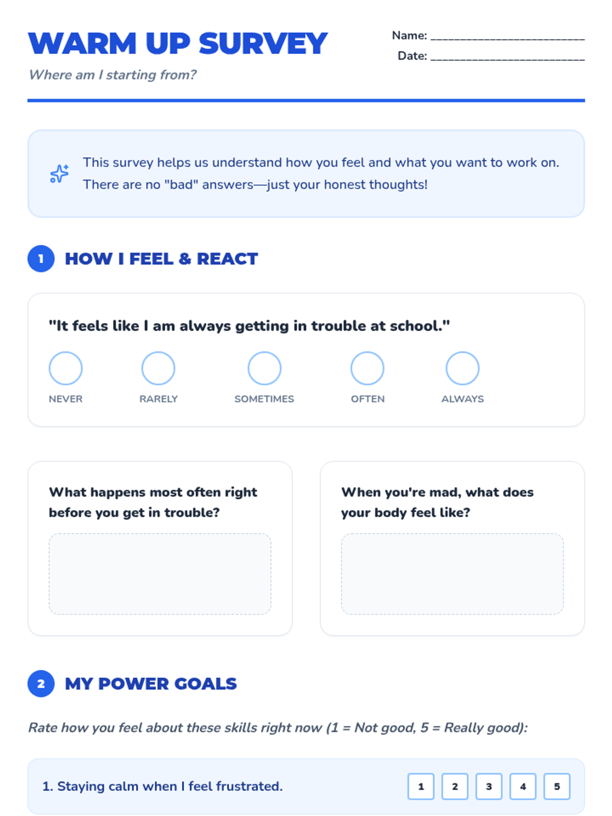 A 6-week Tier 3 intervention for 4th-grade students focusing on self-regulation, anger management, and active listening. Students learn to identify triggers like personal space invasion and verbal threats, while practicing mindful breathing and calm communication.