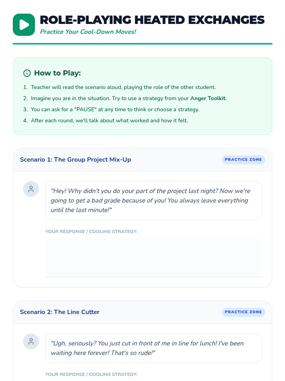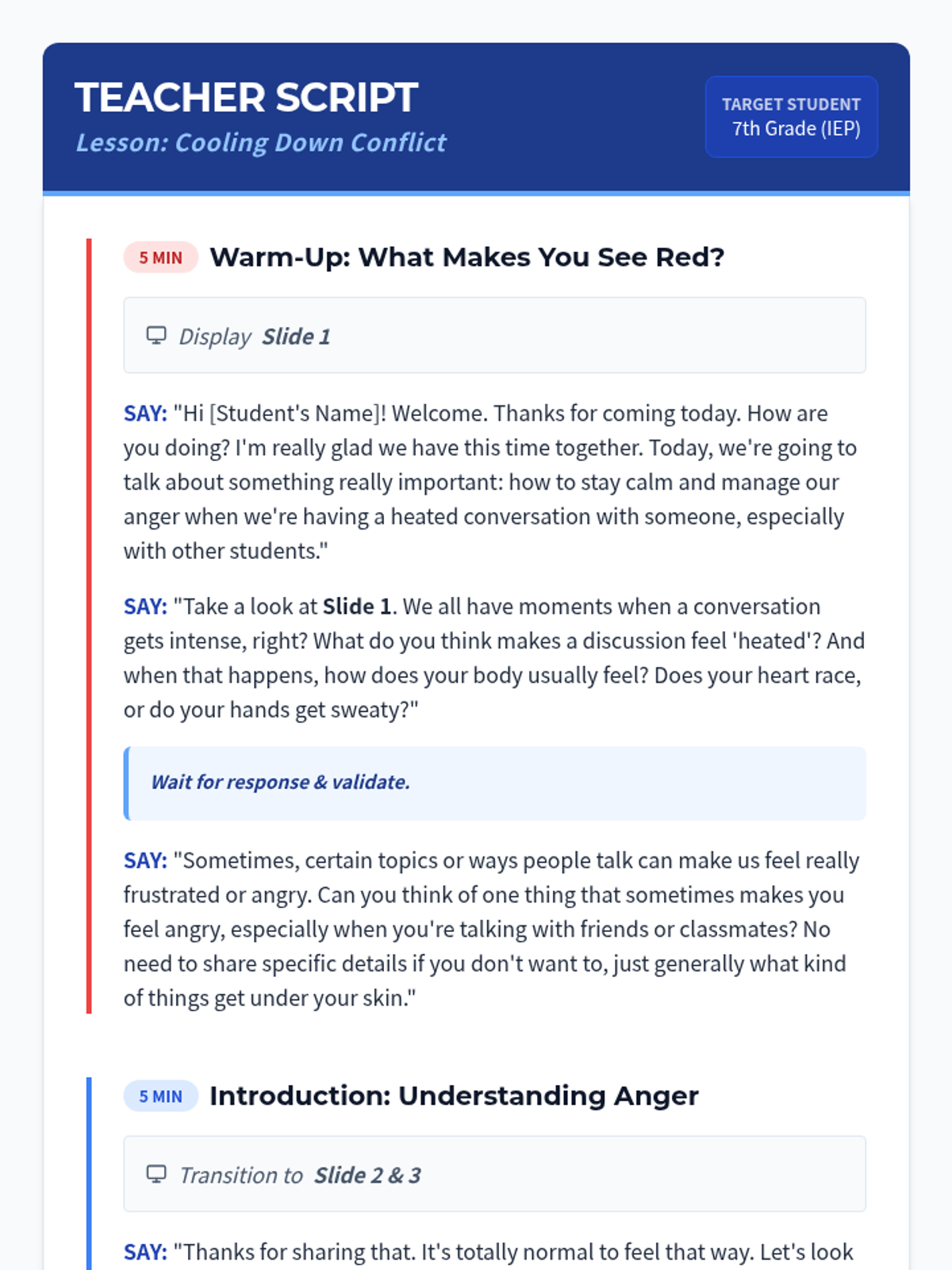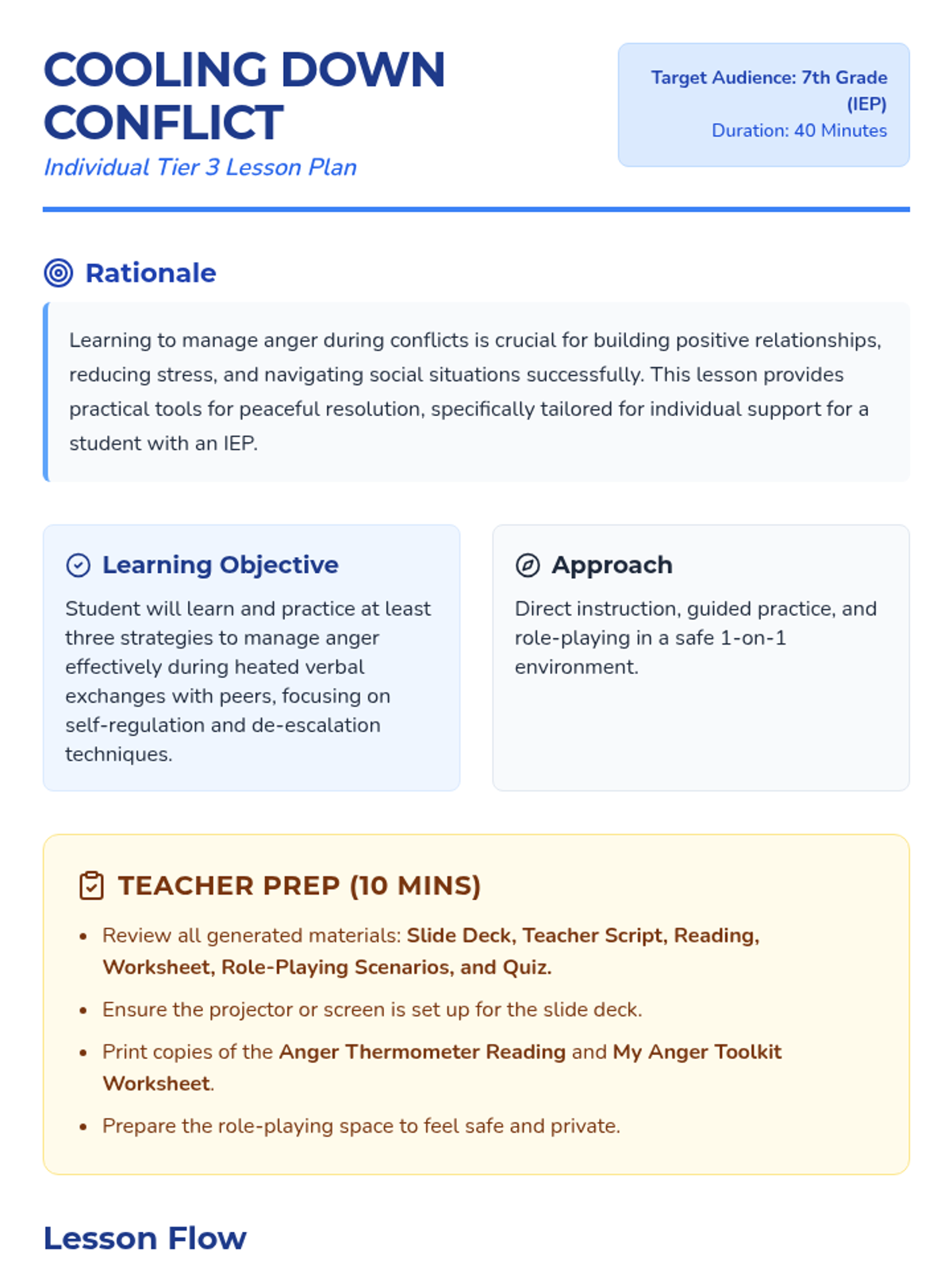 A 40-minute Tier 3 individual lesson for 7th-grade students with IEPs focused on developing anger management strategies and de-escalation techniques during heated peer conflicts.