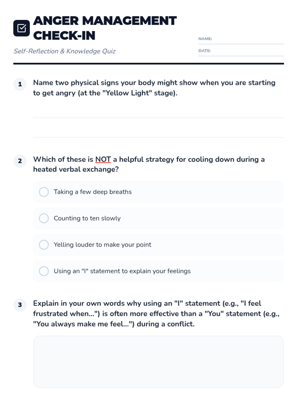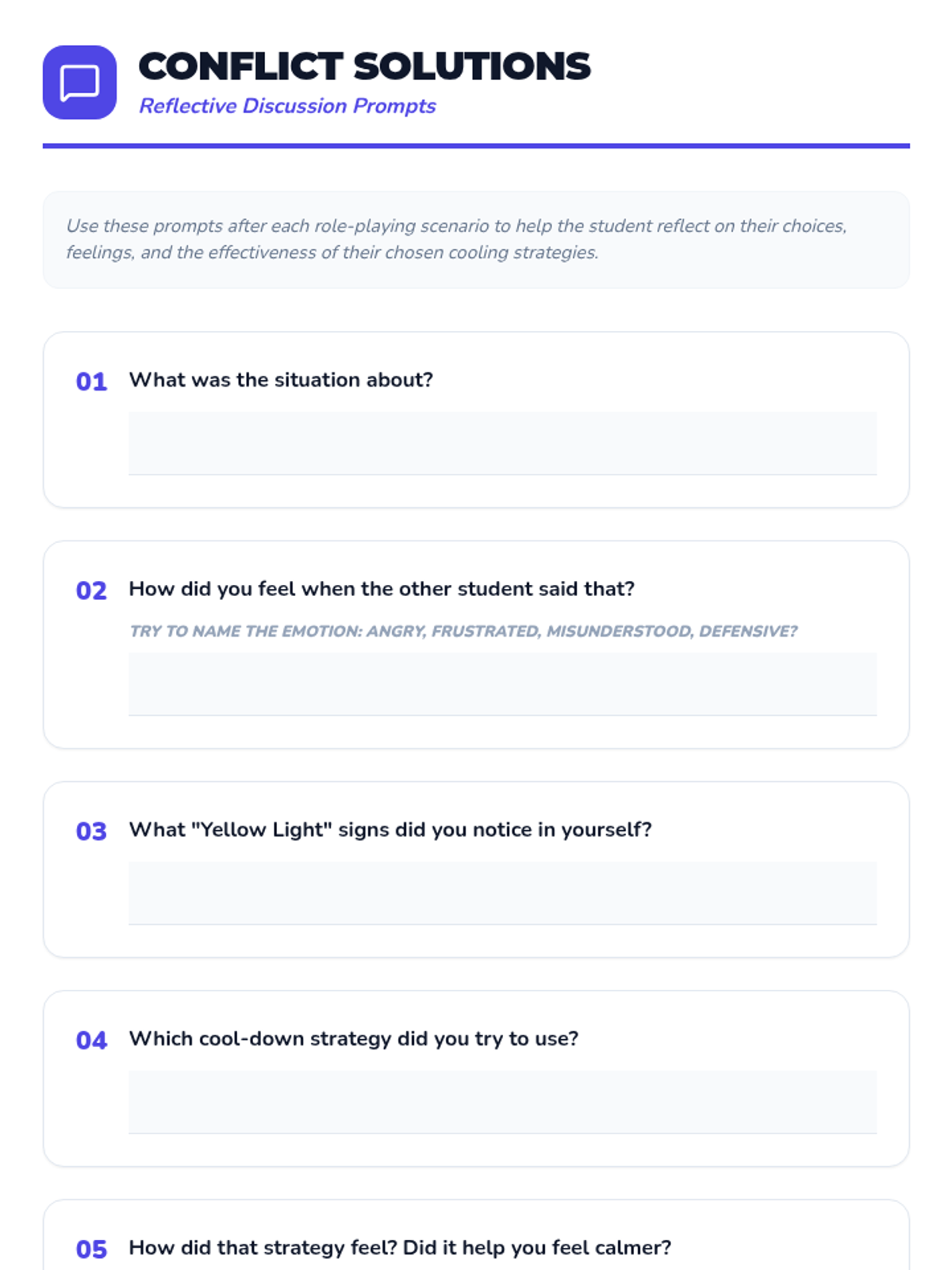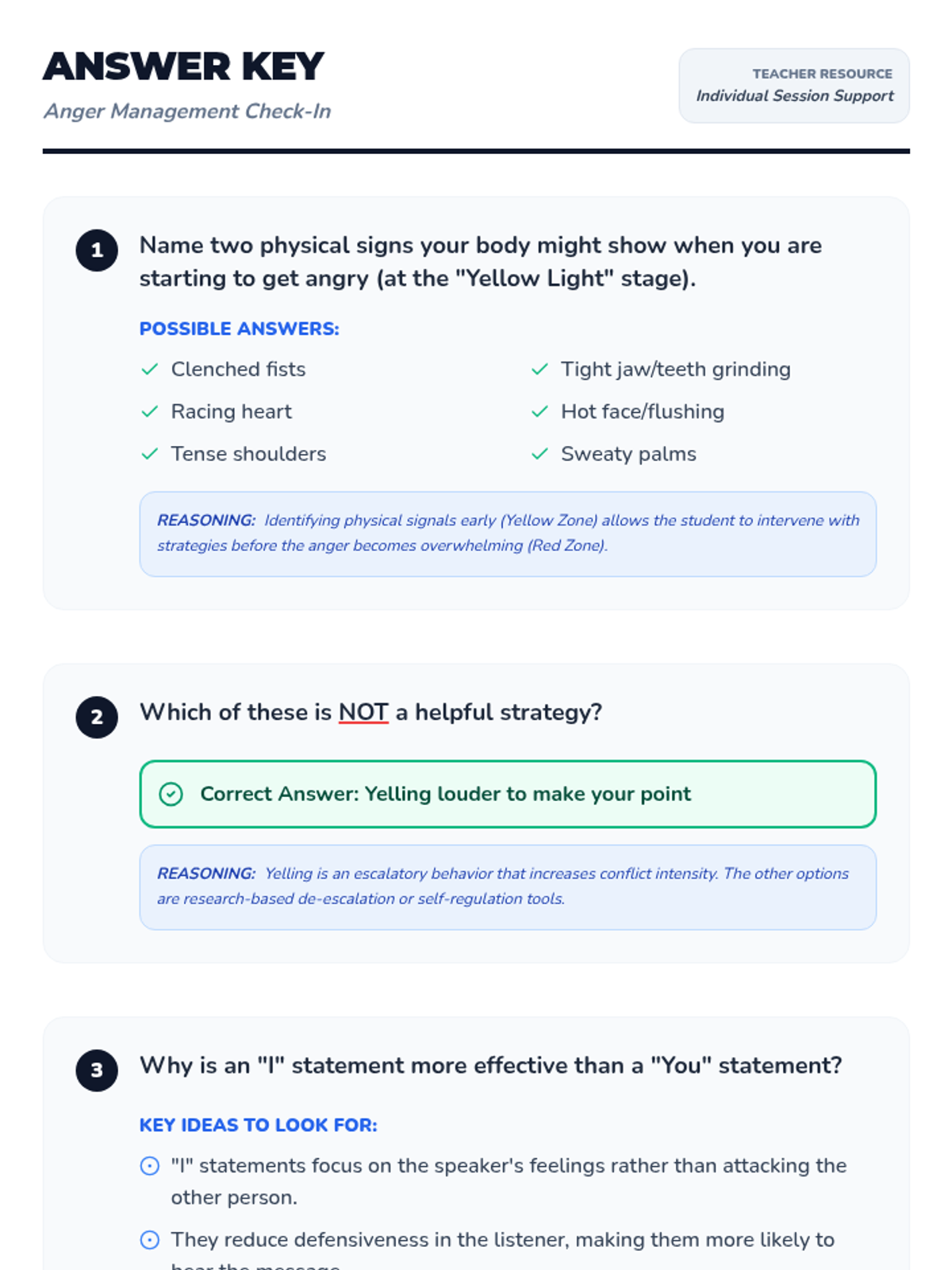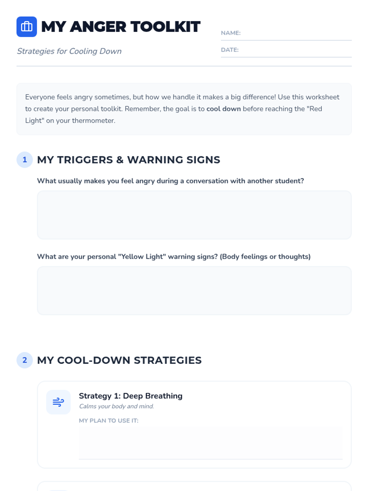 A 40-minute Tier 3 individual lesson for 7th-grade students with IEPs focused on developing anger management strategies and de-escalation techniques during heated peer conflicts.