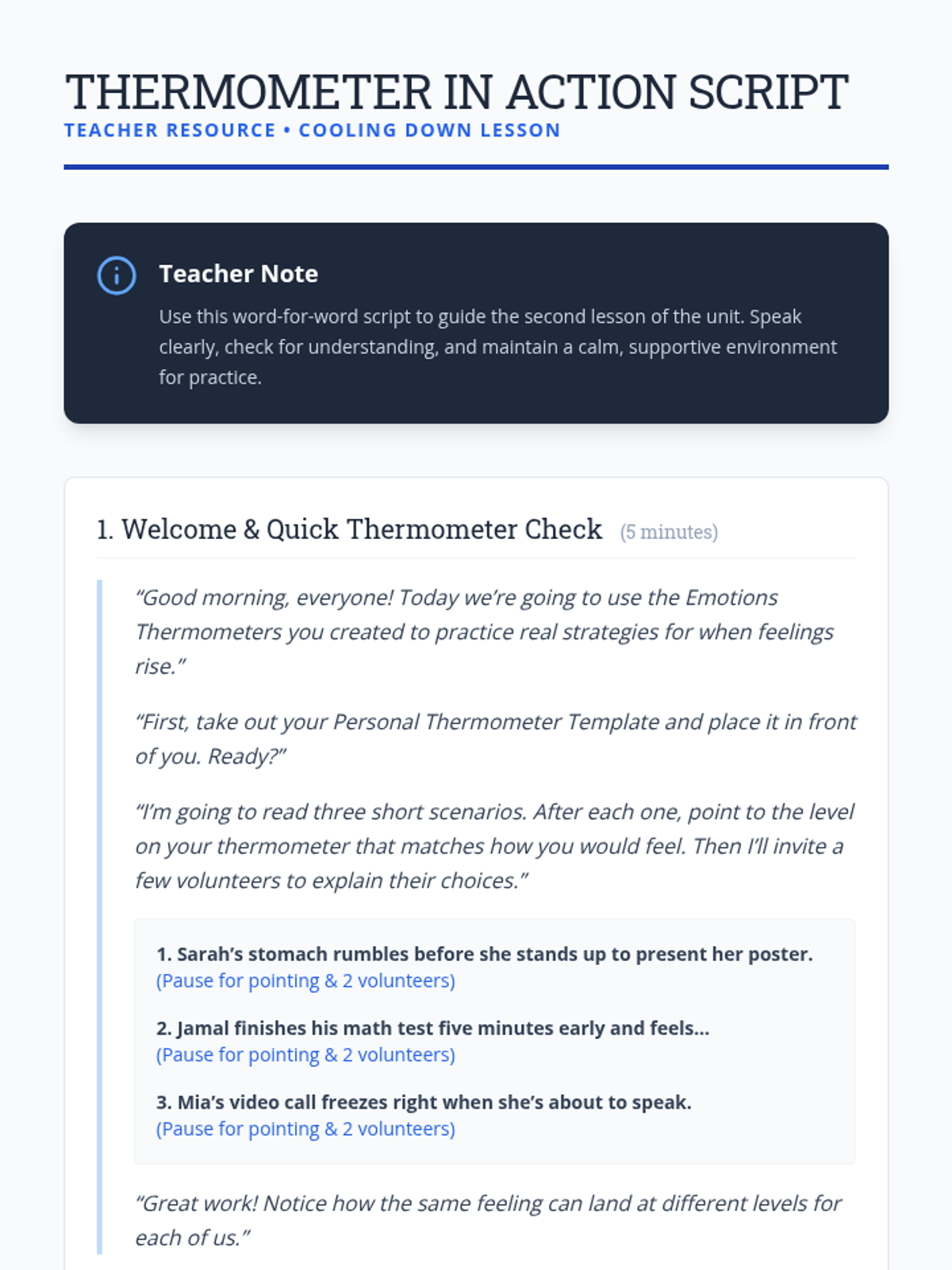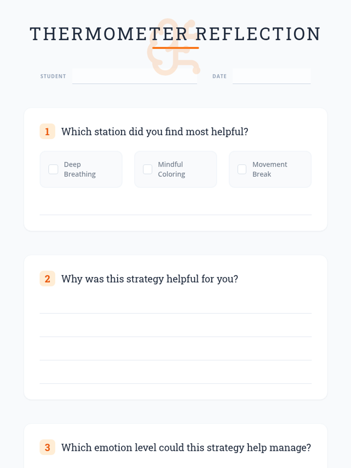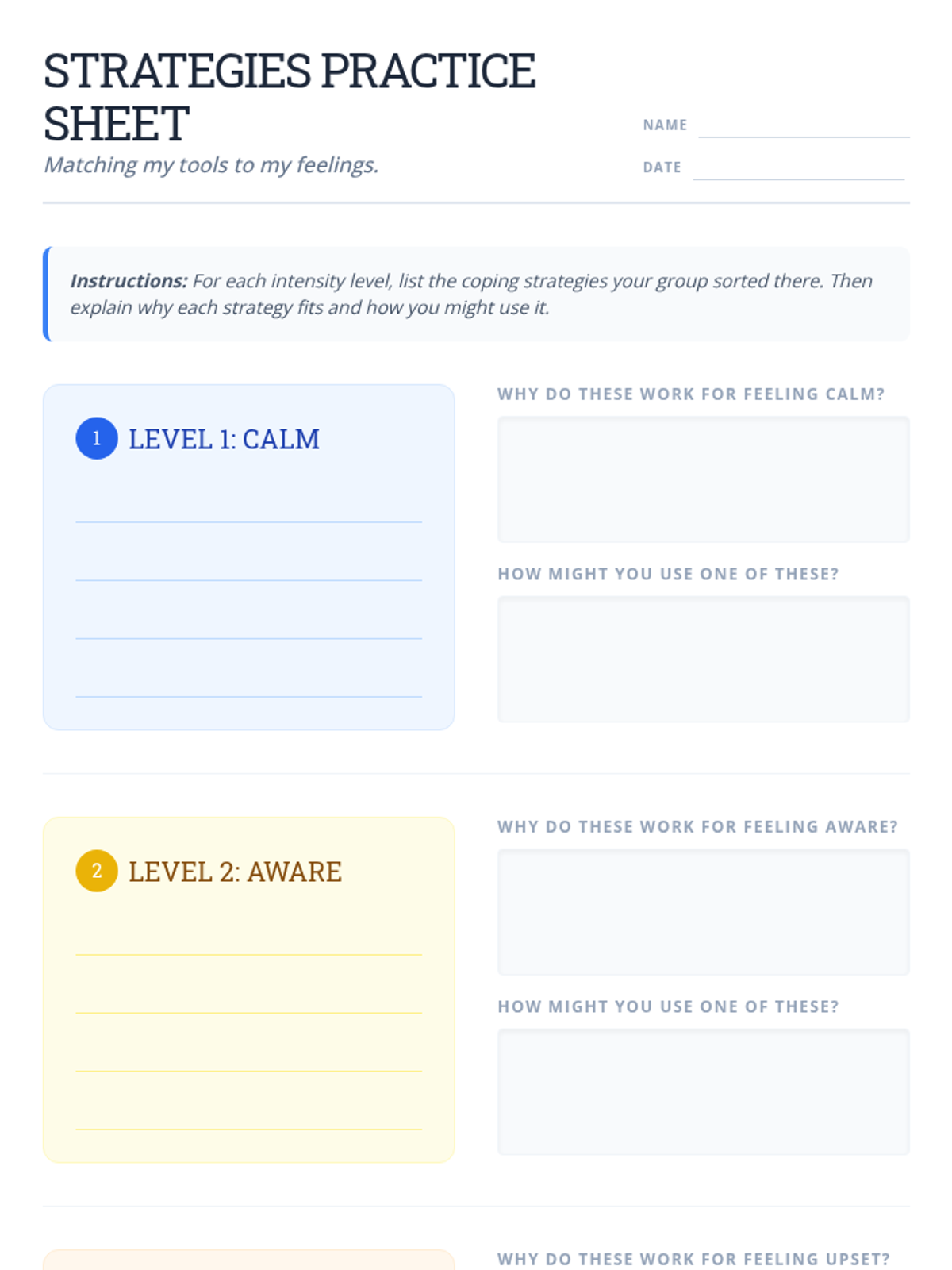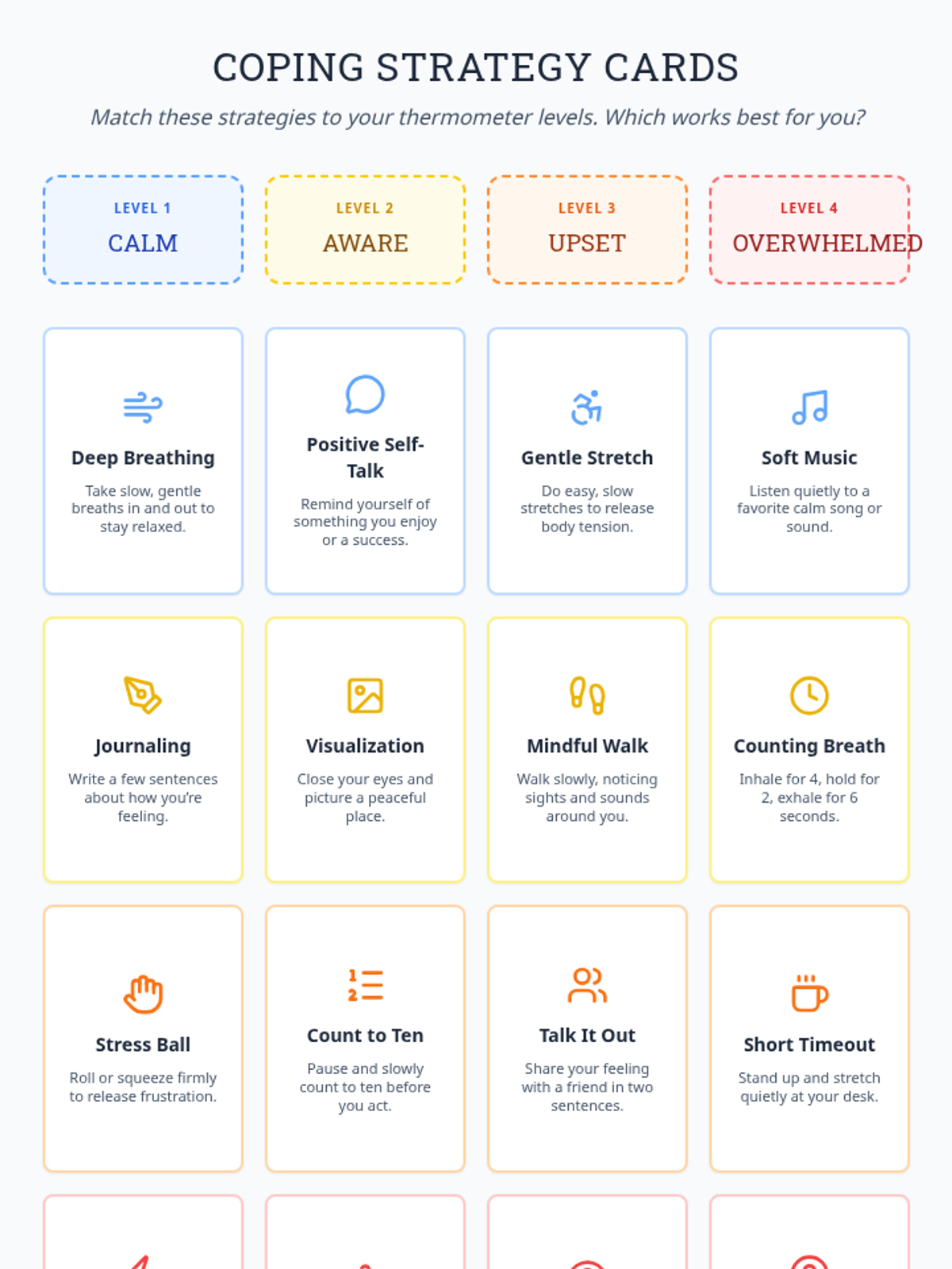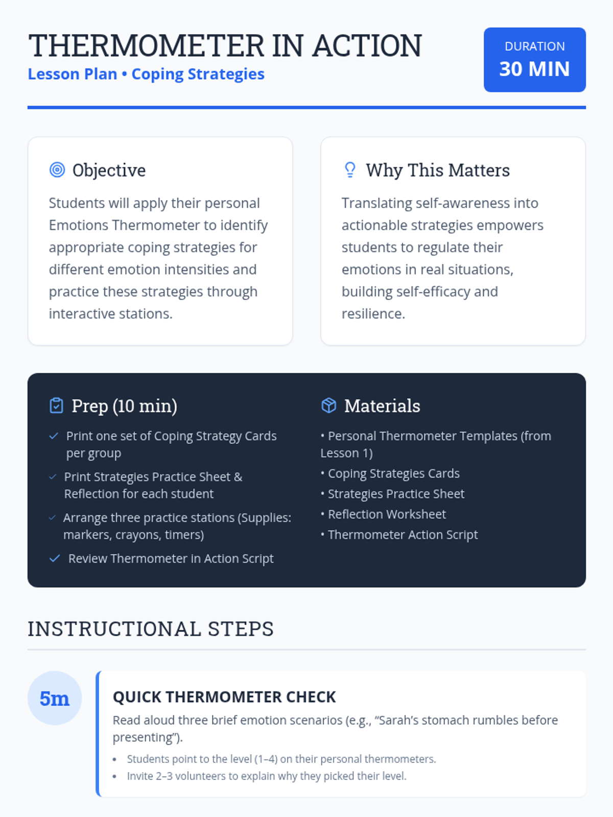 Students apply their emotional thermometers to match and practice coping strategies for different intensity levels, moving from awareness to regulation.
