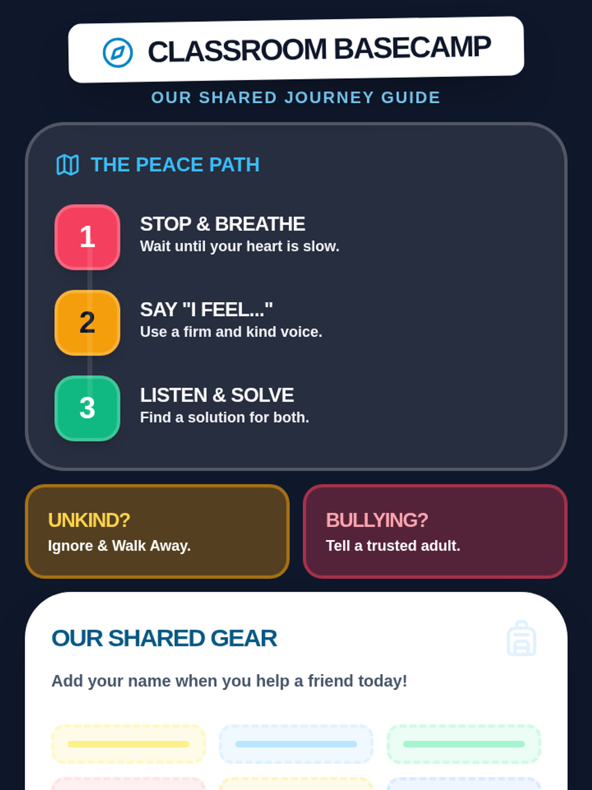Applies regulation tools to social situations, including conflict resolution steps and handling unkind behavior or bullying.