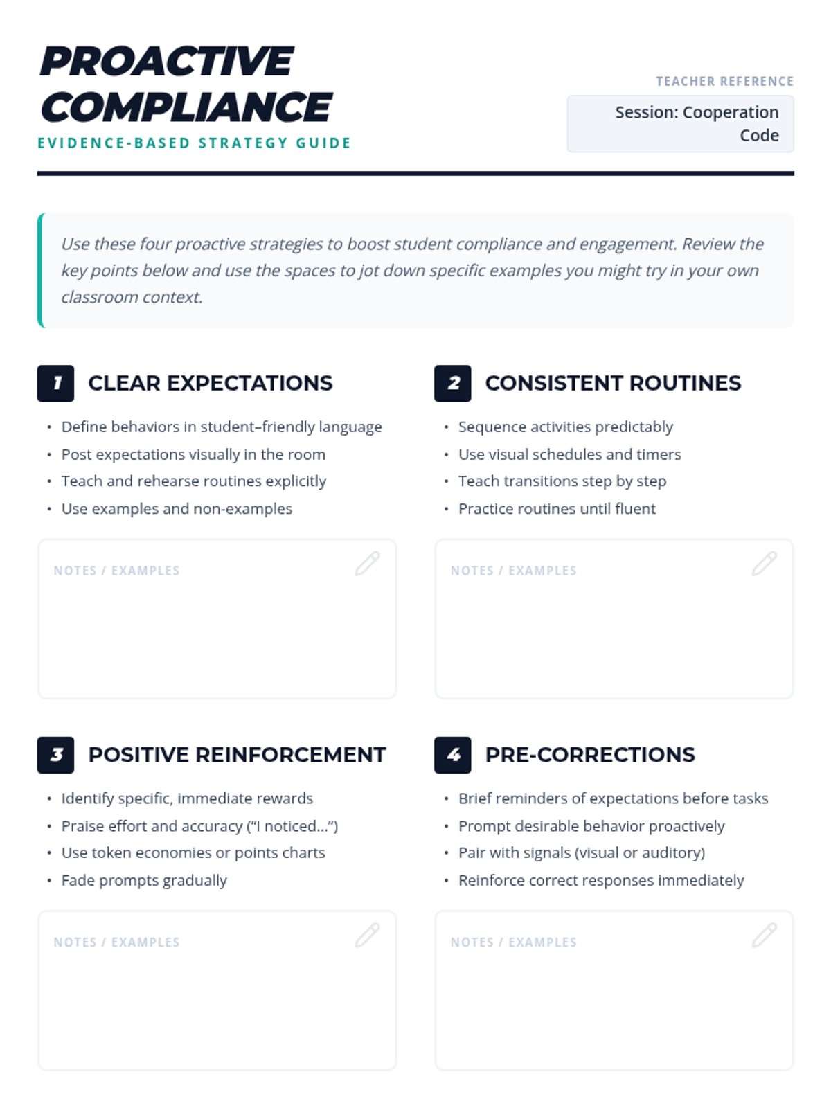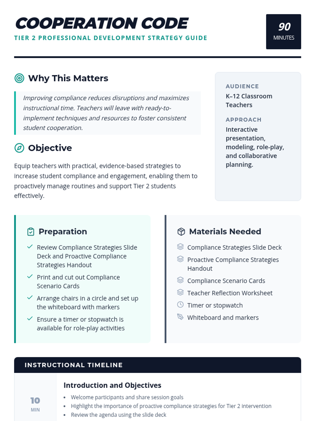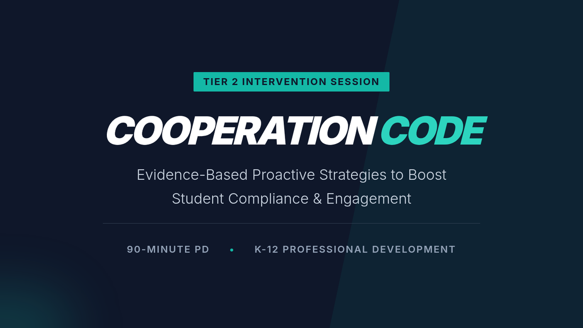 A 90-minute Tier 2 professional development session for K-12 teachers focusing on evidence-based proactive strategies to improve student compliance and engagement. Teachers will practice modeling, role-play, and action planning to support students struggling with classroom routines.
