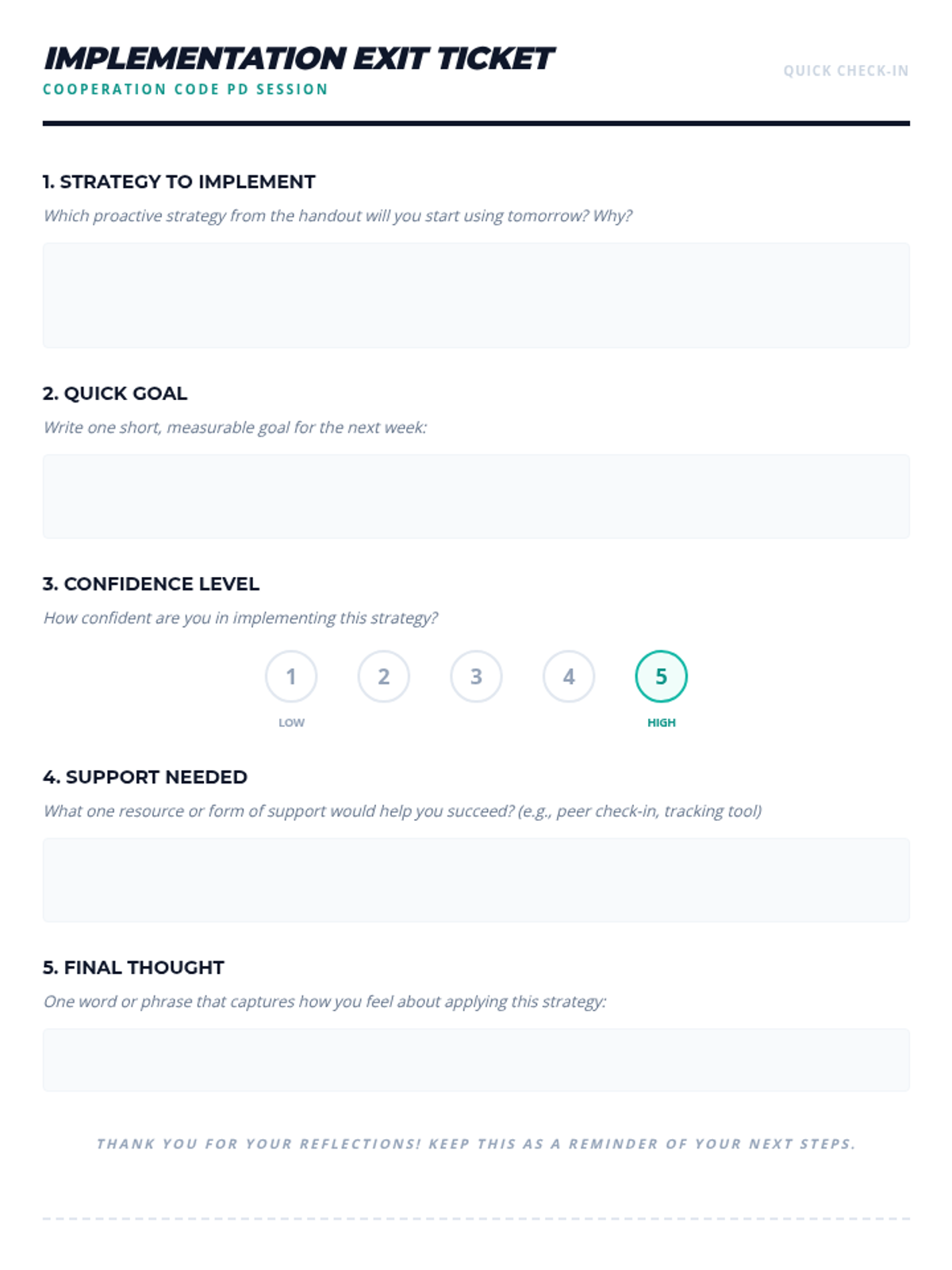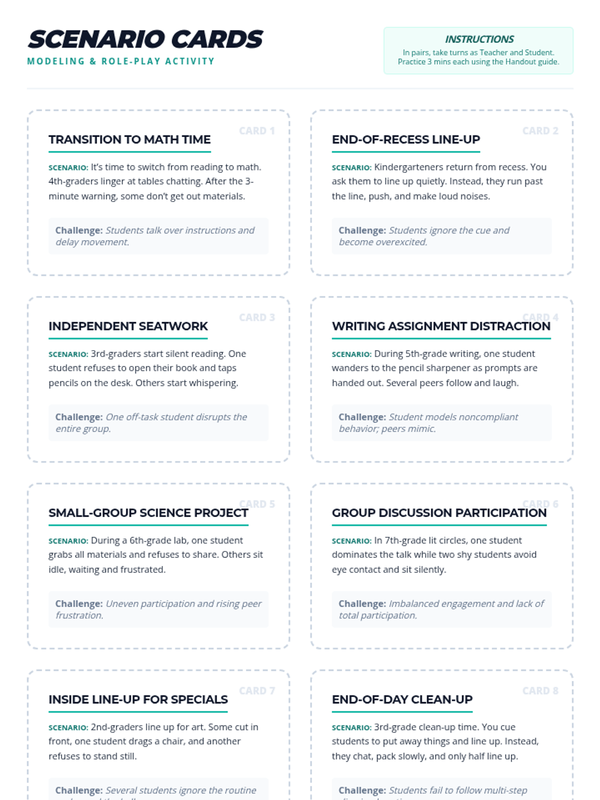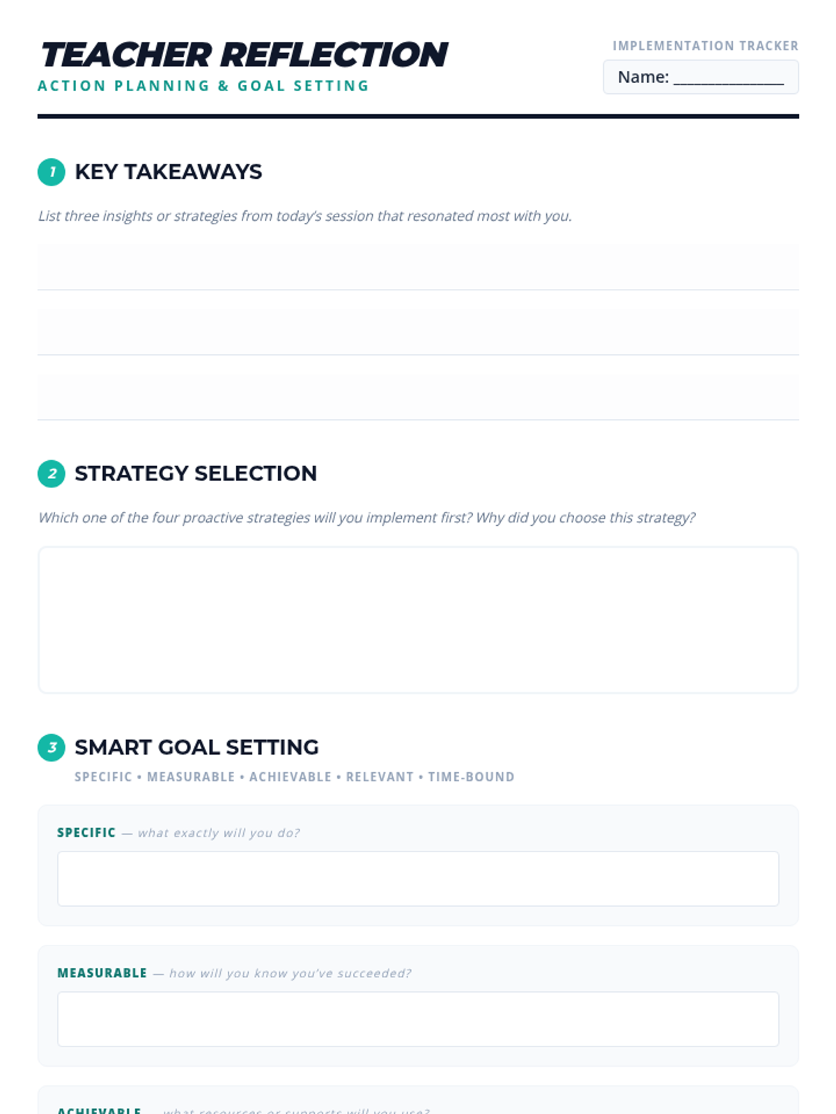 A 90-minute Tier 2 professional development session for K-12 teachers focusing on evidence-based proactive strategies to improve student compliance and engagement. Teachers will practice modeling, role-play, and action planning to support students struggling with classroom routines.