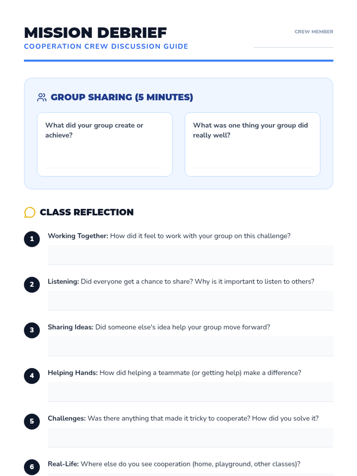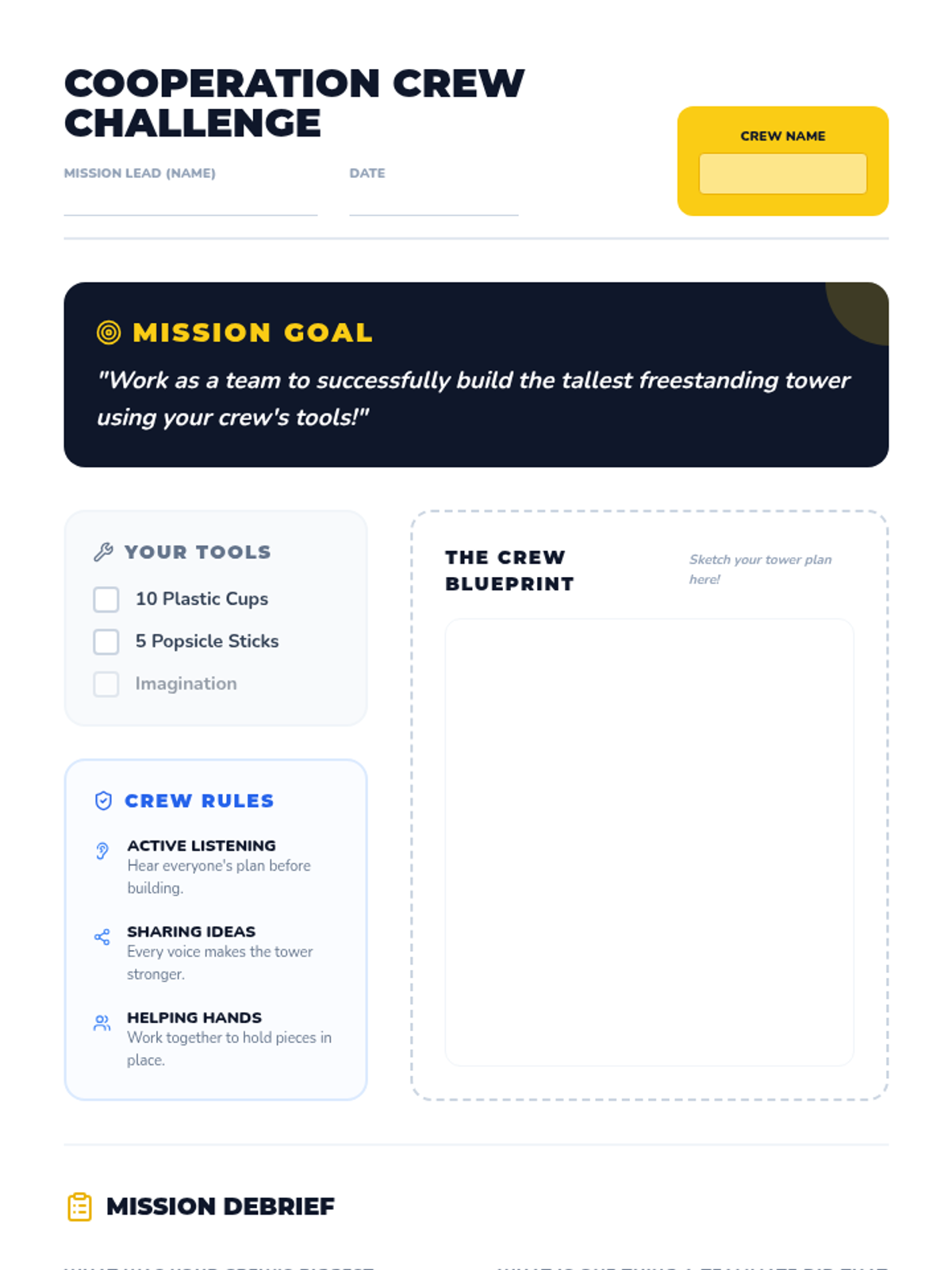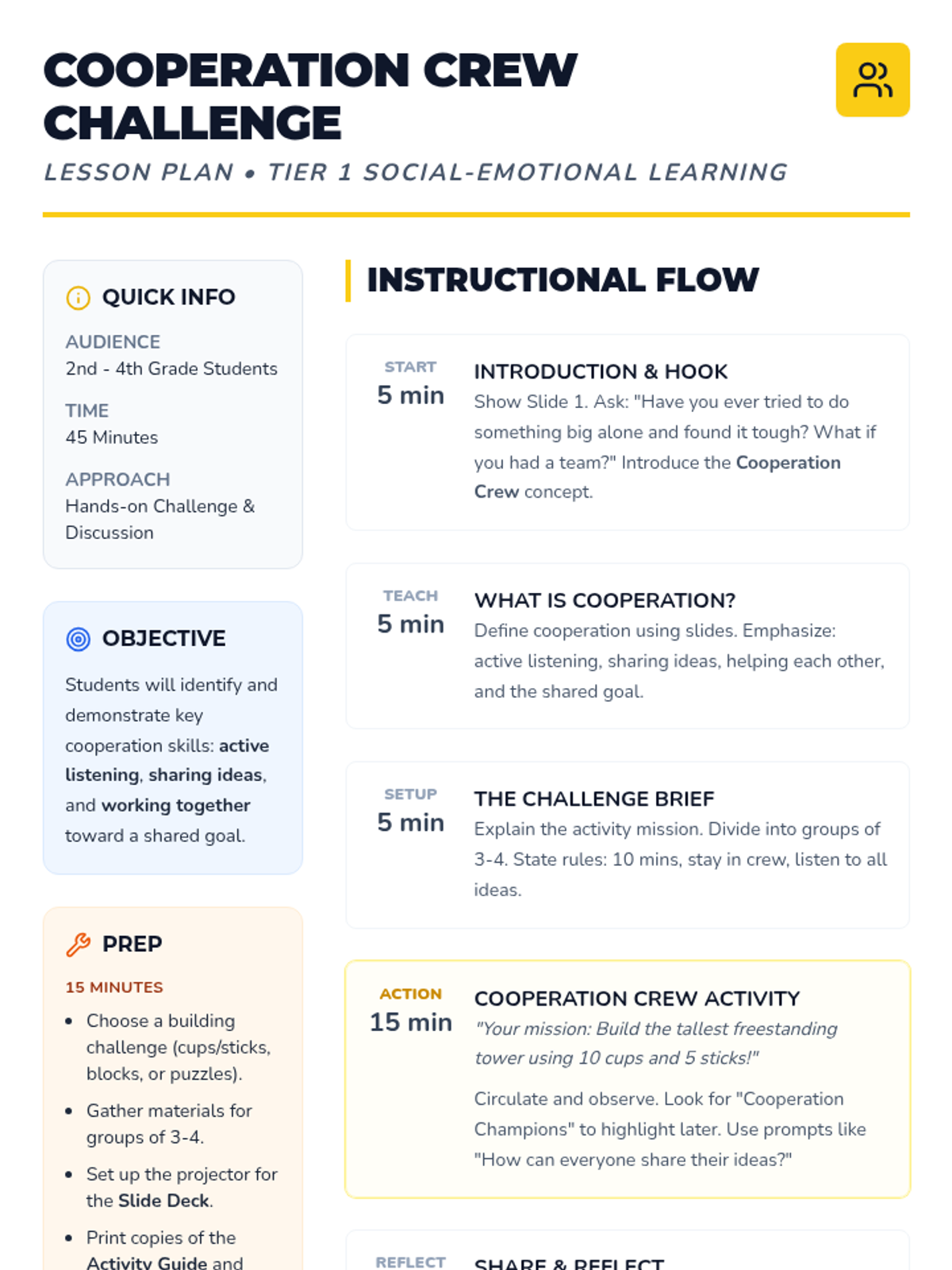 A 45-minute interactive lesson for 2nd-4th graders focused on developing essential teamwork skills through a hands-on group building challenge and guided reflection.