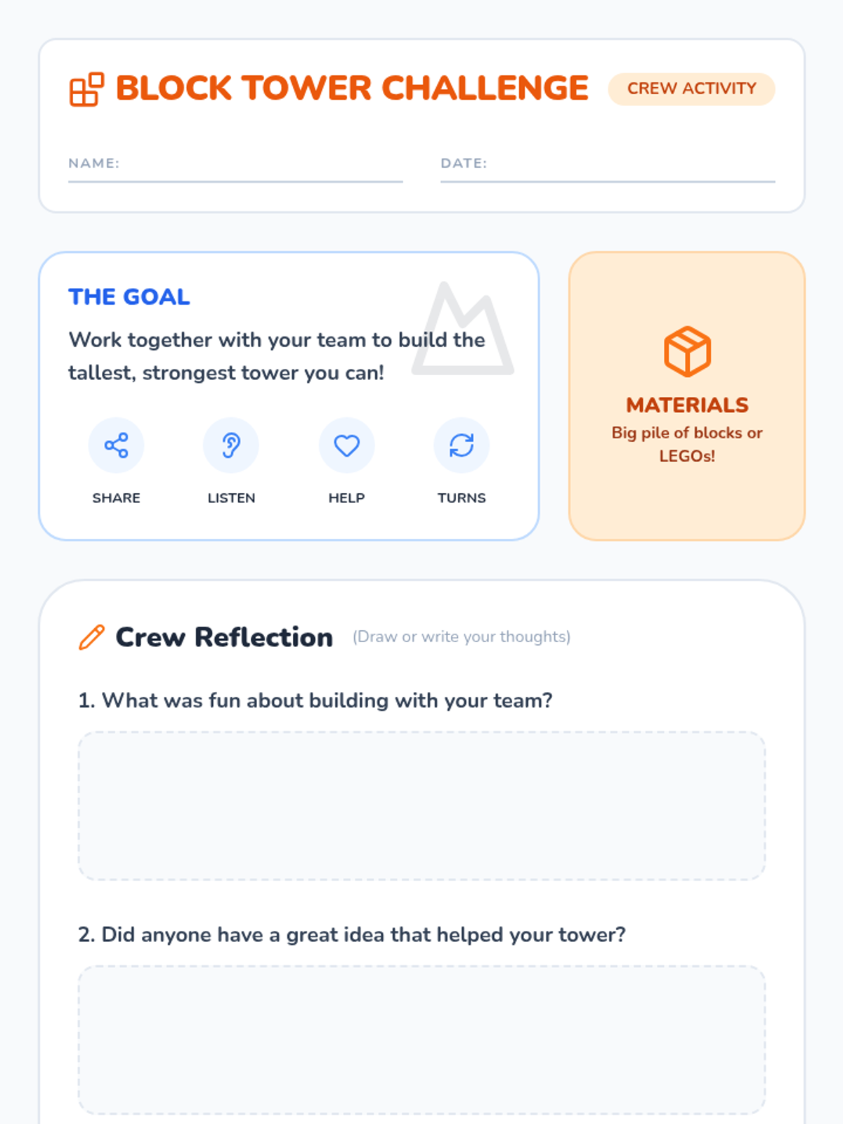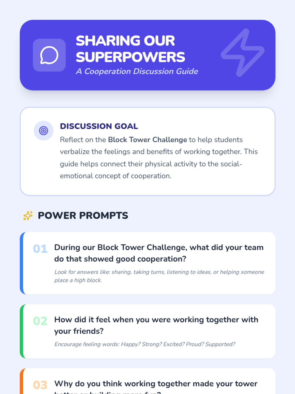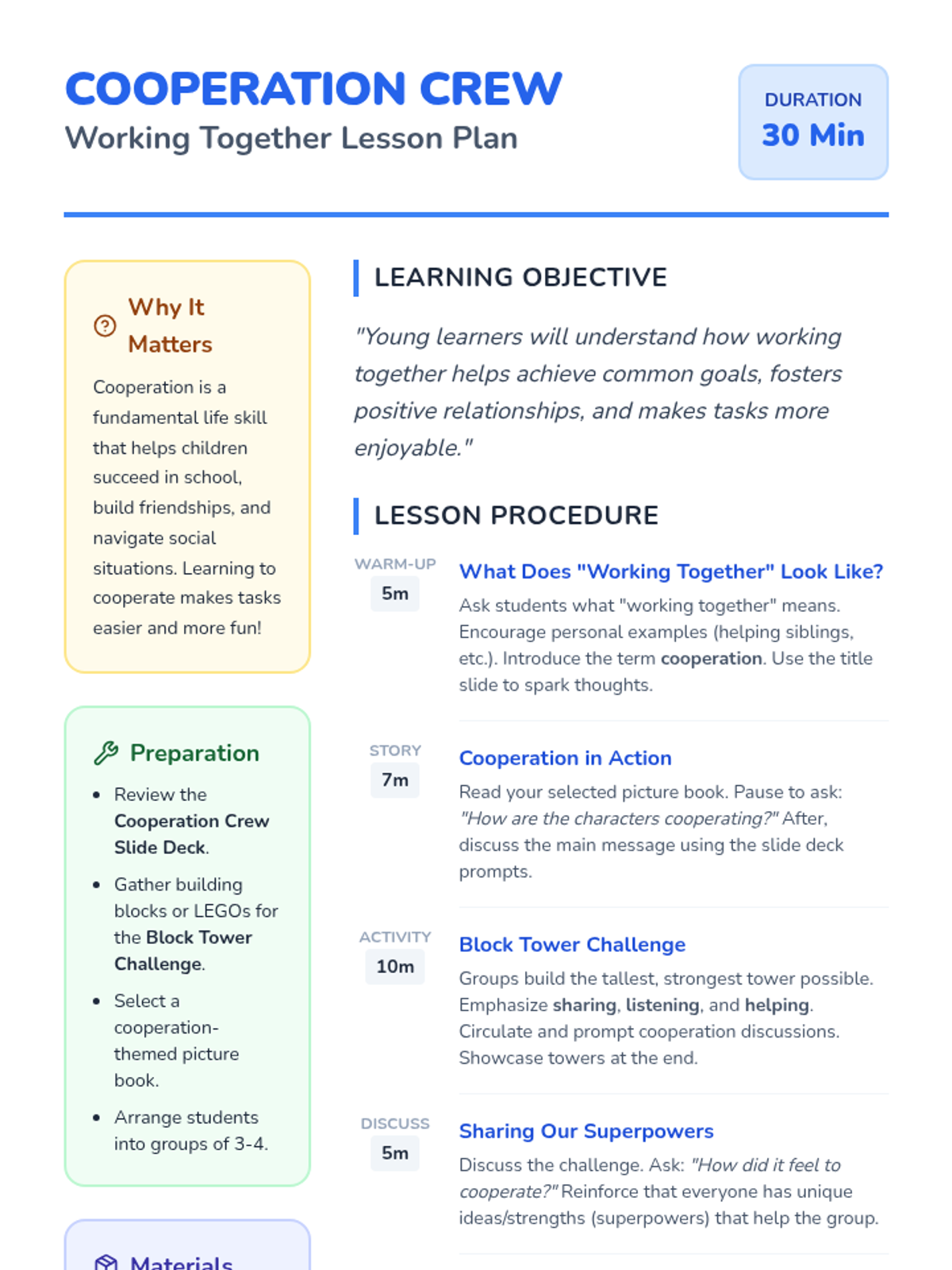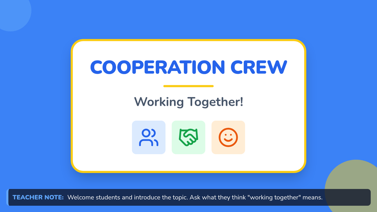 A fun, interactive lesson for Pre-K to 1st grade students to learn the value of cooperation through storytelling, group challenges, and reflection. Students will discover how sharing, listening, and working together makes tasks easier and more enjoyable.