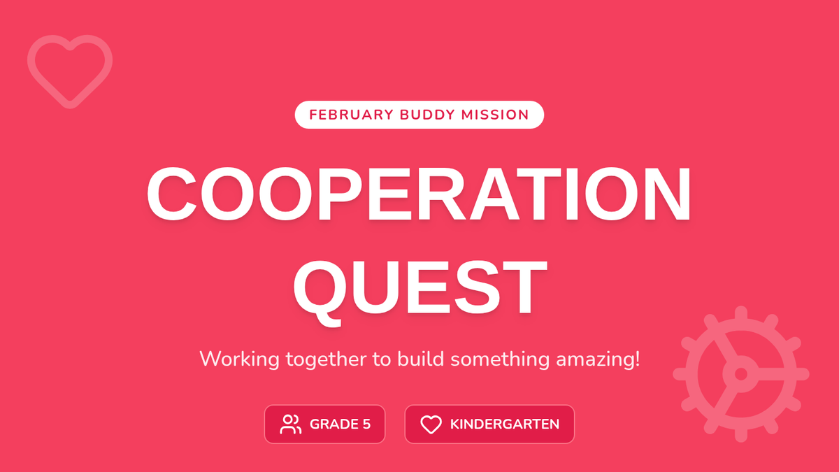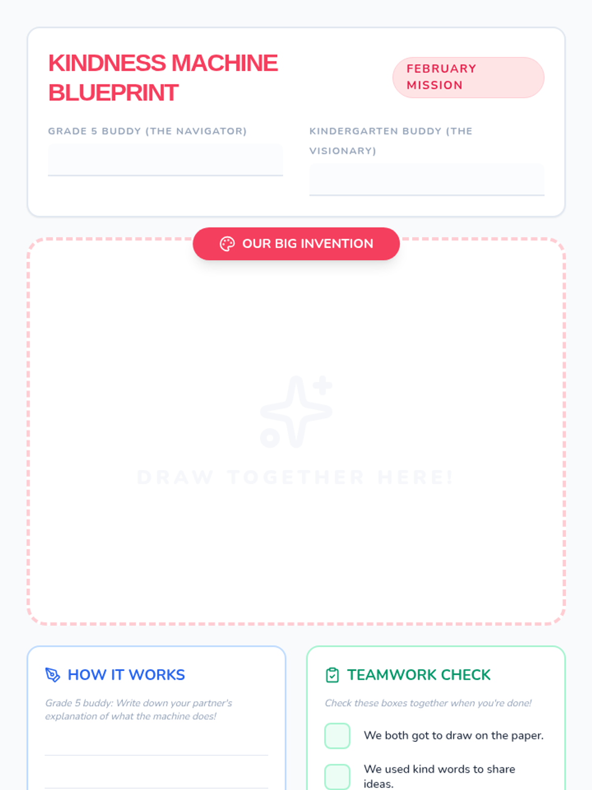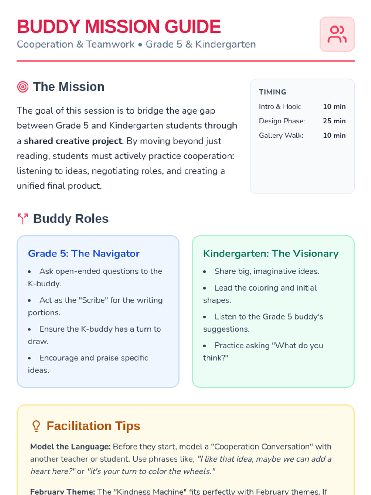 A collaborative lesson for Grade 5 and Kindergarten 'reading buddies' focused on building cooperation skills through a shared creative design challenge. Buddies will work together to invent a 'Kindness Machine,' practicing listening, turn-taking, and shared decision-making.