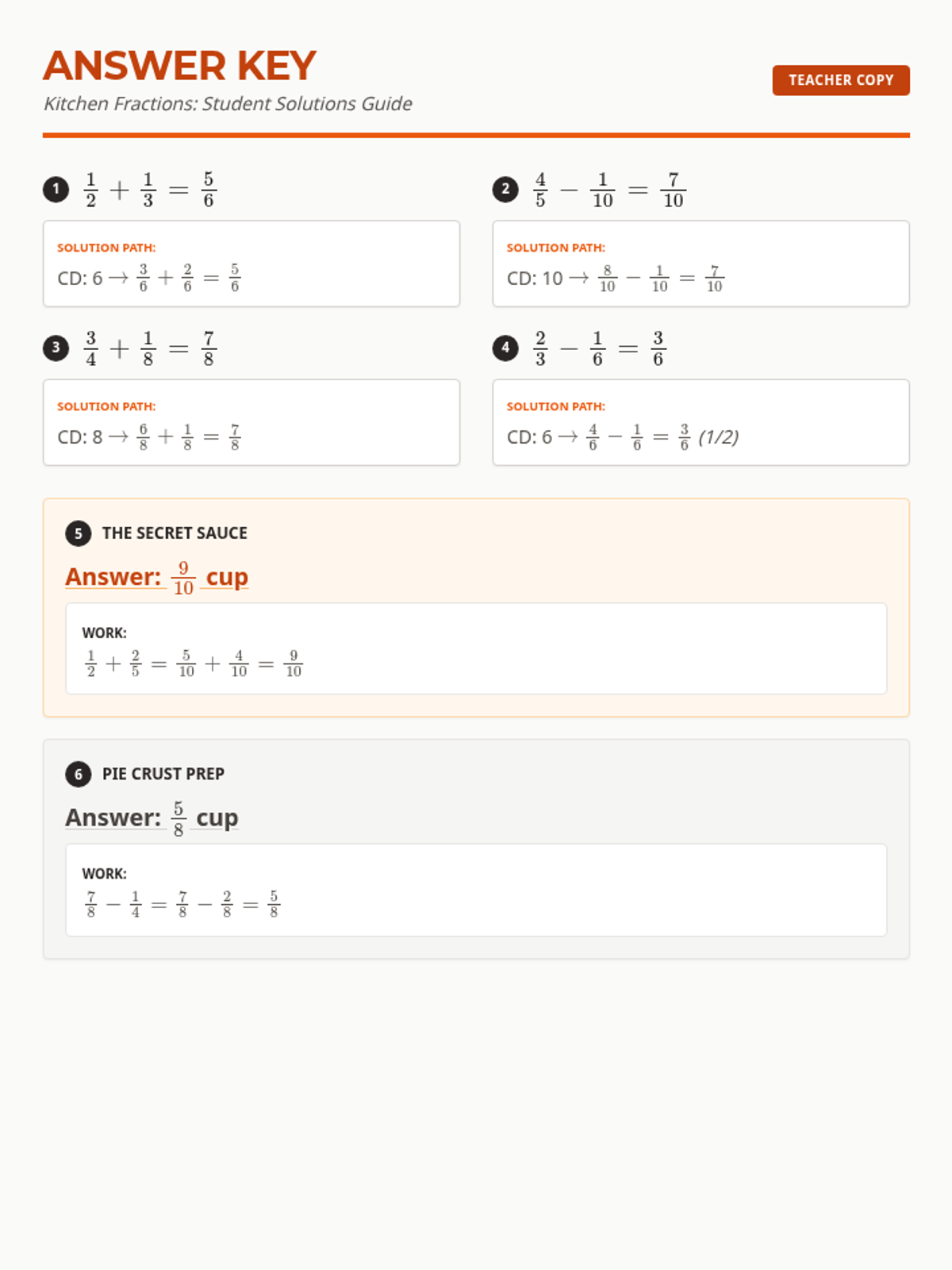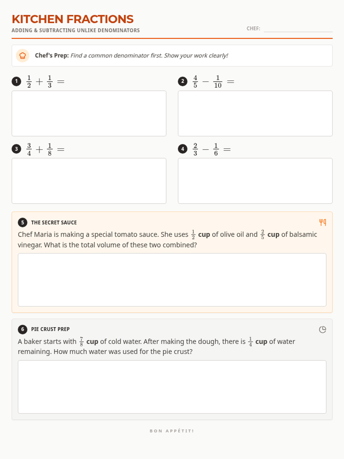 A 5th-grade math lesson on adding and subtracting fractions with unlike denominators, themed around cooking and kitchen measurements.