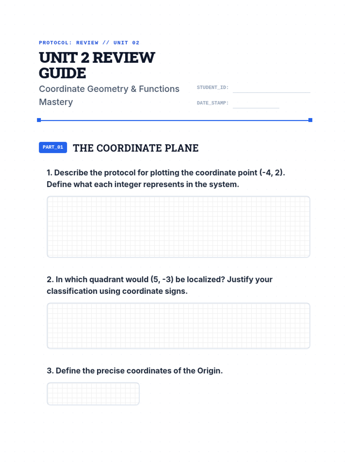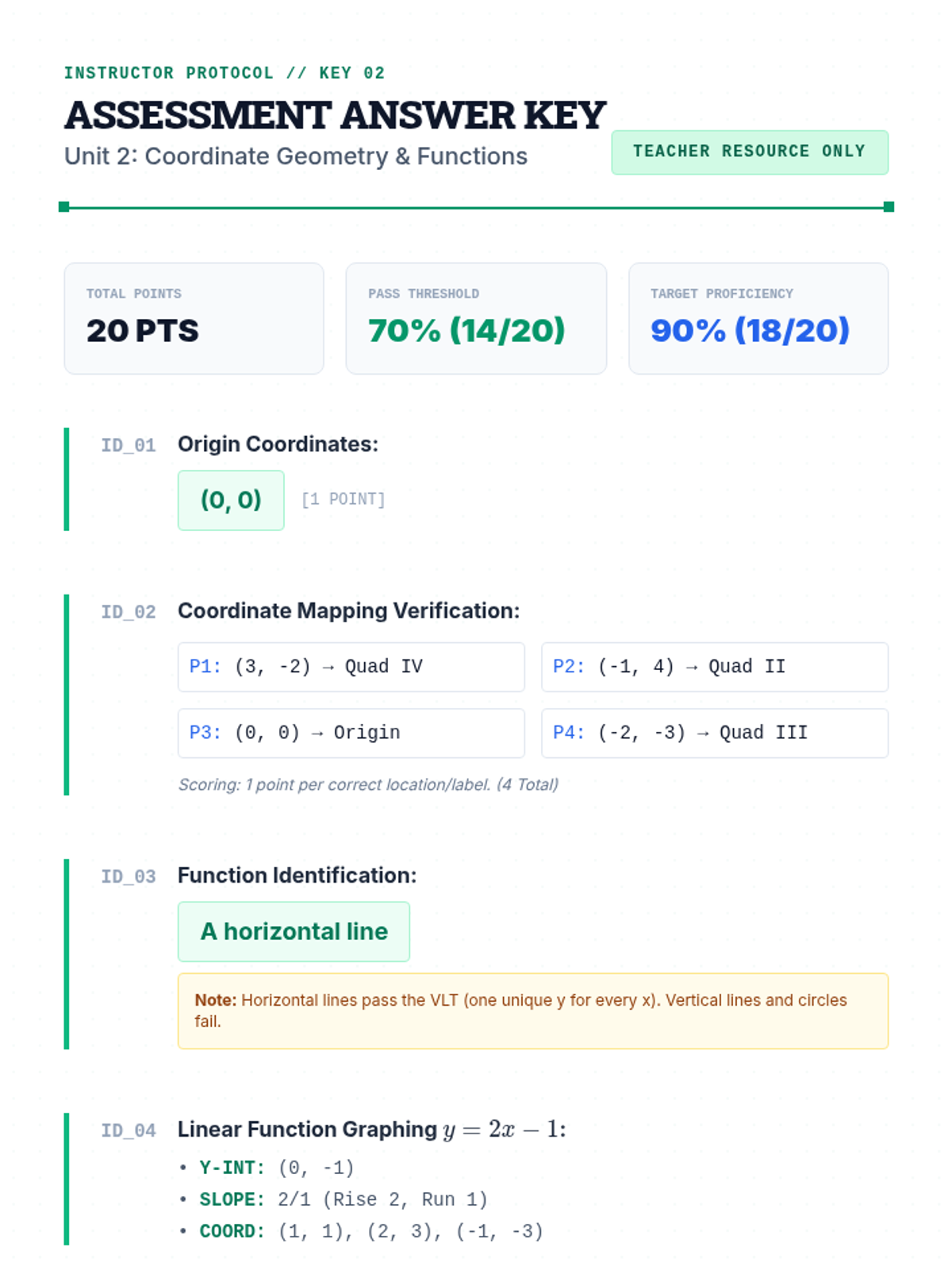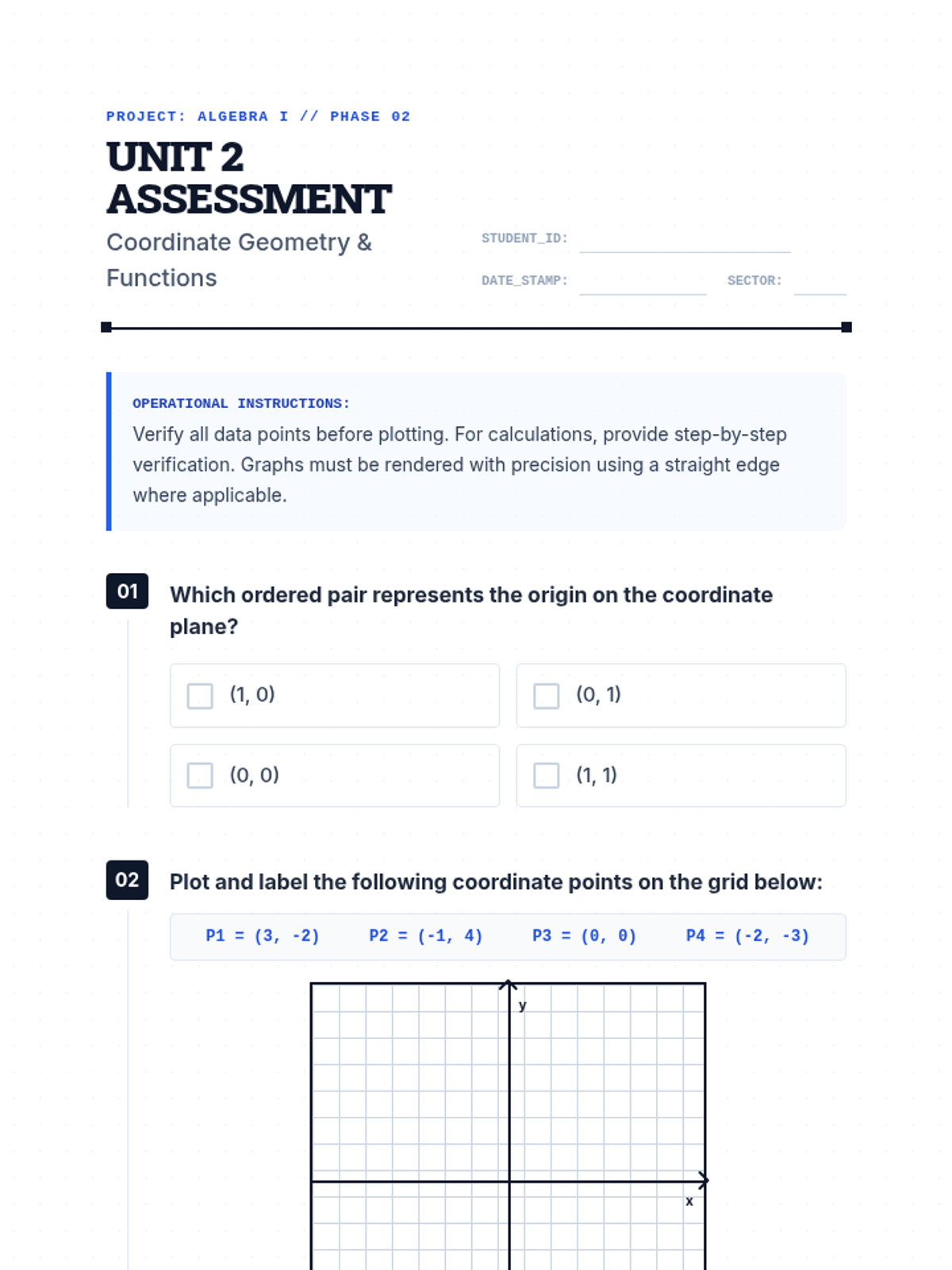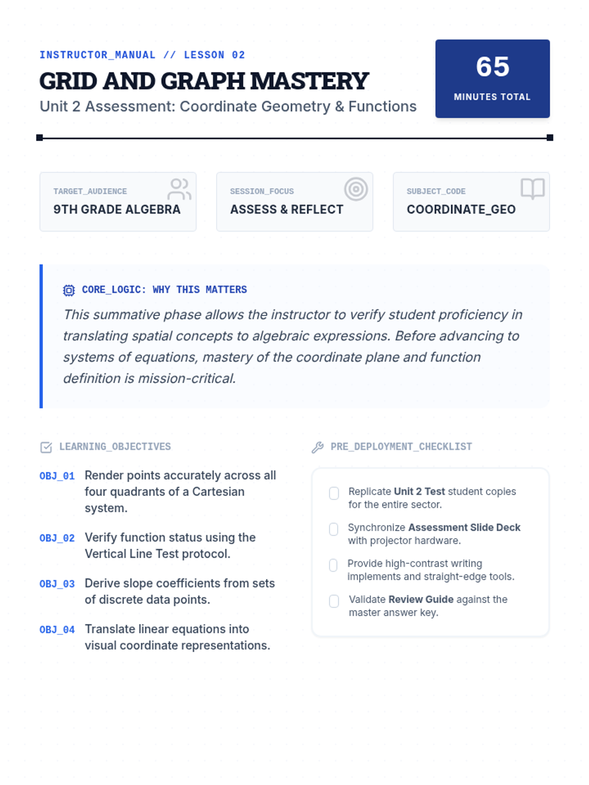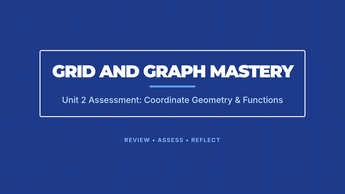 A comprehensive 9th-grade assessment lesson covering coordinate geometry, functions, slope, and graph interpretation through review, testing, and reflection.