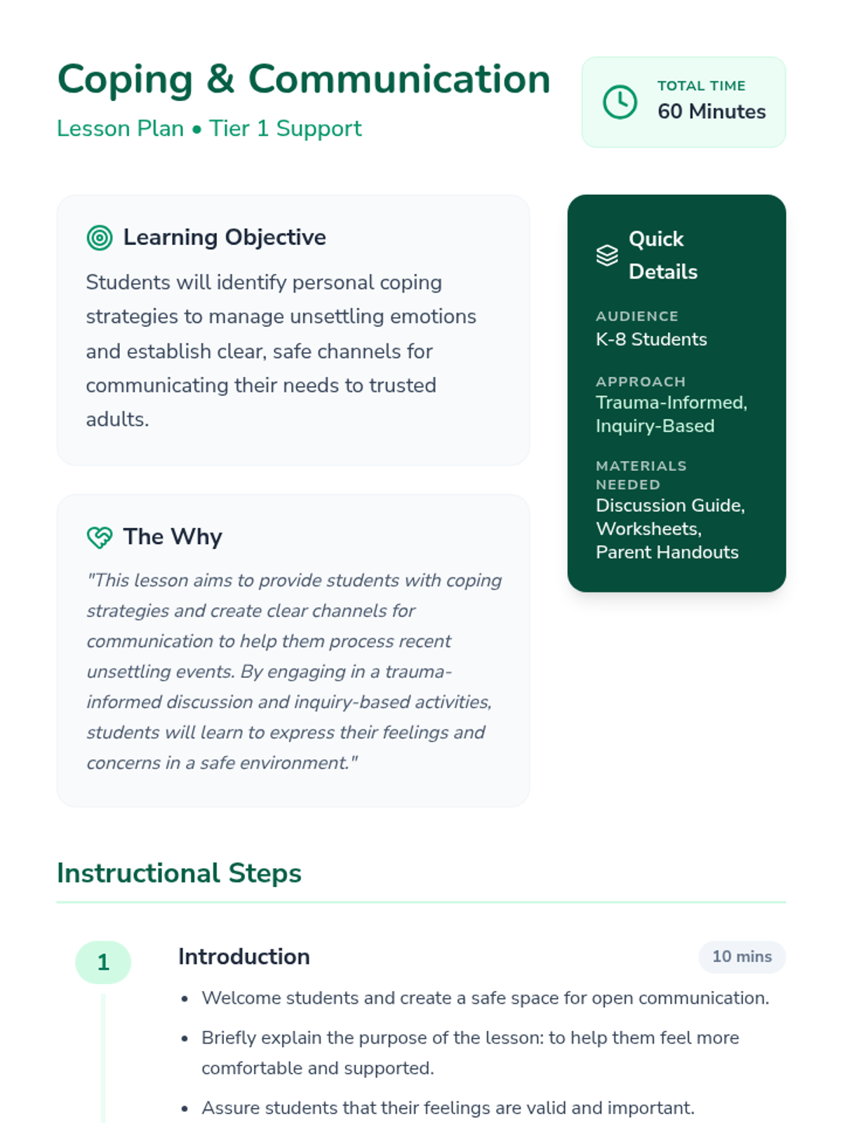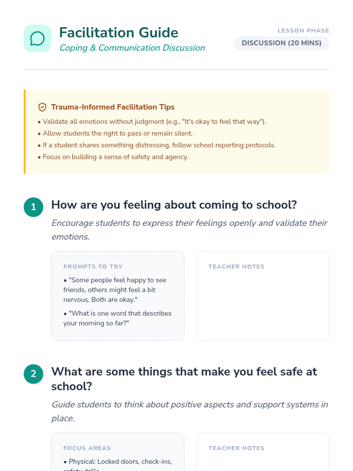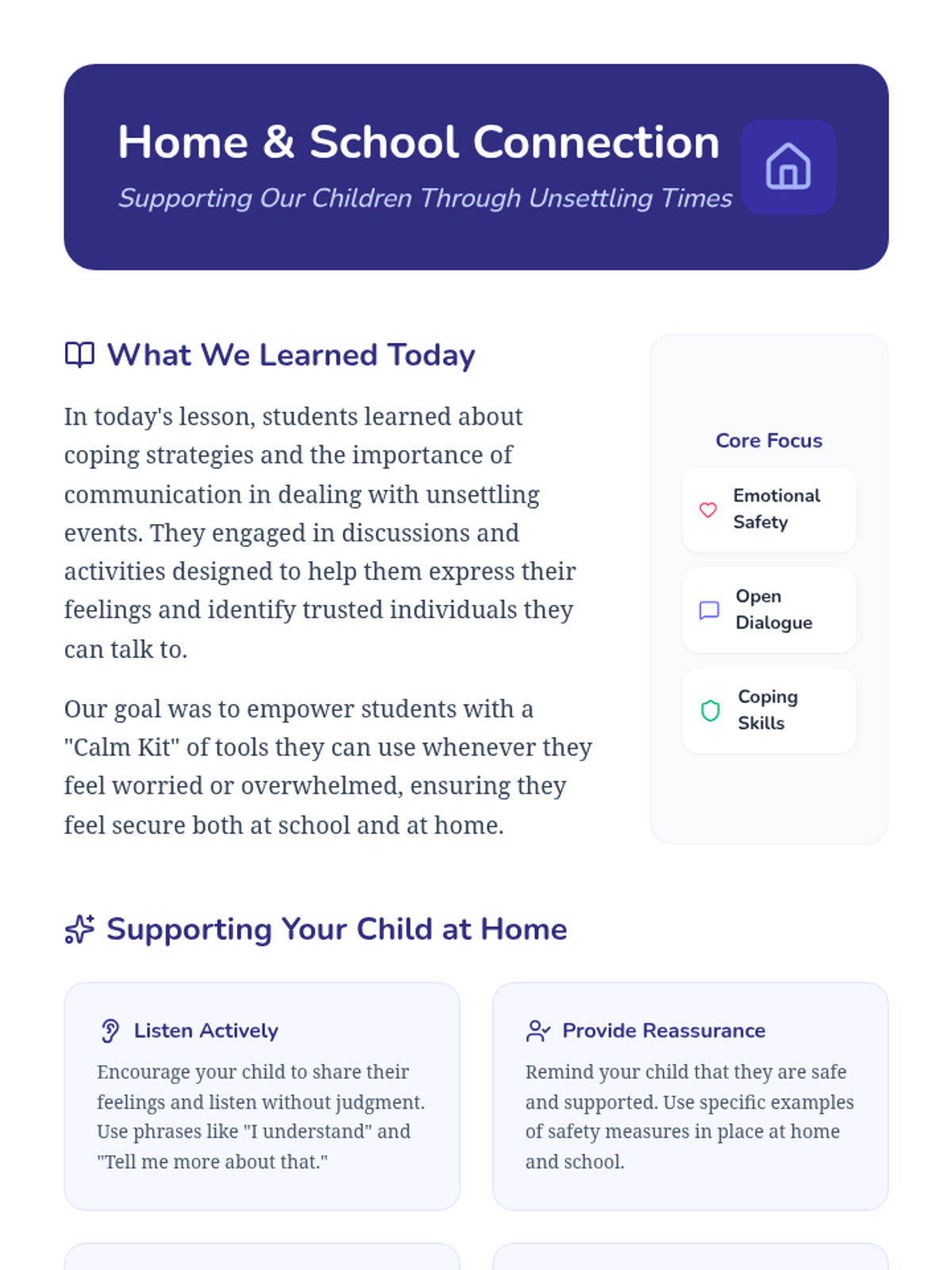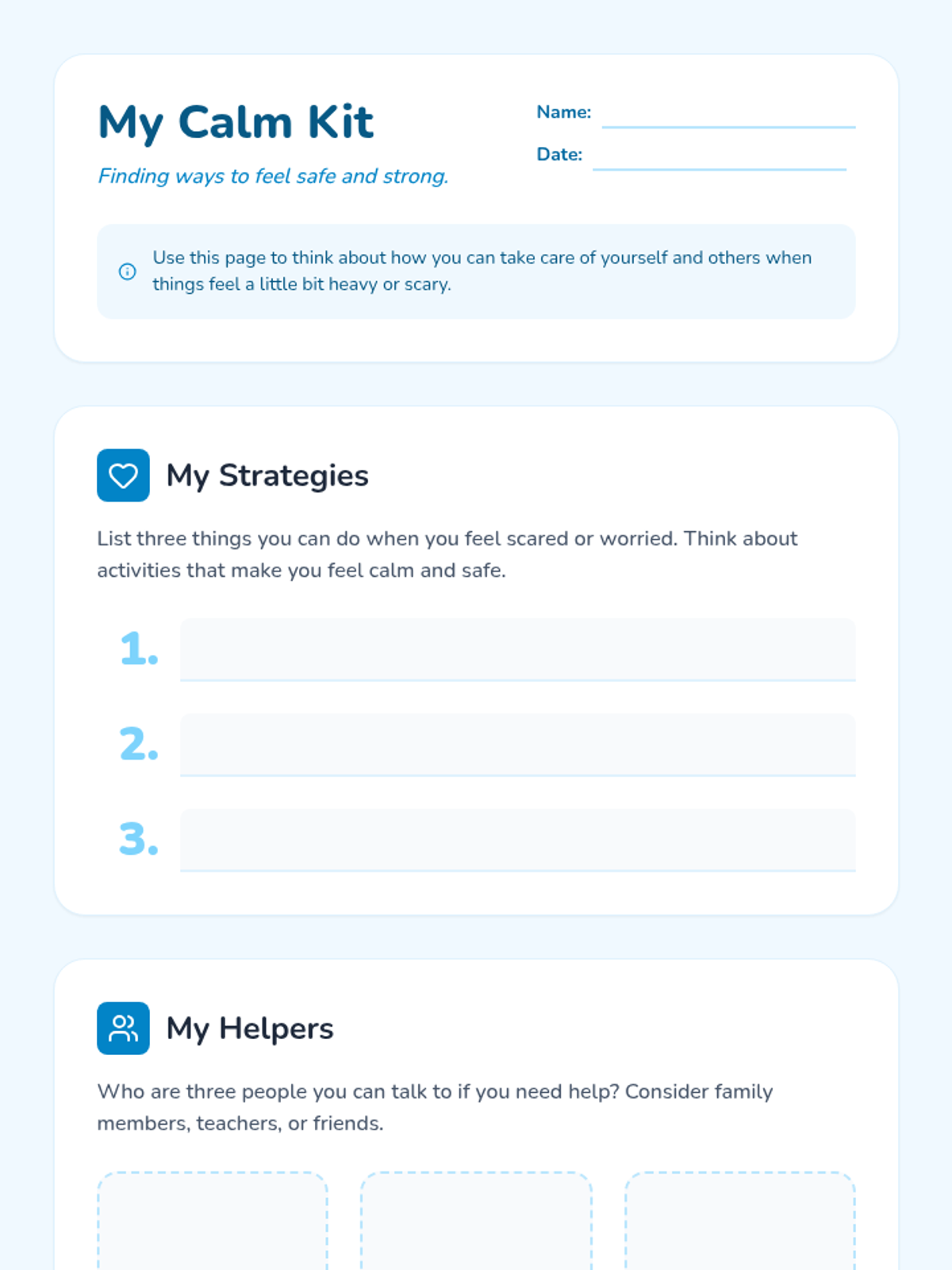 A trauma-informed lesson designed to help students identify coping strategies and establish safe communication channels after unsettling events. Students explore their feelings, identify support systems, and develop a 'calm kit' of personal strategies.