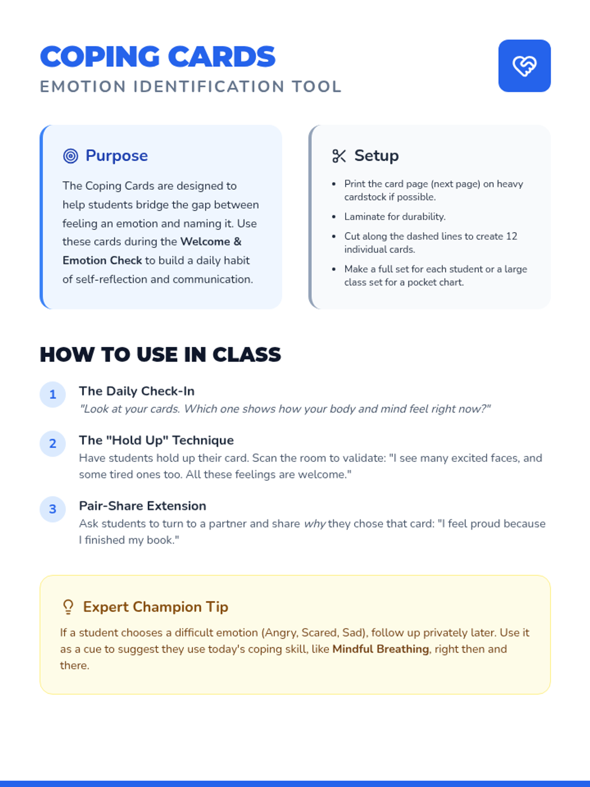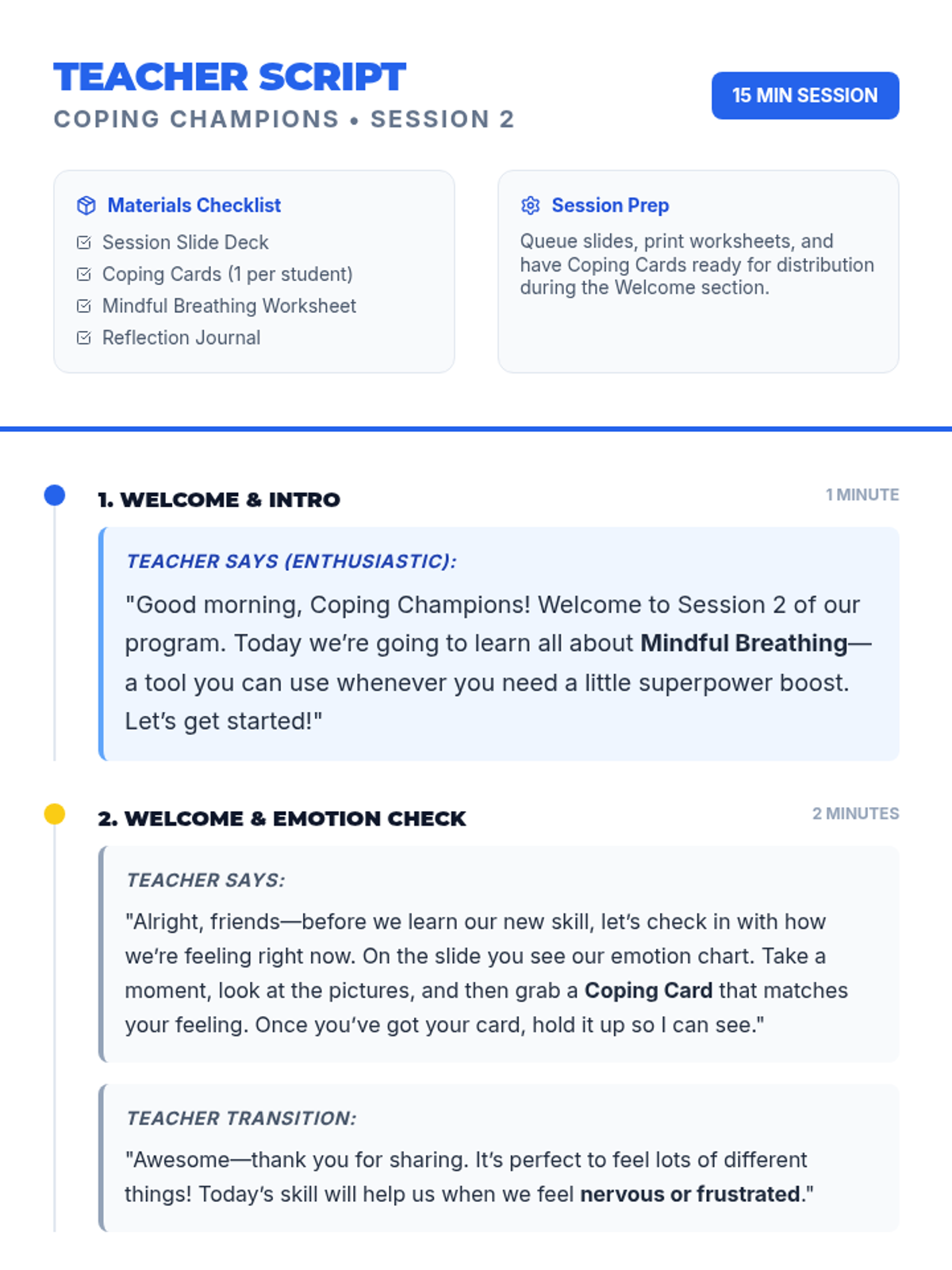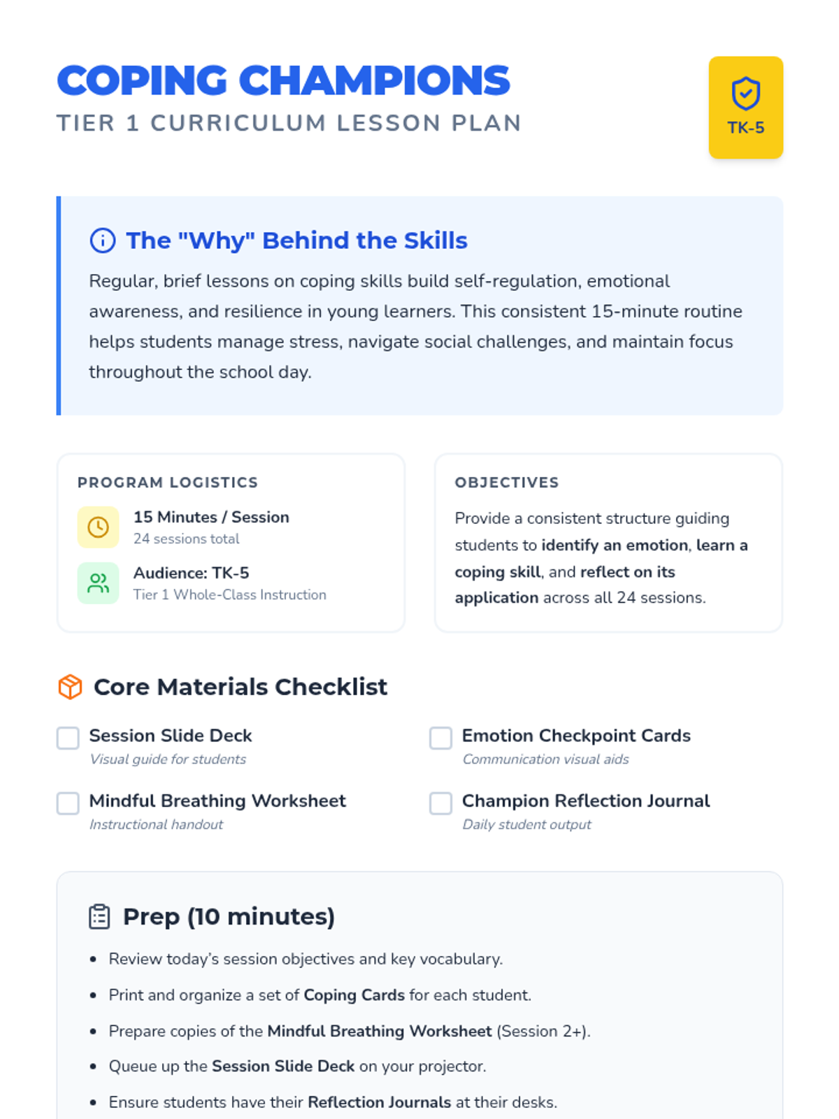 A 24-session series for TK-5 students to build essential coping skills, recognize emotions, and practice self-regulation through interactive daily routines.