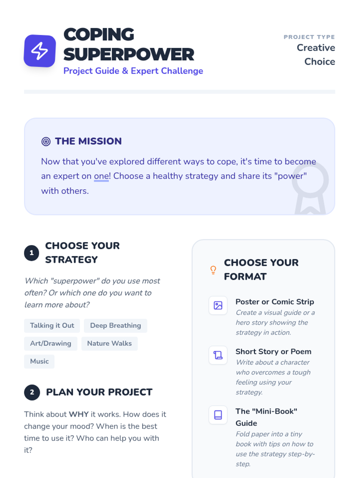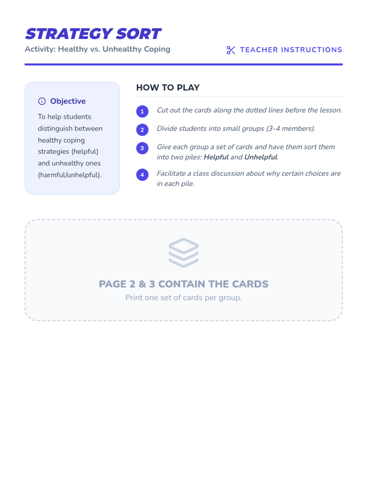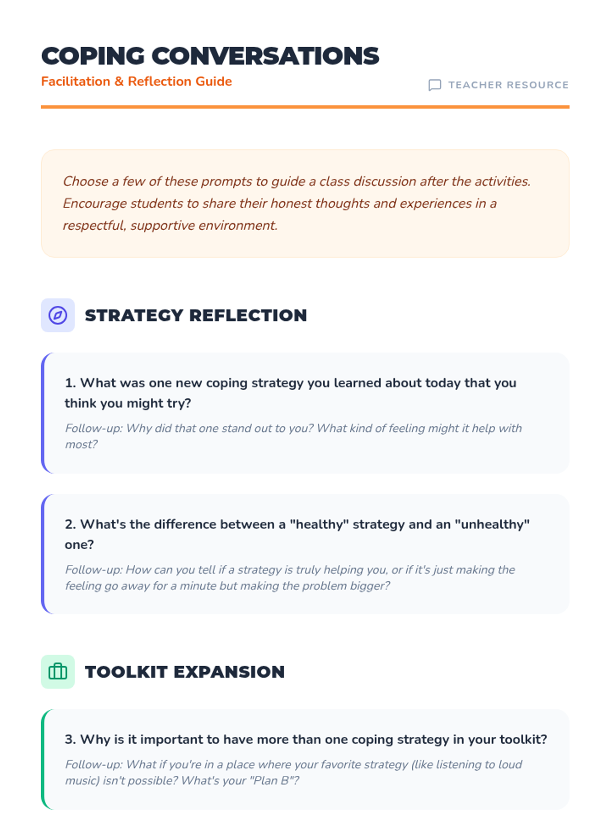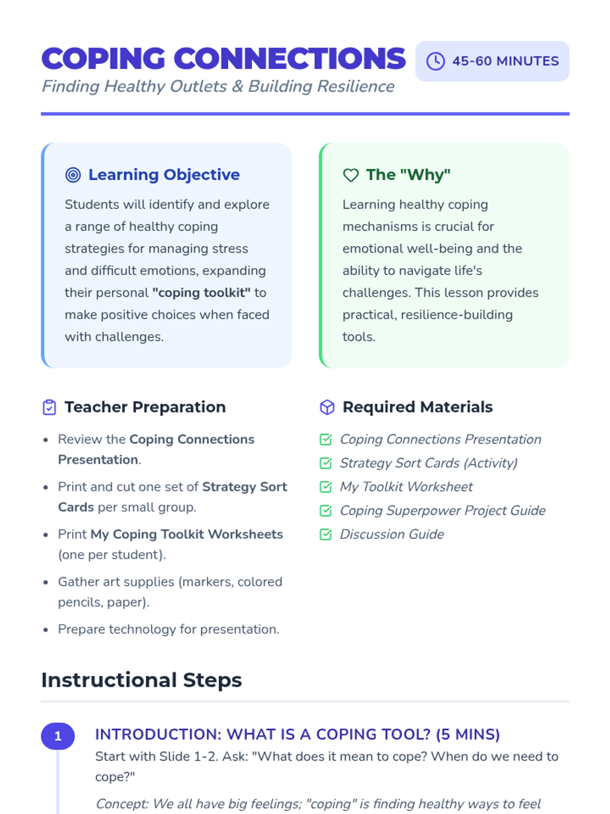 A 45-60 minute lesson for elementary and middle school students to identify and explore healthy coping strategies for managing stress and difficult emotions through interactive activities and creative expression.